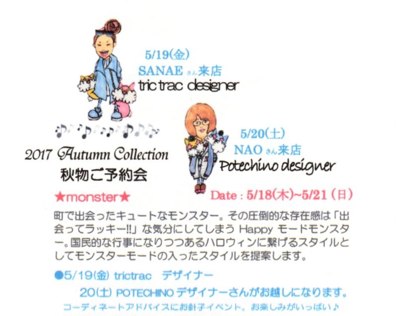 秋物ご予約会のご案内 2017年05月19日 尾道ポテチーノ店内でただ今秋物ご予約会を開催中です。本日のゲスト トリックトラック のデザイナー SANAE san明日のゲスト ポテチーノのデザイナー NAO sanお近くにお越しの際は是非お越しくださいね。皆様のご来店楽しみにお待ちしております。 «前 次» NEWS