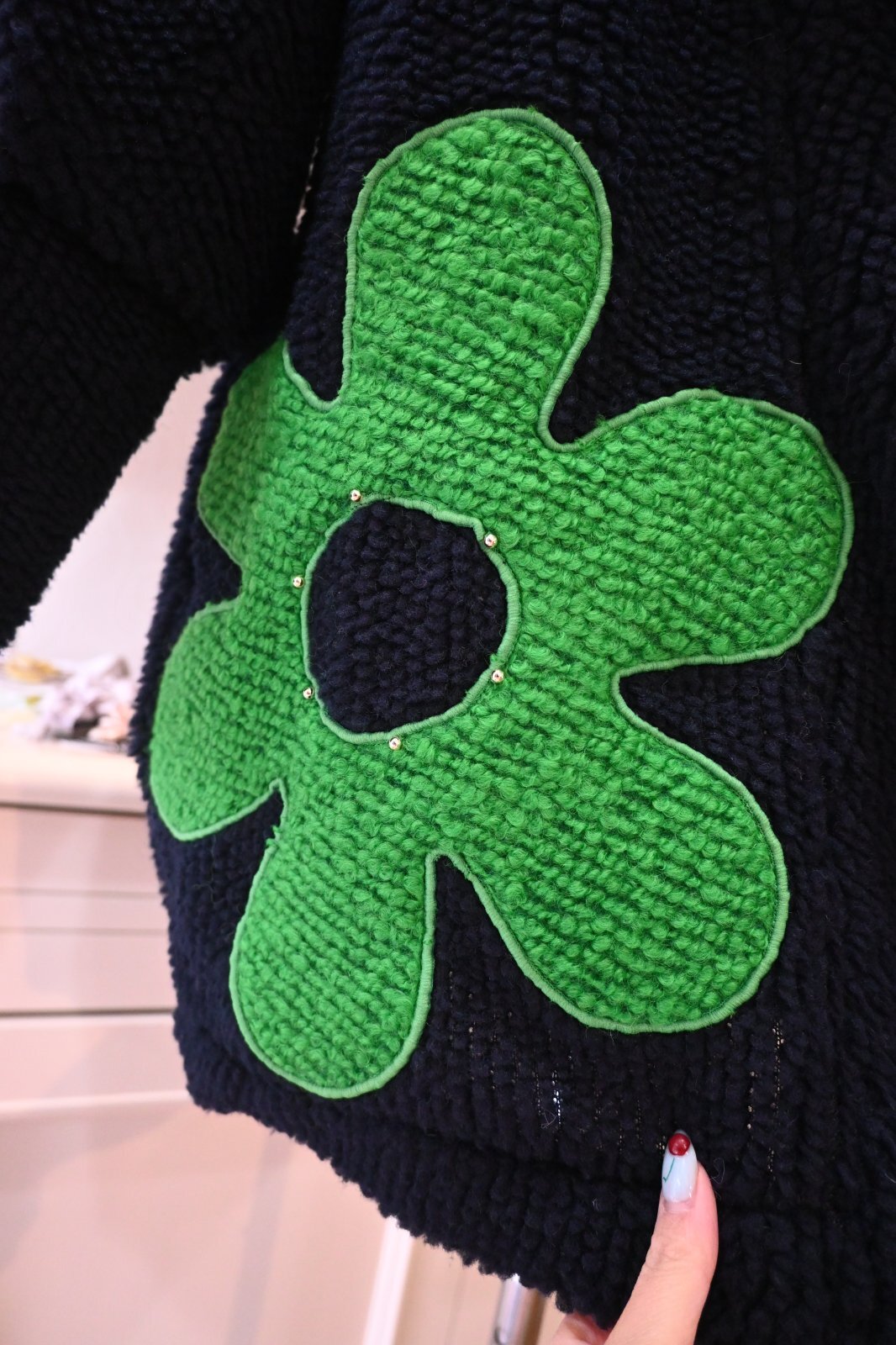 POTECHINO(ポテチーノ)軽くて暖かなプードル生地を使用した1枚仕立てのコーディガン。立体的なツィードのポテネッタを大胆にあしらいました。