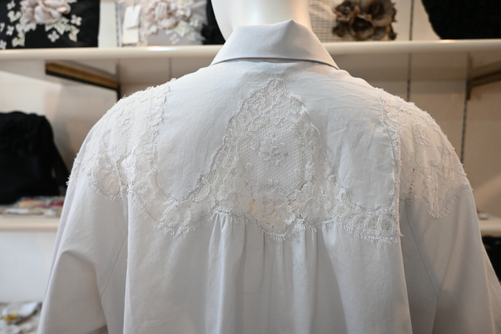 HISCHRONE(ヒスクローネ)ヨークにリバーレースをサークル状に透かして繊細に仕上げました。裏打ちにはコットンリバーネットを付けて透明感にバリエーションをもたらせています。