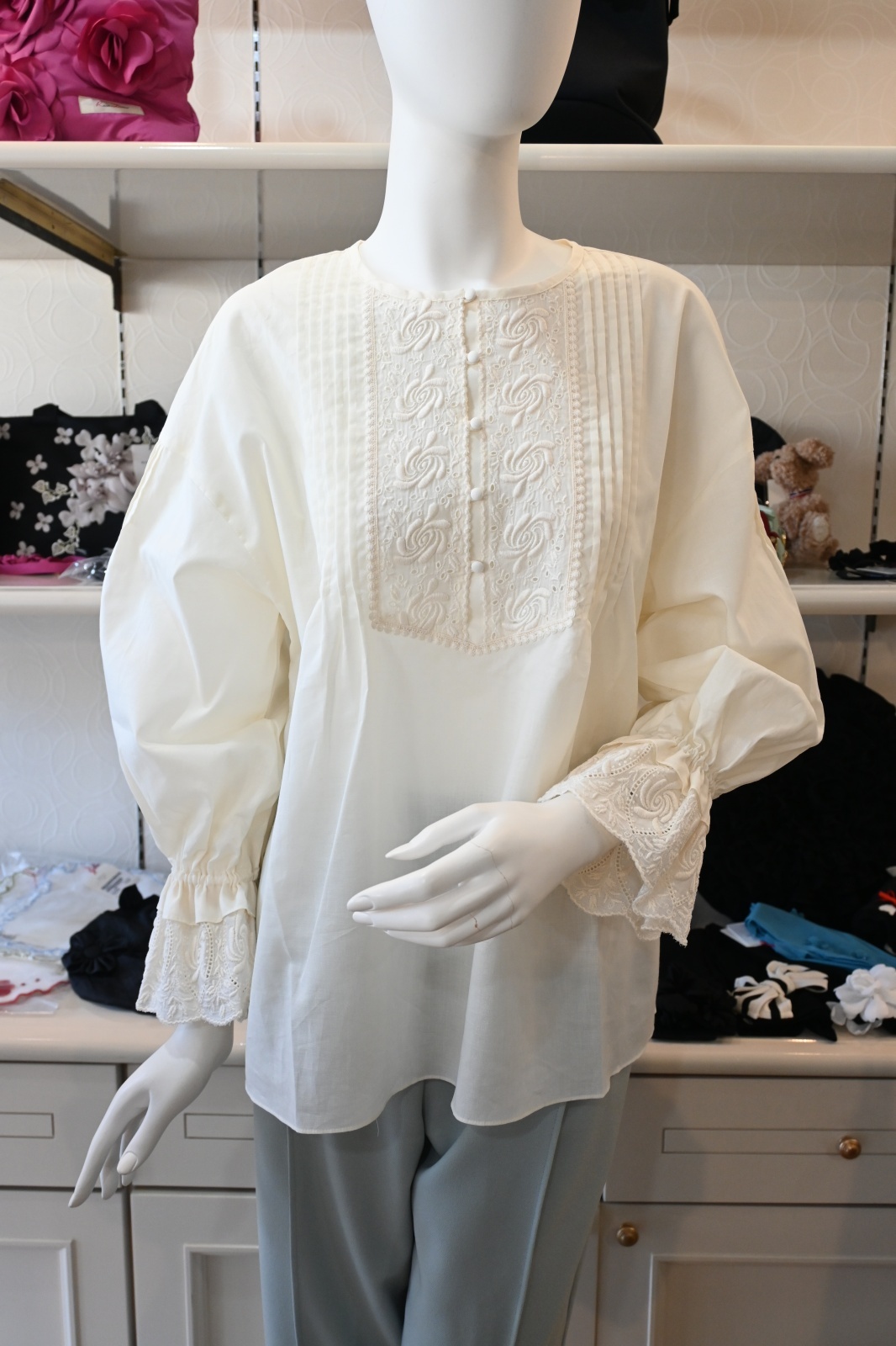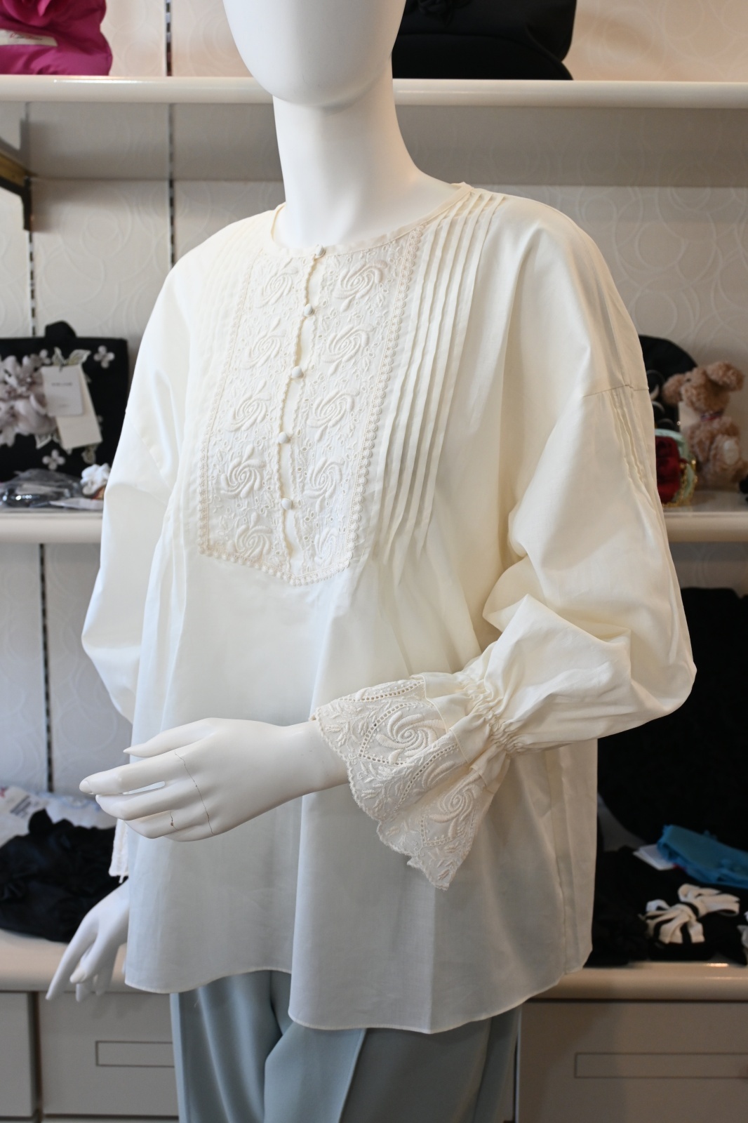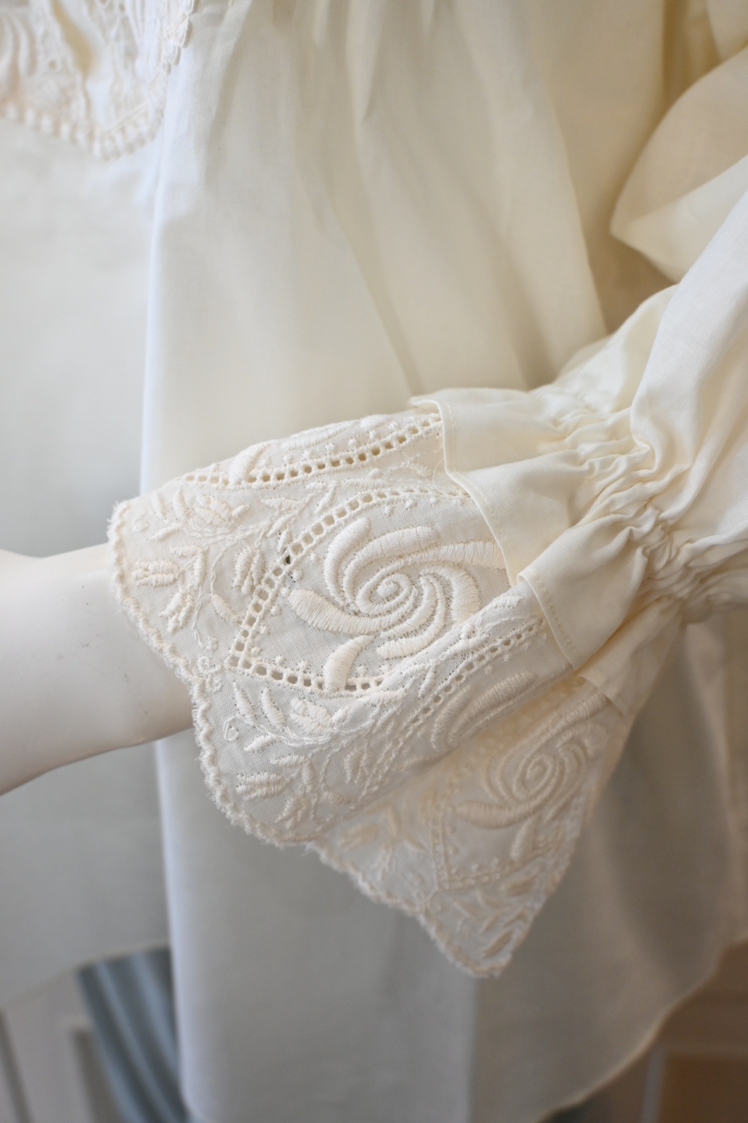 HISCHRONE(ヒスクローネ)今のレースでは見られない糸の盛り感と細かなポーラーのコットンレースを復刻しました。異なる透明感の組み合わせを意識したブラウスです。胡桃ボタンをつけていろんな綿の表情を楽しんで頂けます。