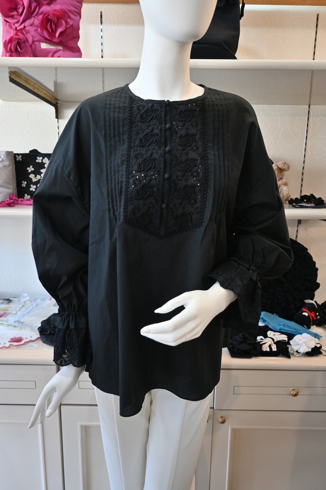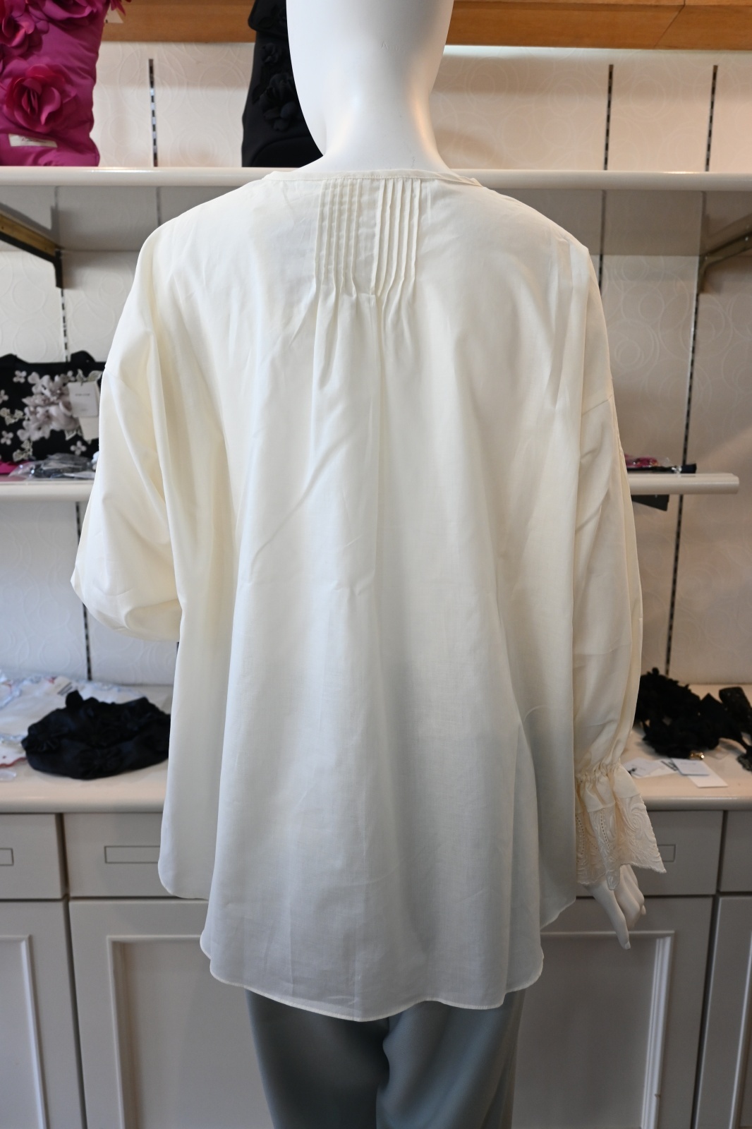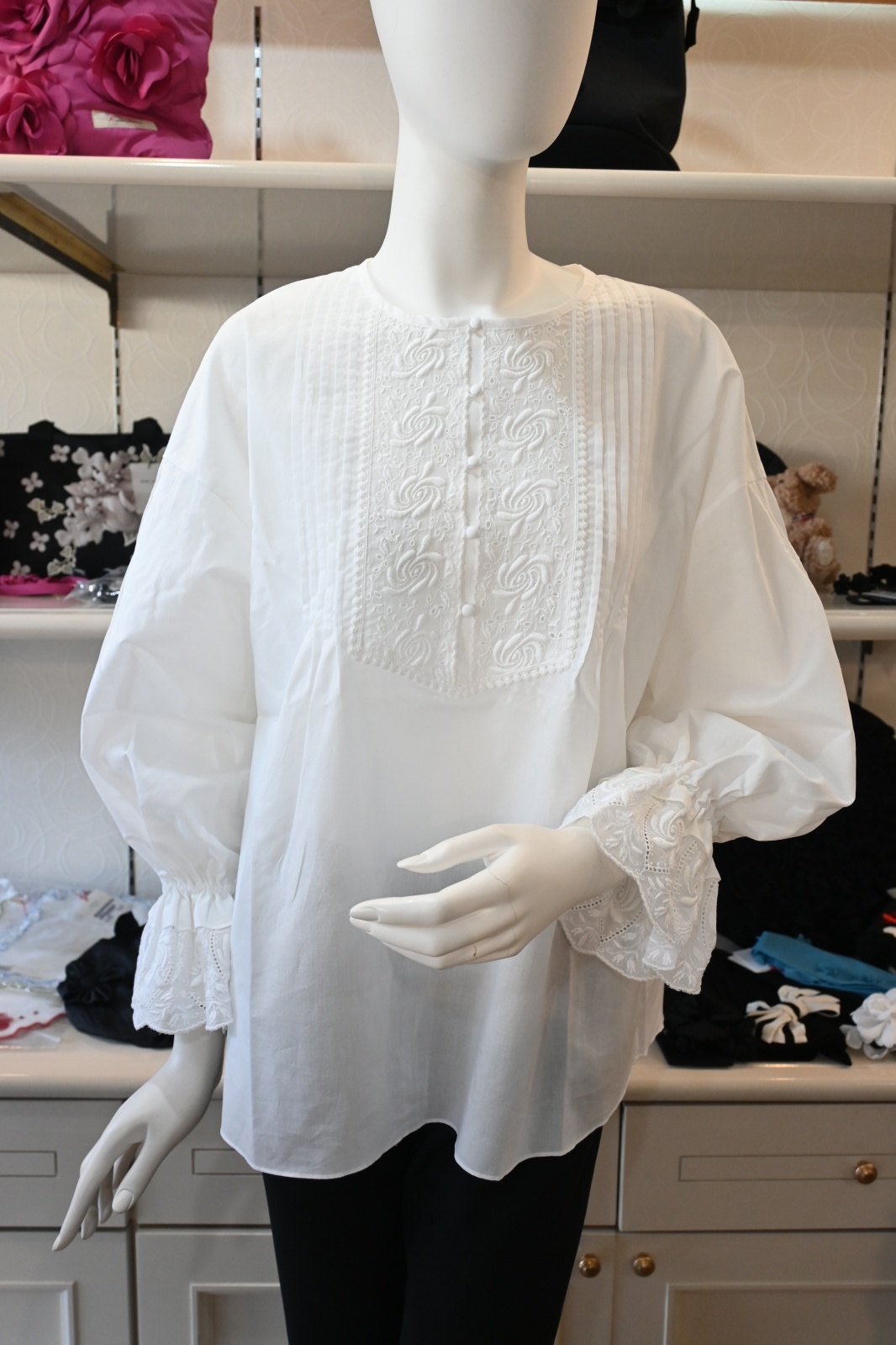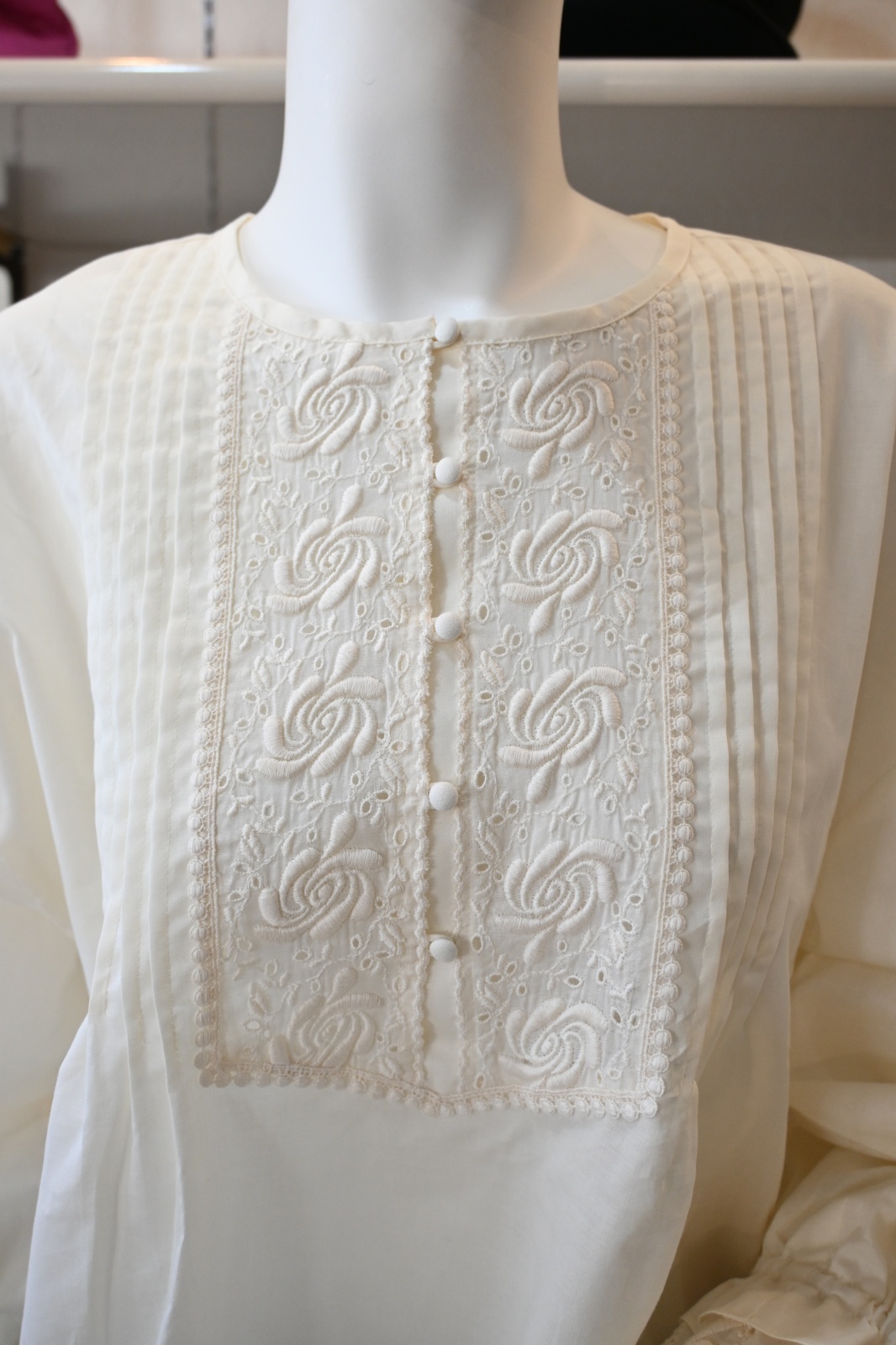 HISCHRONE(ヒスクローネ)今のレースでは見られない糸の盛り感と細かなポーラーのコットンレースを復刻しました。異なる透明感の組み合わせを意識したブラウスです。胡桃ボタンをつけていろんな綿の表情を楽しんで頂けます。