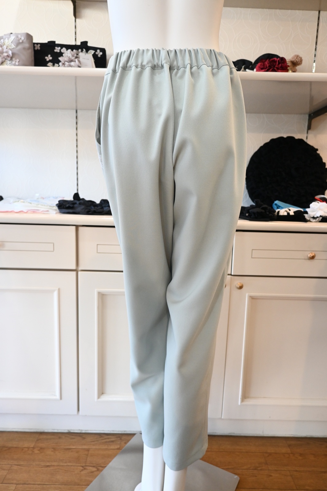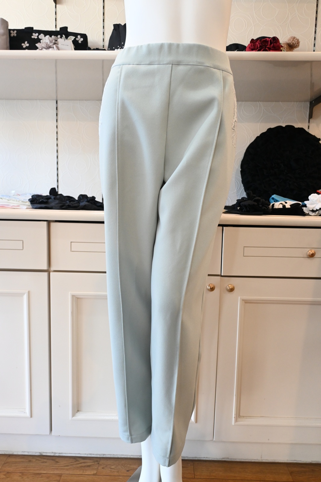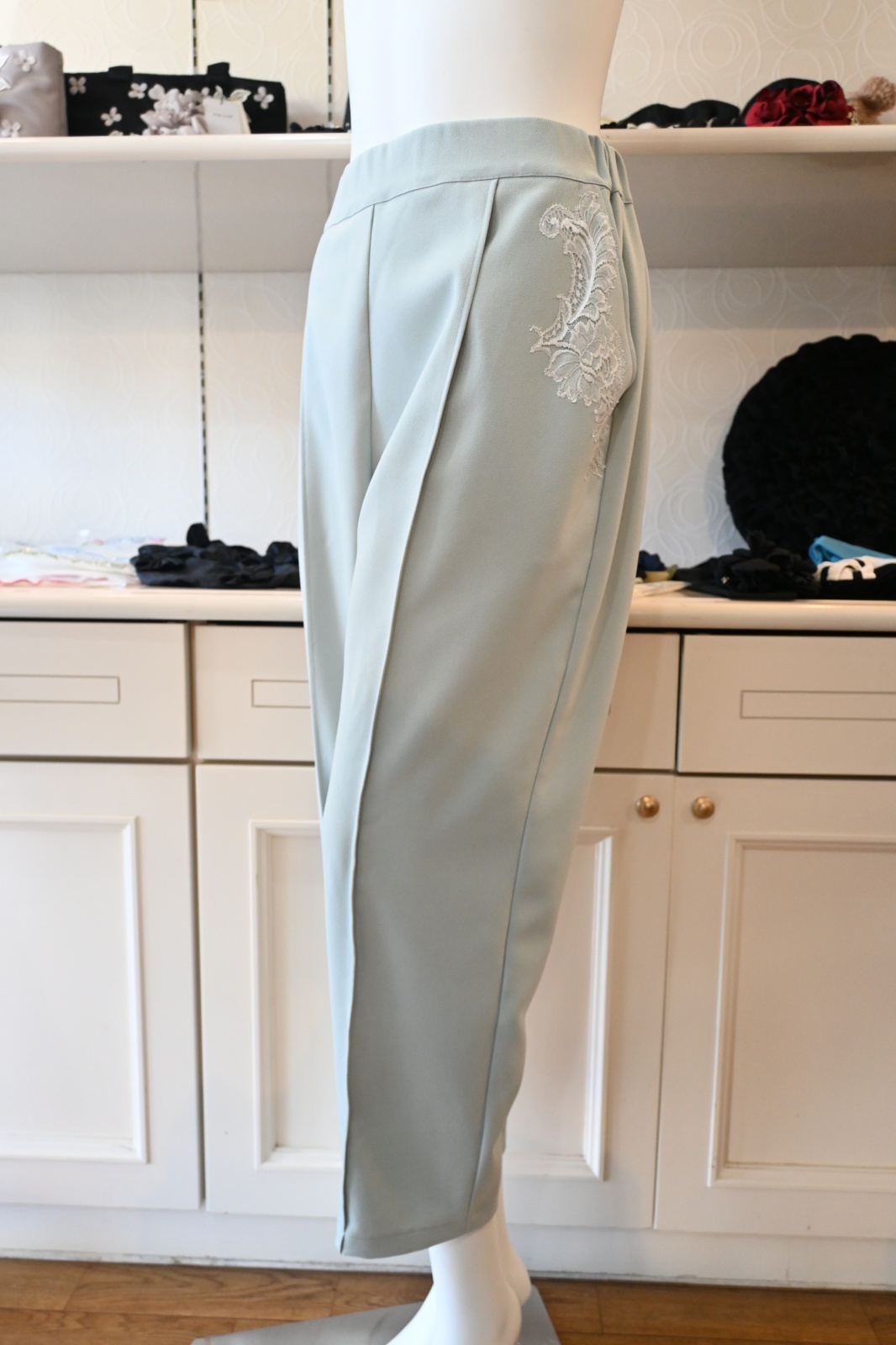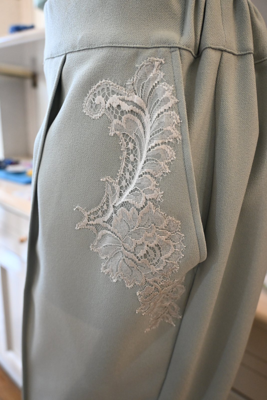 HISCHRONE(ヒスクローネ)腰回りがゆったりしたテーパードパンツです。流れるような筆染めをリバーレースにあしらいポイントにしました。