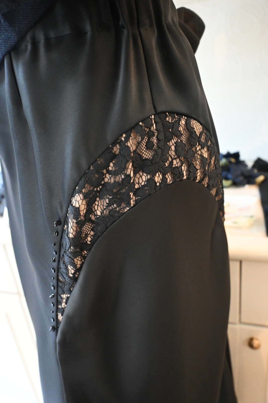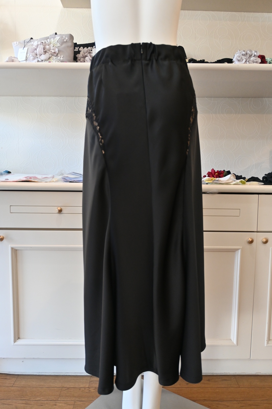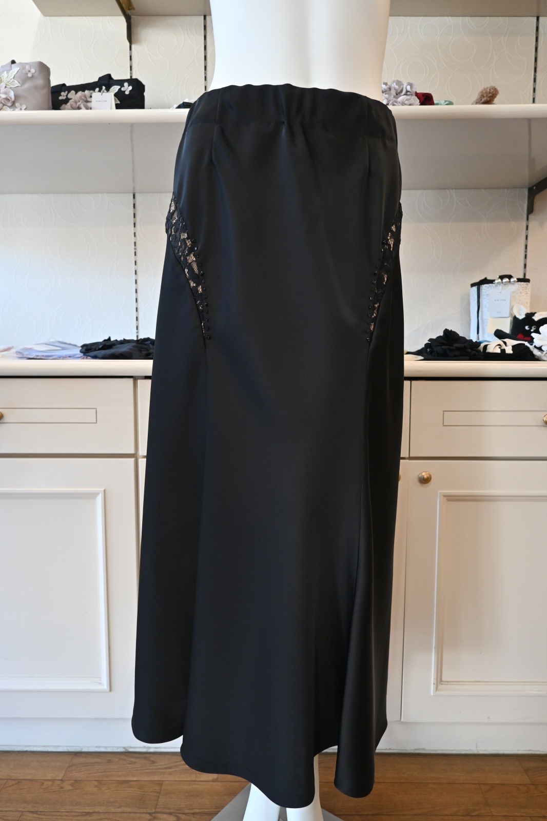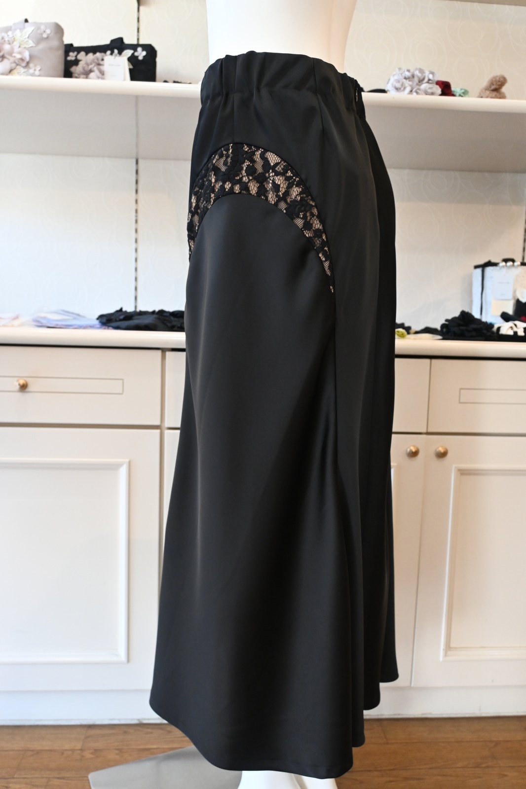 NAPATA MELLOE(ナパータメロエ)切り替えのレースのカッティングとバイヤス使いで細くきれいに見えるパターンです。裾には分量を出していて歩く姿も立ち姿もとてもエレガントなスカートです。