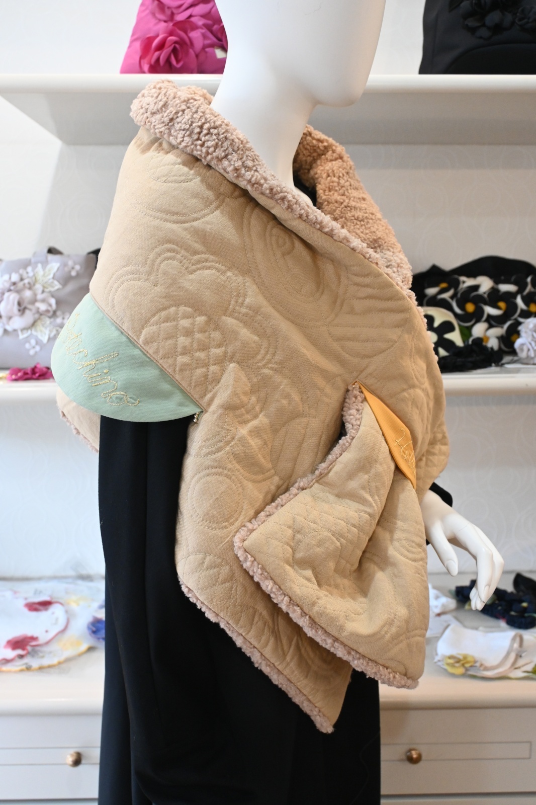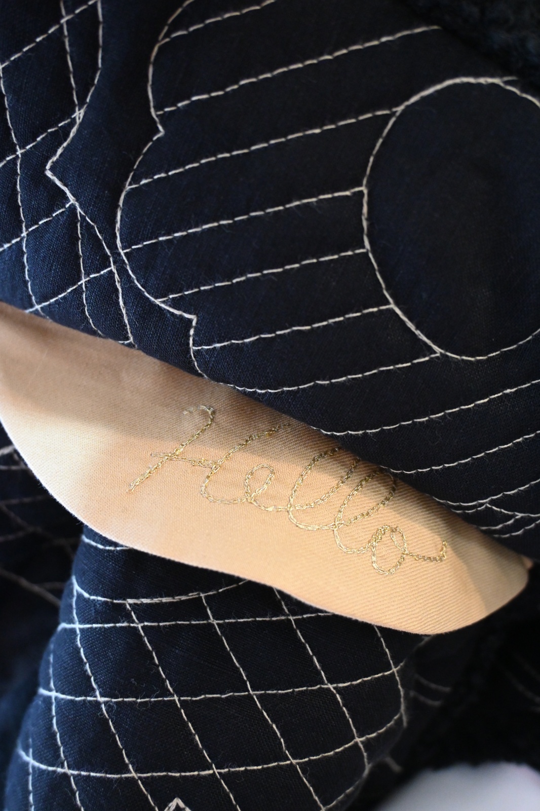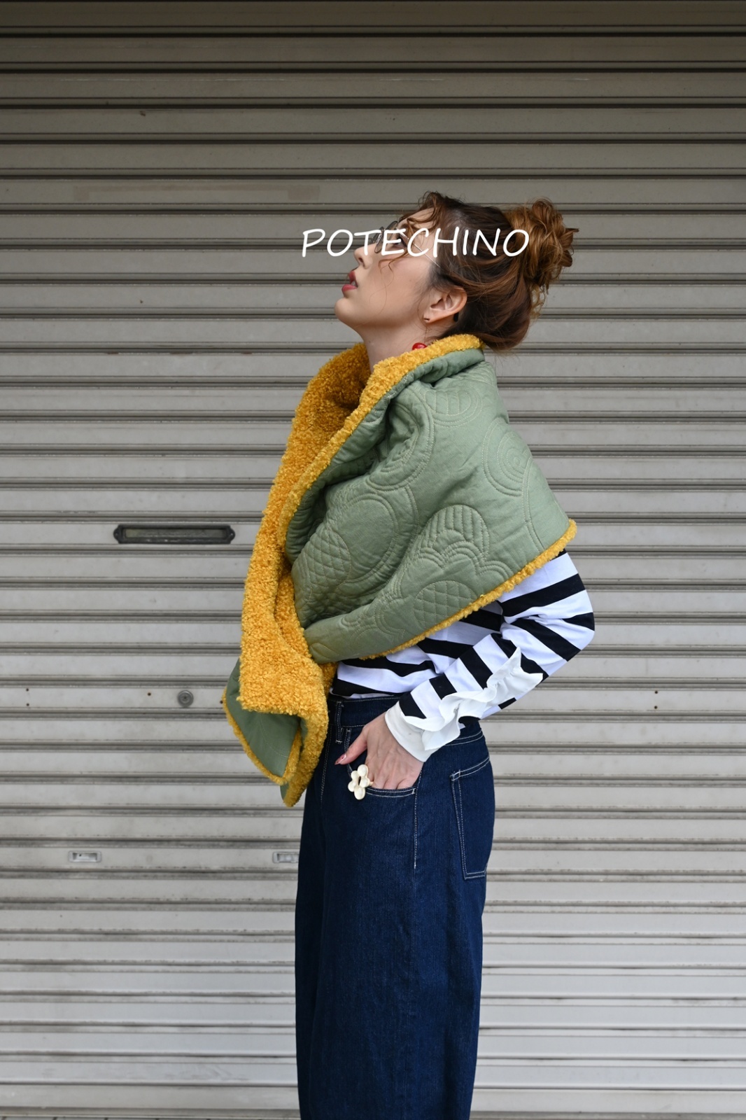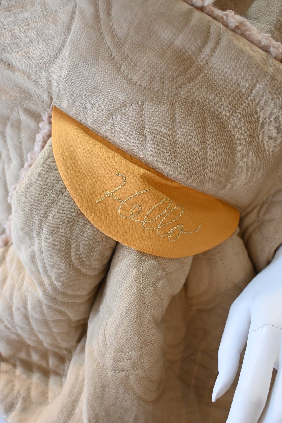 POTECHINO(ポテチーノ)オリジナルキルト生地。今回は麻素材を使用し新鮮な風合いに仕上げ発熱綿を中に挟んでいます。helloとbyeの刺繍を施し、helloの部分に腕を通して着用のアレンジをしていただけます。※他のカラーや関連アイテムのある商品に関しては、ページ下段の「関連商品」でご確認いただけます。