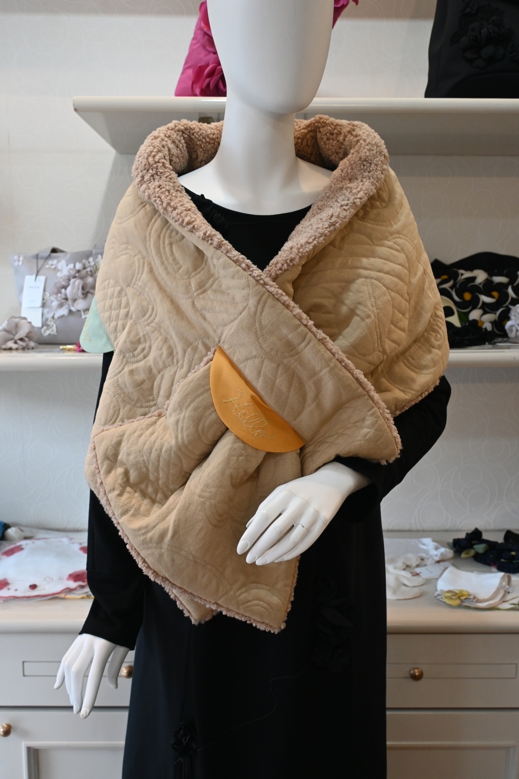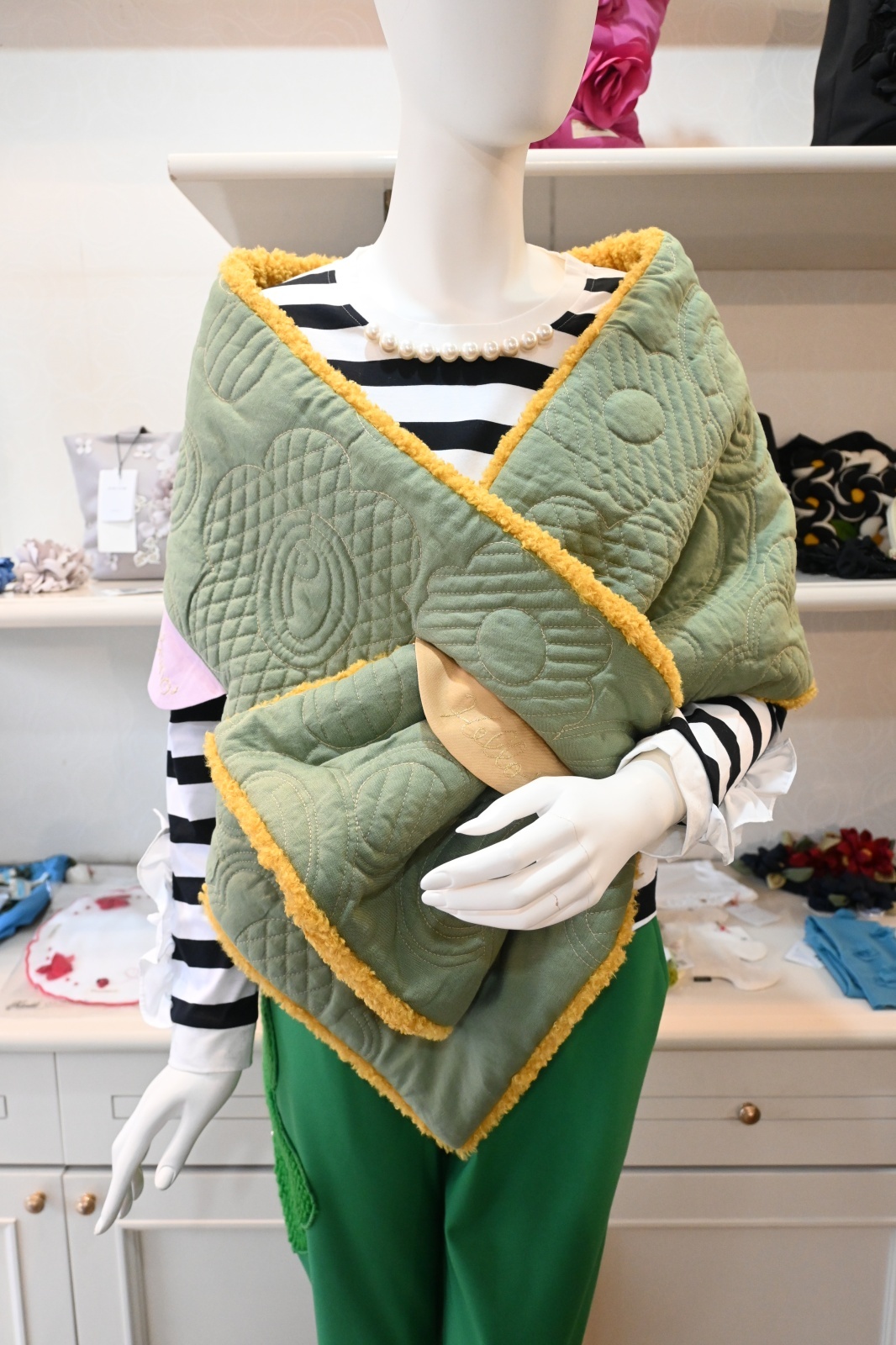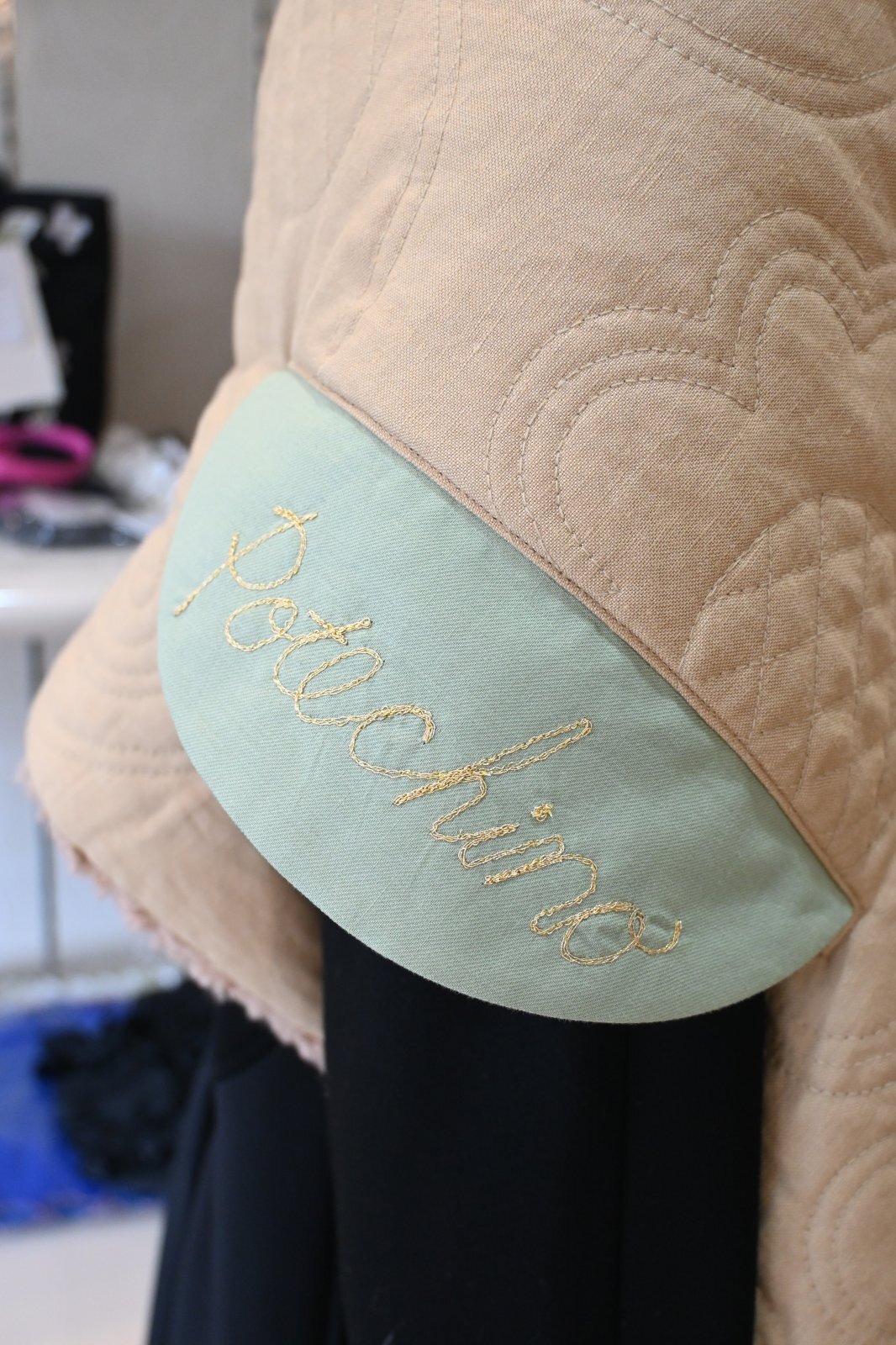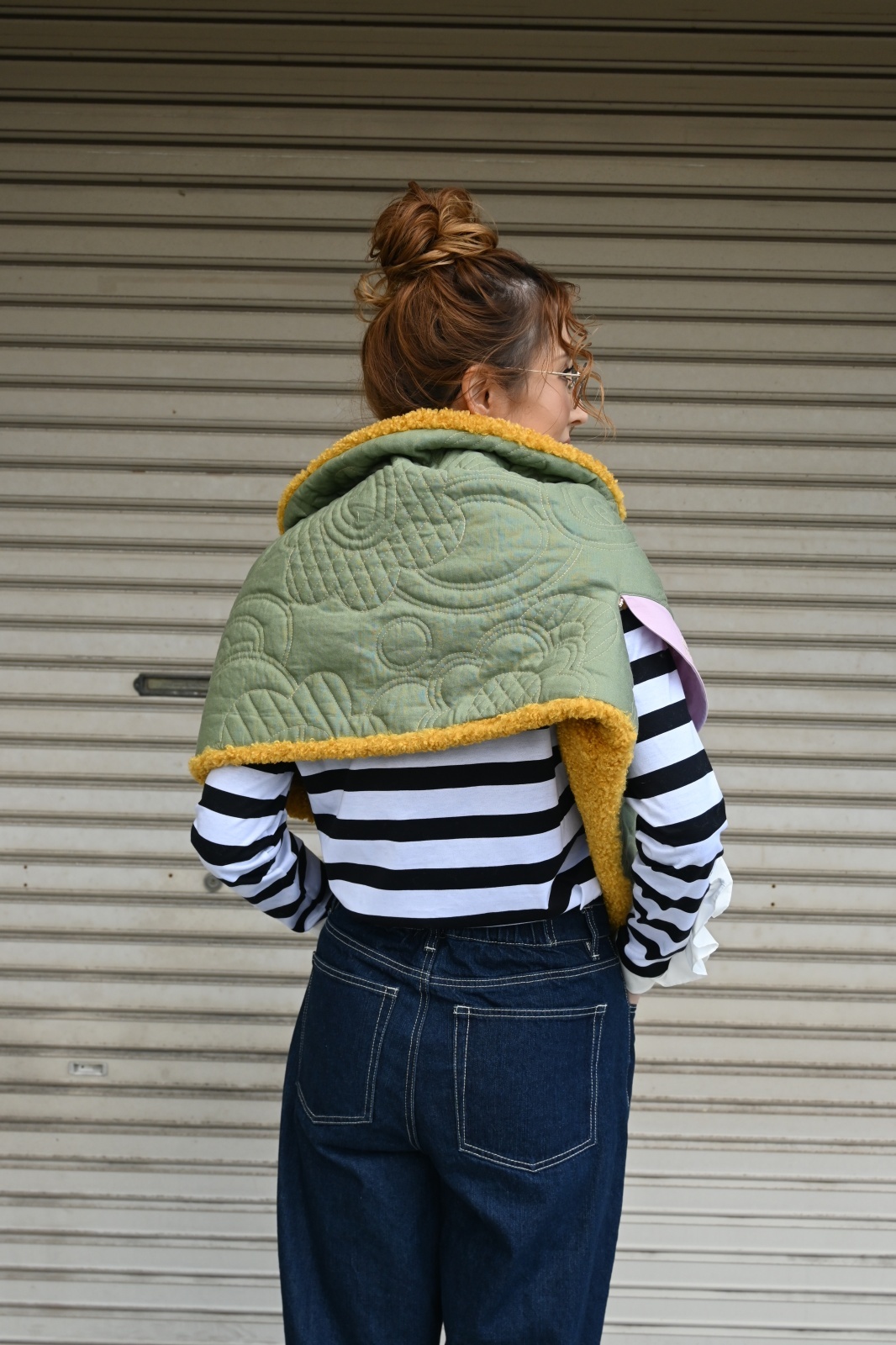 POTECHINO(ポテチーノ)オリジナルキルト生地。今回は麻素材を使用し新鮮な風合いに仕上げ発熱綿を中に挟んでいます。helloとbyeの刺繍を施し、helloの部分に腕を通して着用のアレンジをしていただけます。※他のカラーや関連アイテムのある商品に関しては、ページ下段の「関連商品」でご確認いただけます。