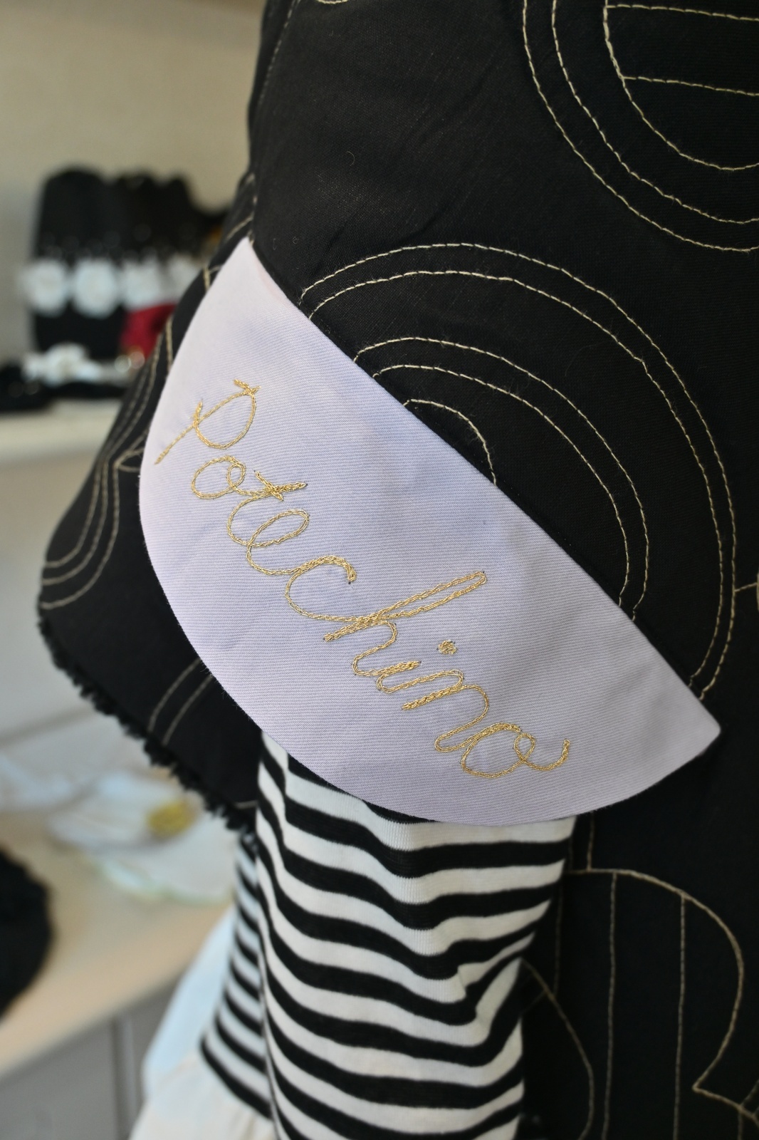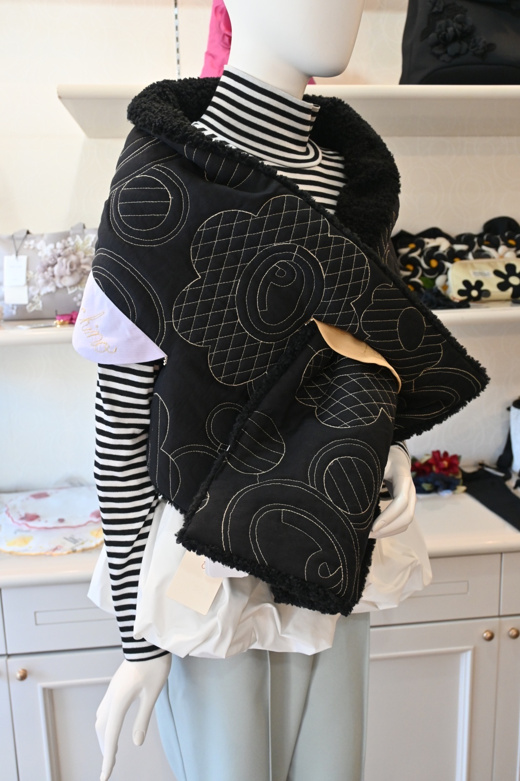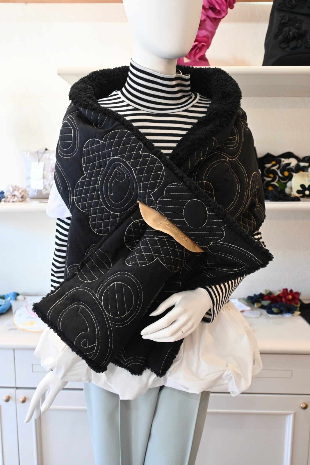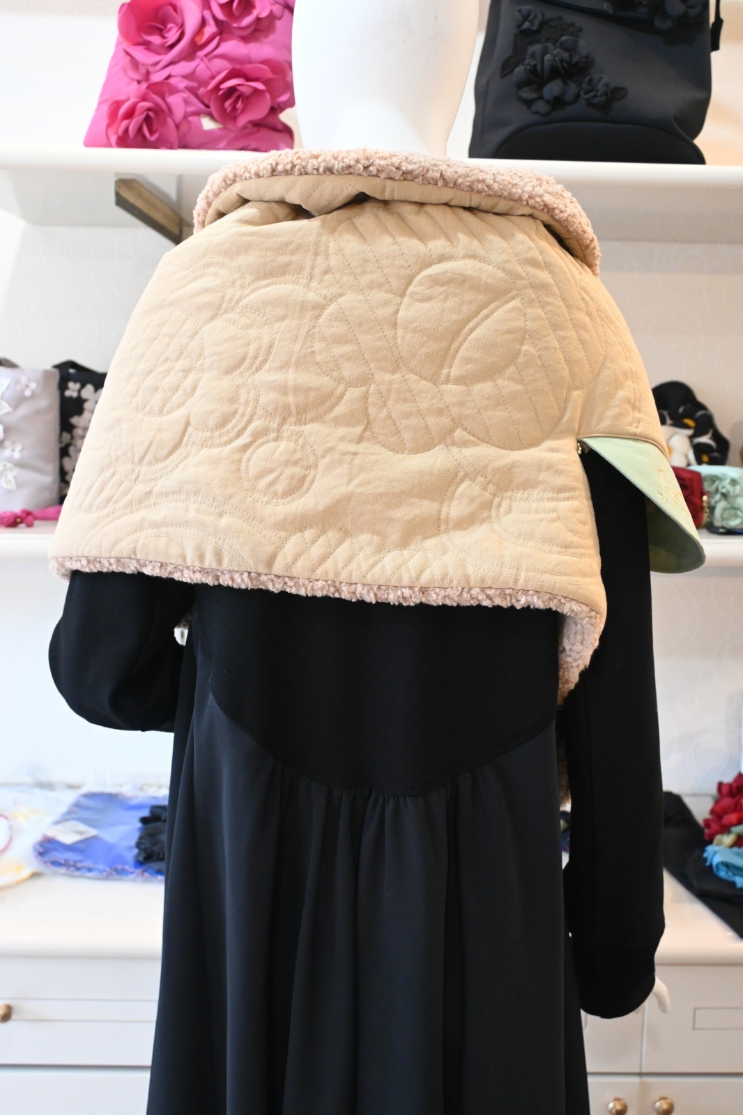 POTECHINO(ポテチーノ)オリジナルキルト生地。今回は麻素材を使用し新鮮な風合いに仕上げ発熱綿を中に挟んでいます。helloとbyeの刺繍を施し、helloの部分に腕を通して着用のアレンジをしていただけます。※他のカラーや関連アイテムのある商品に関しては、ページ下段の「関連商品」でご確認いただけます。
