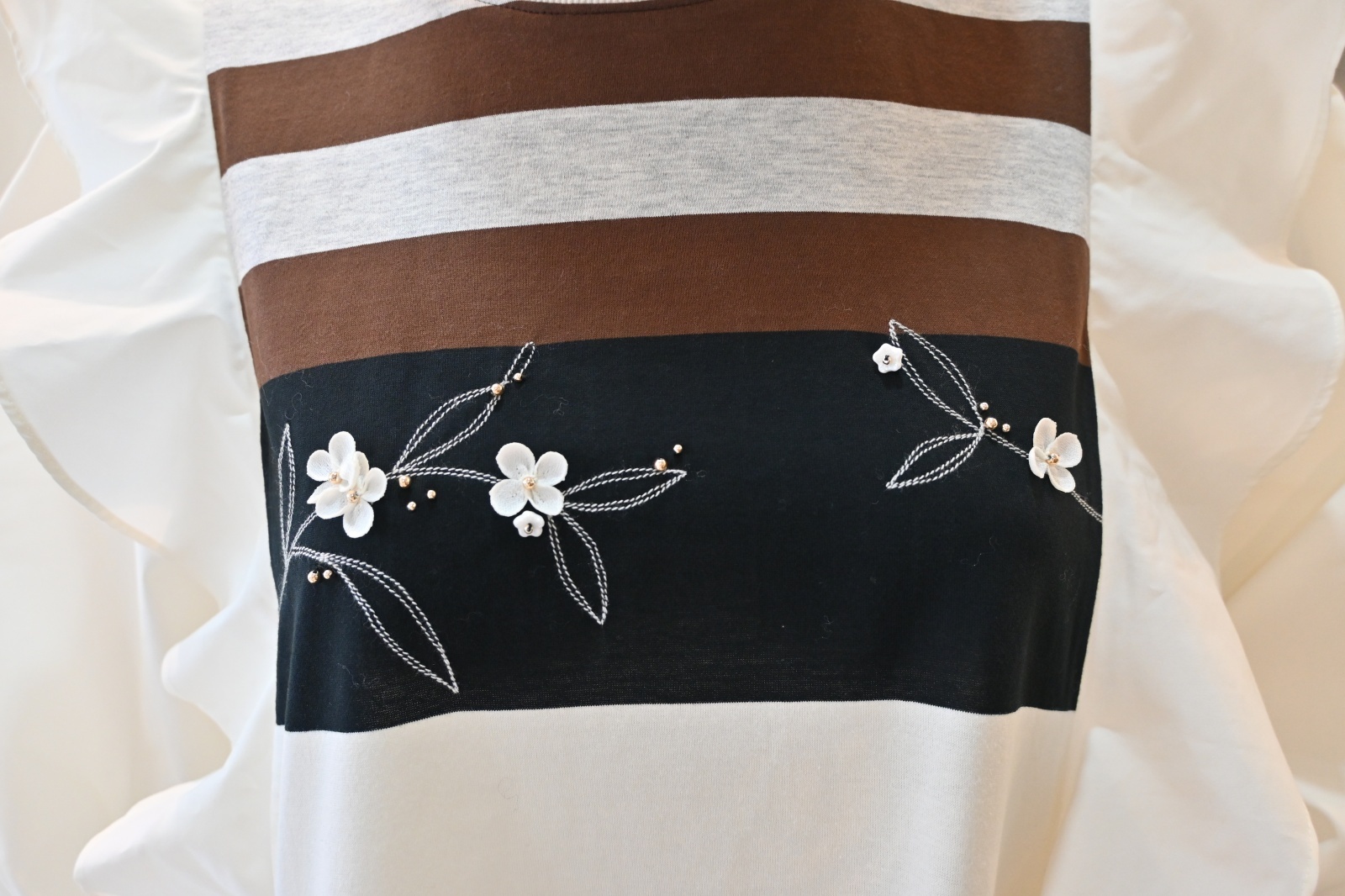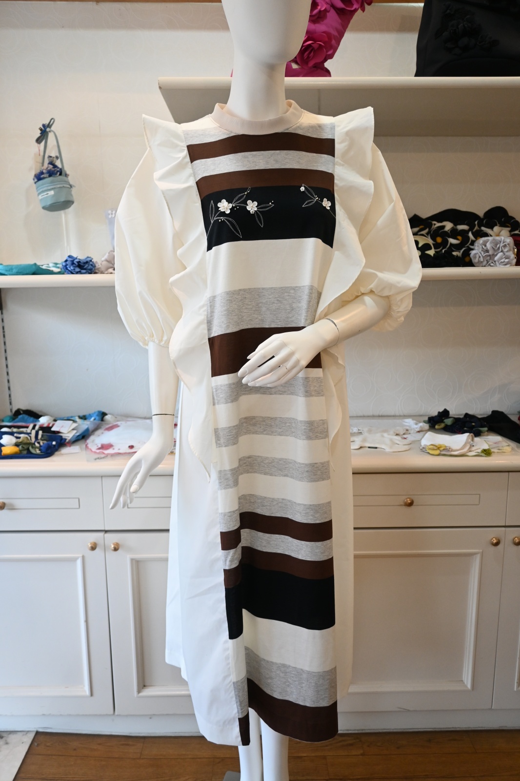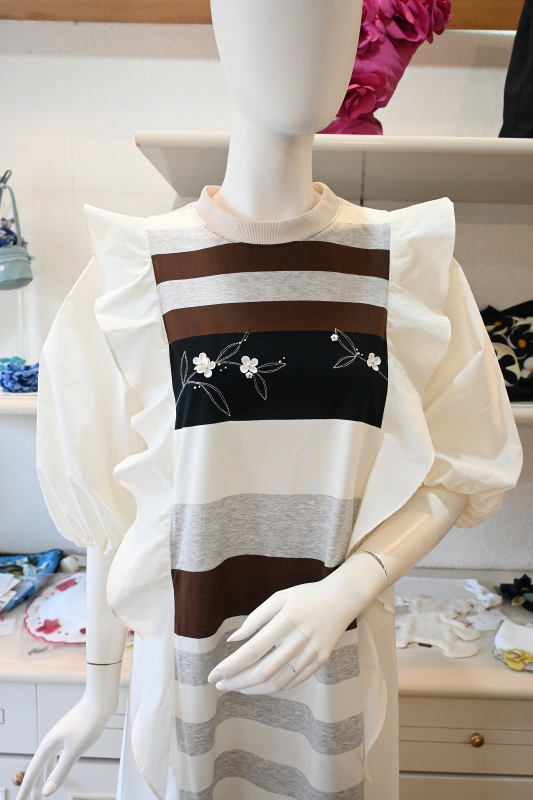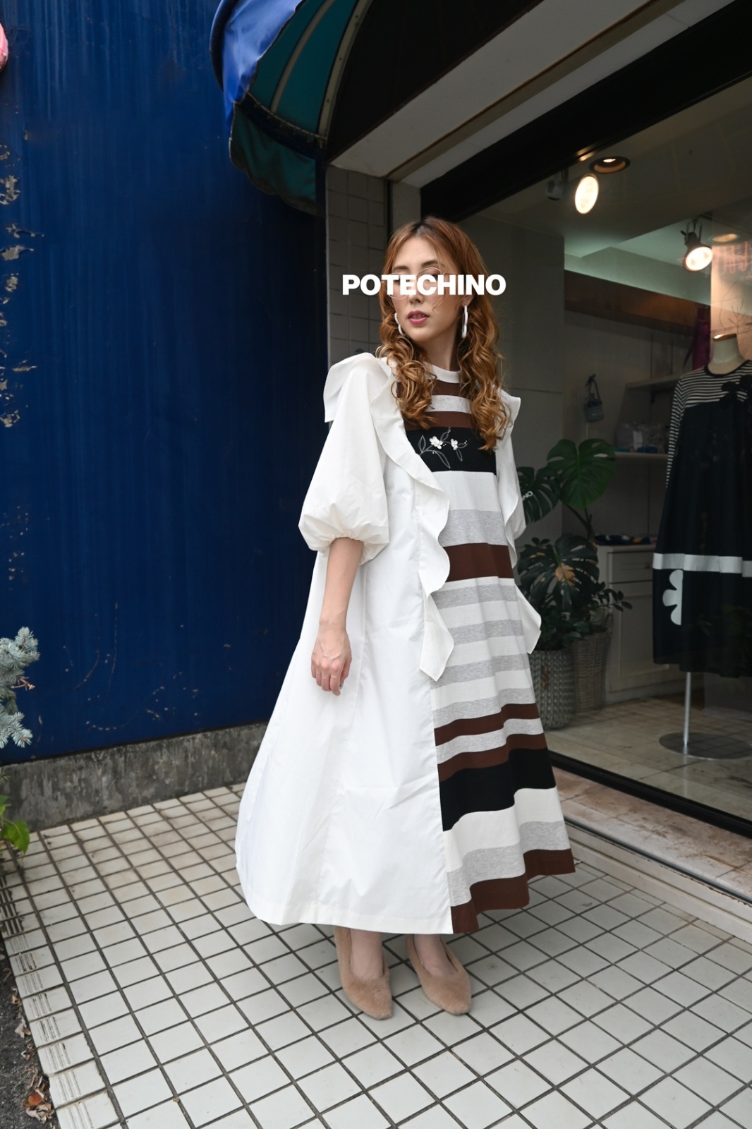 RainDance(レインダンス)異素材とプリントを組ませた素敵なワンピース。前の切り替えにボーダー部分を作りフリルもポイントになっています。p>