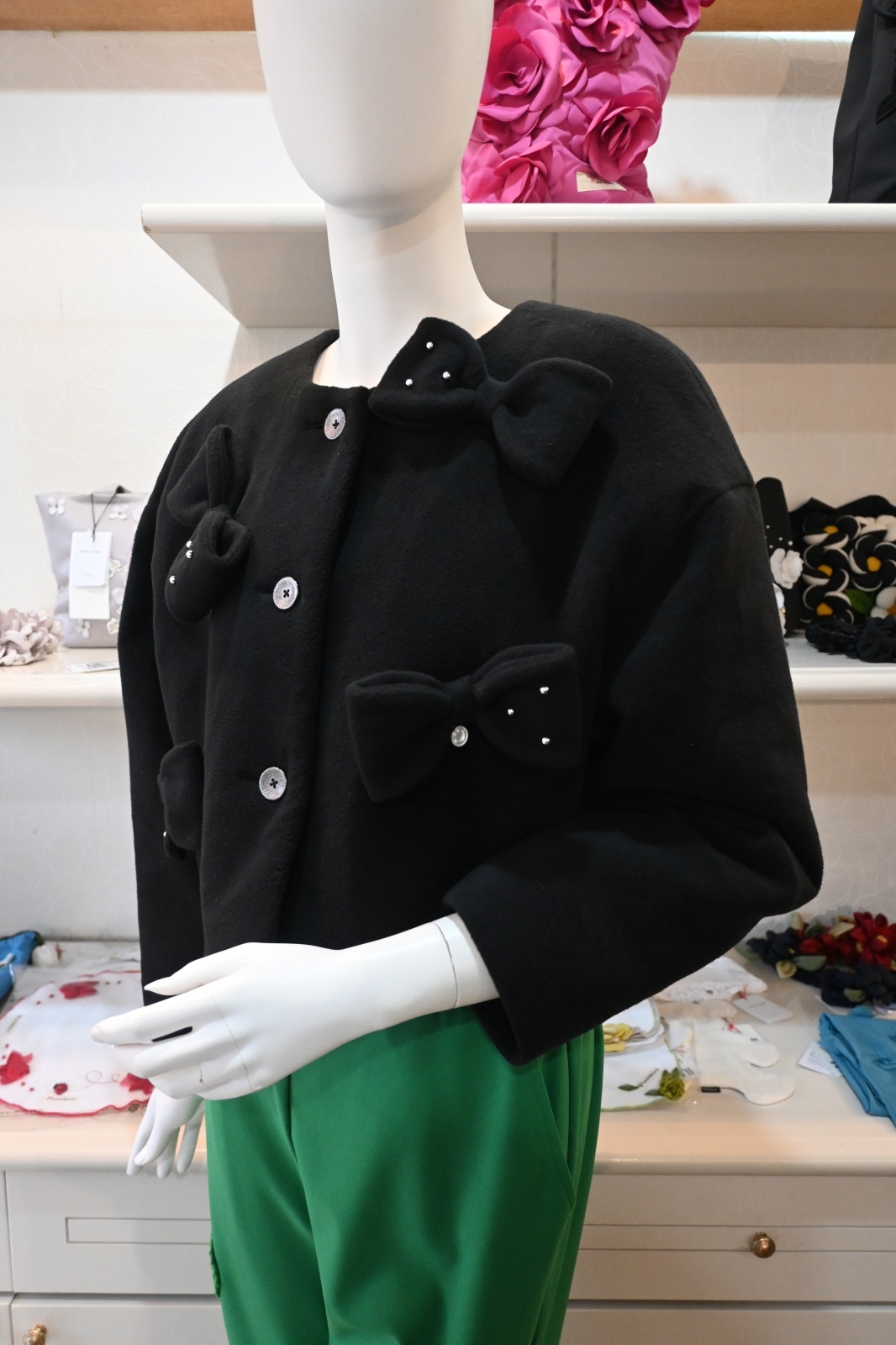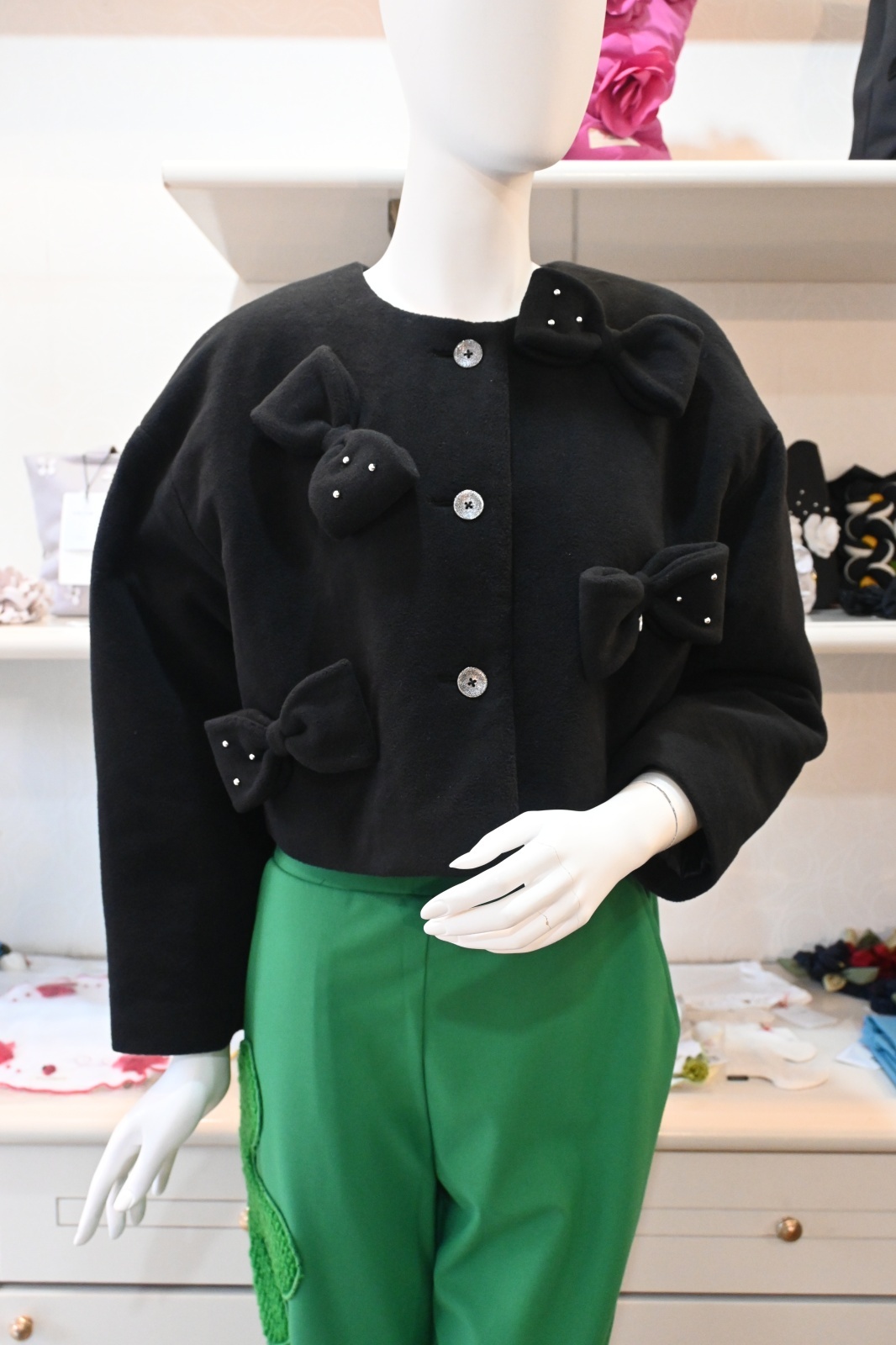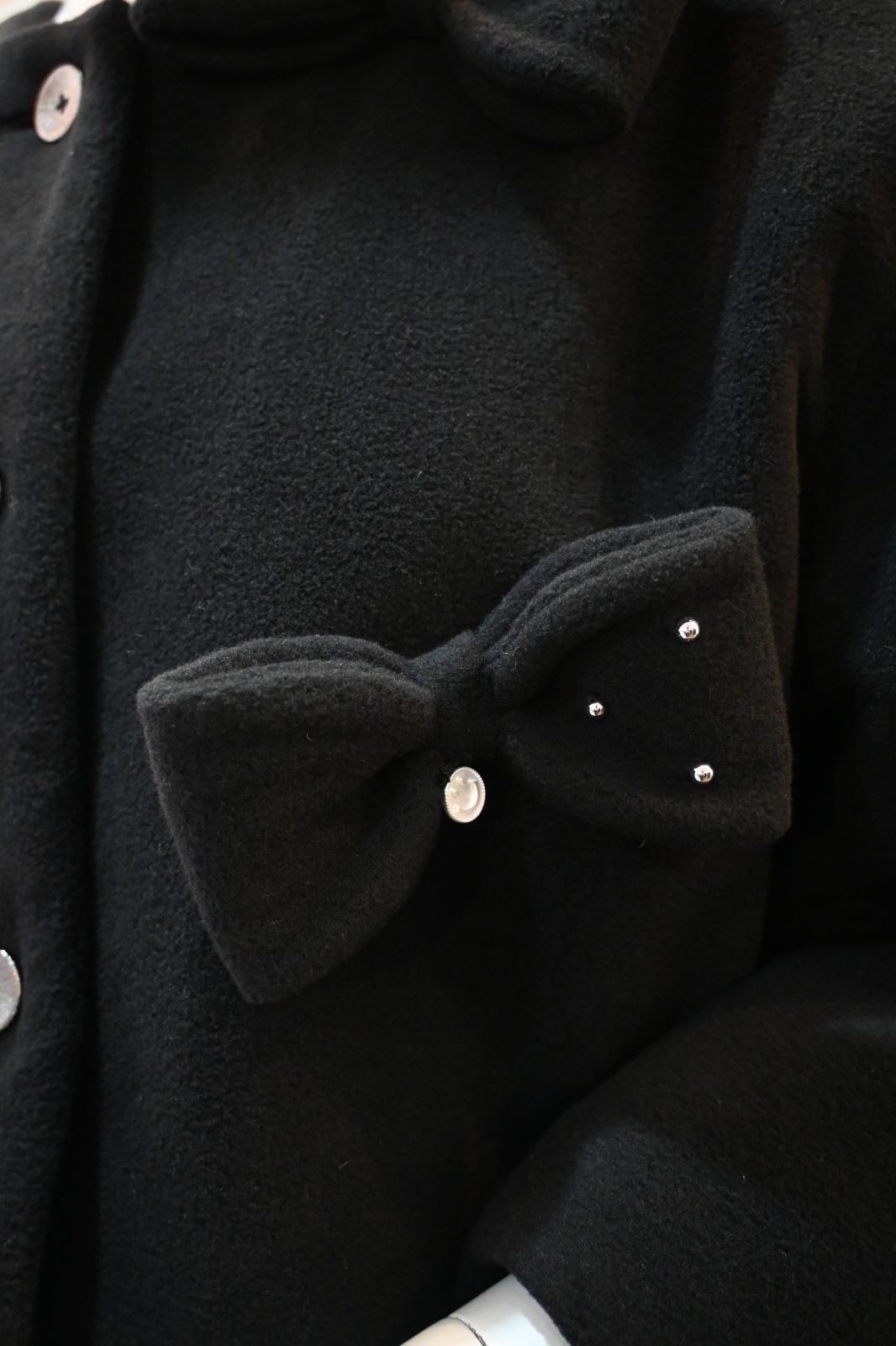 POTECHINO(ポテチーノ)縁結びのリボンを大胆に配置したショートコートです。優しい肌触りの素材に吸湿発熱綿を全体に入れ軽くて暖かいを実現しました。