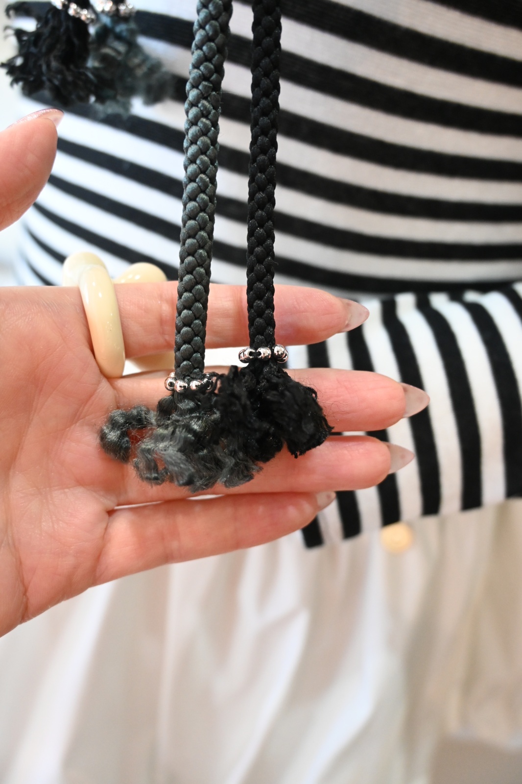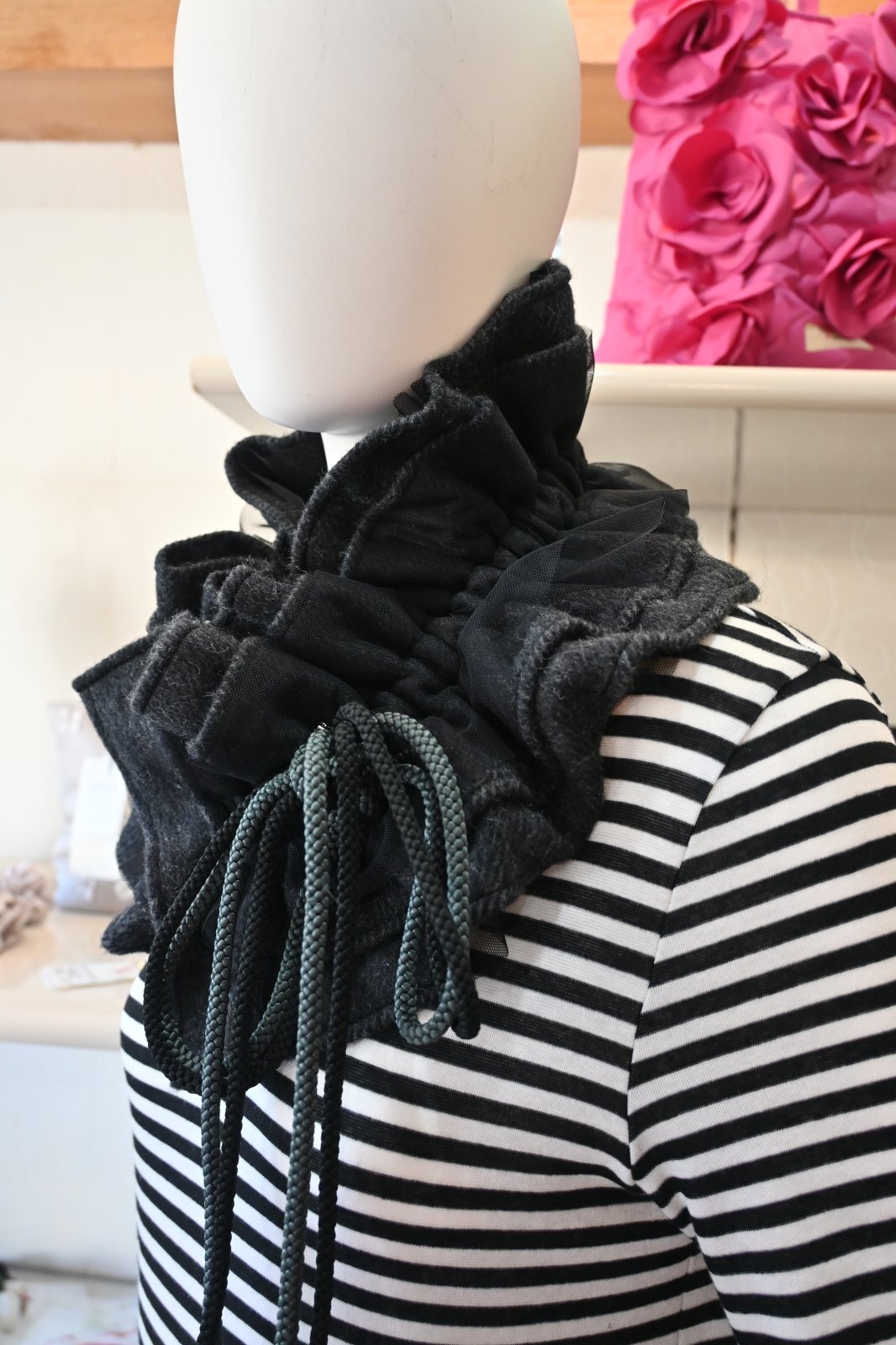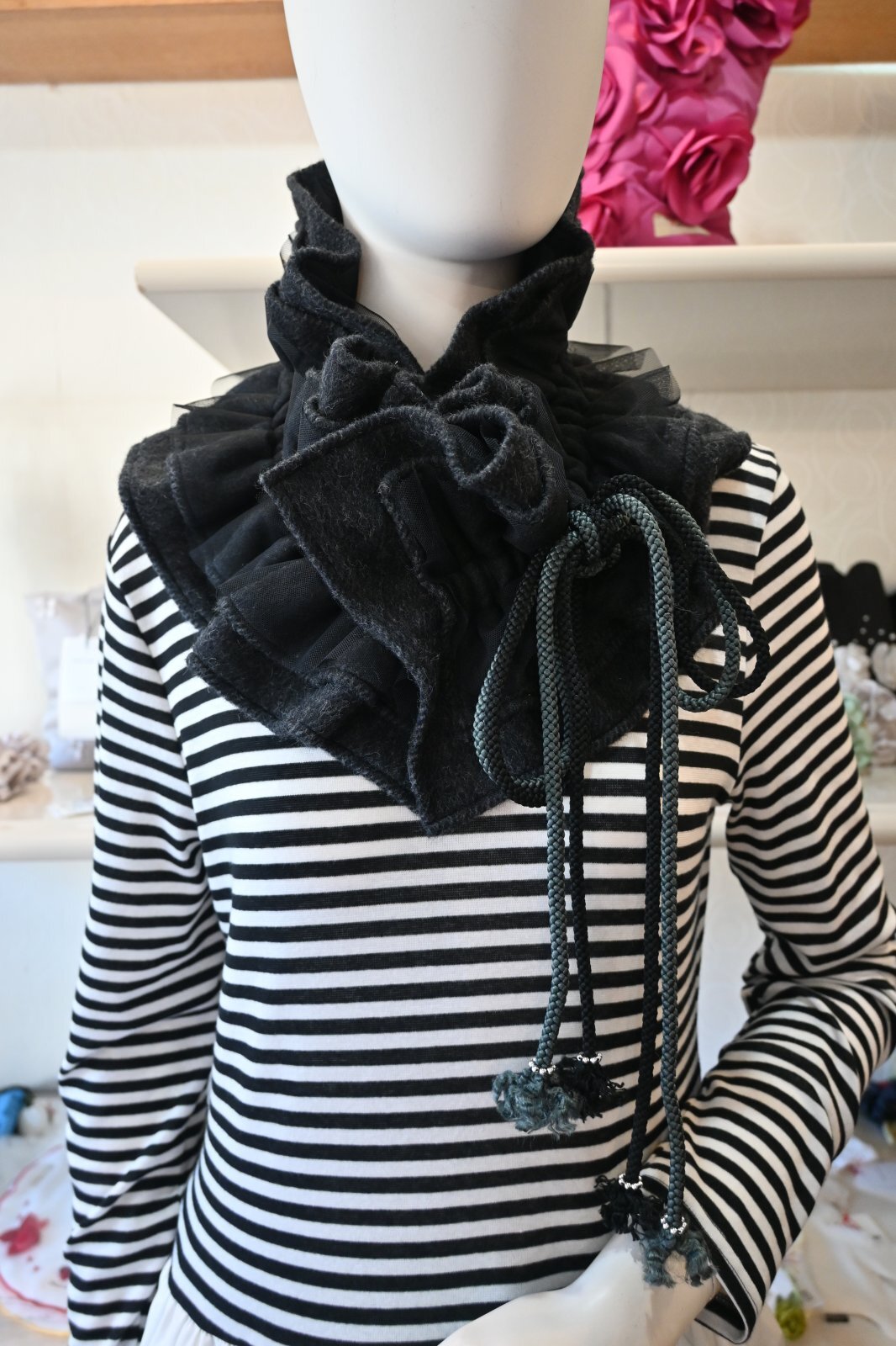 POTECHINO(ポテチーノ)組みひものブローチ付き。フリルティペット。ふんわりと襟元を飾っていただけます。肌にあたる部分にチュールを重ねており肌あたりの不快感を軽減する使用になっております。