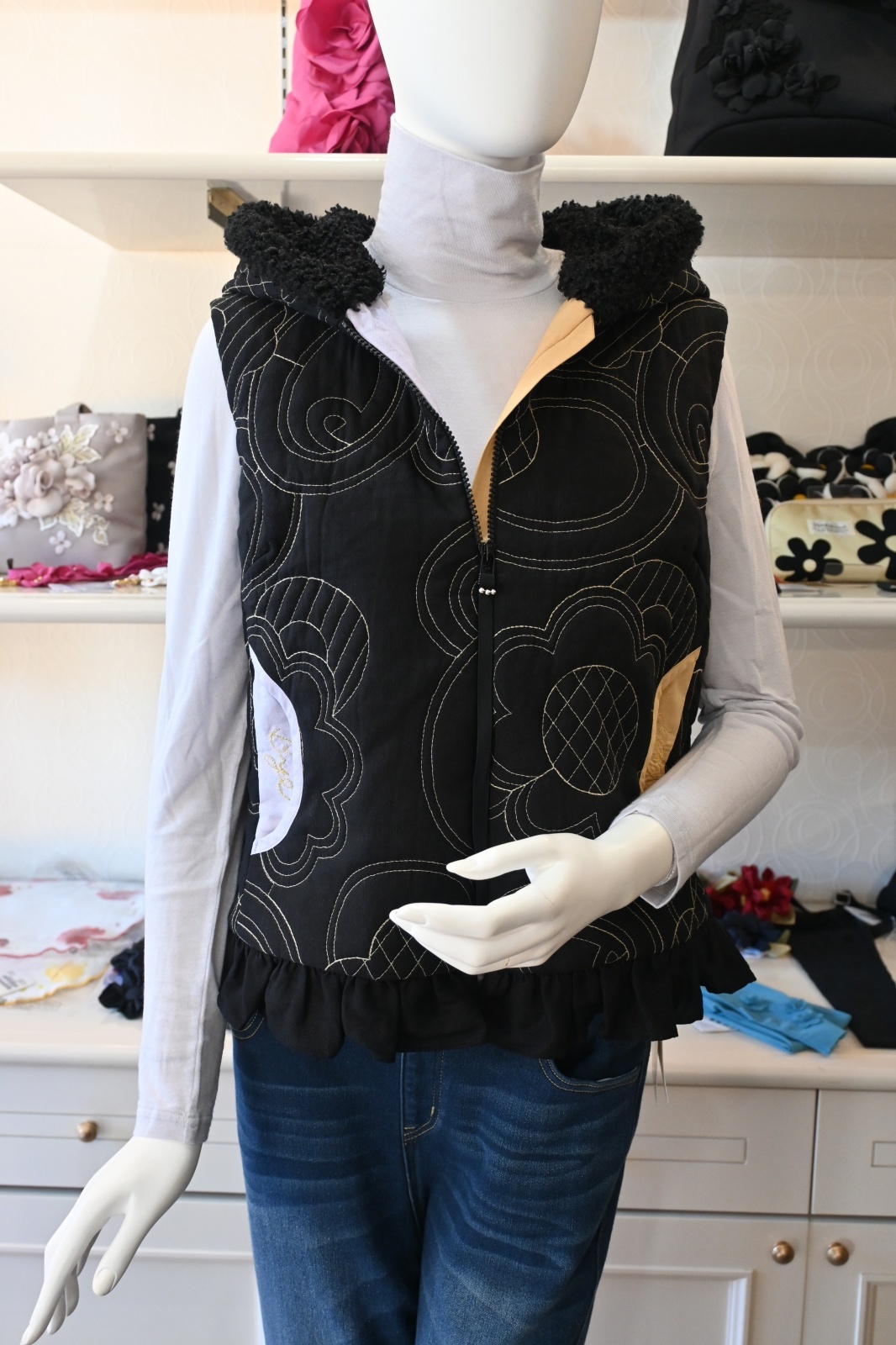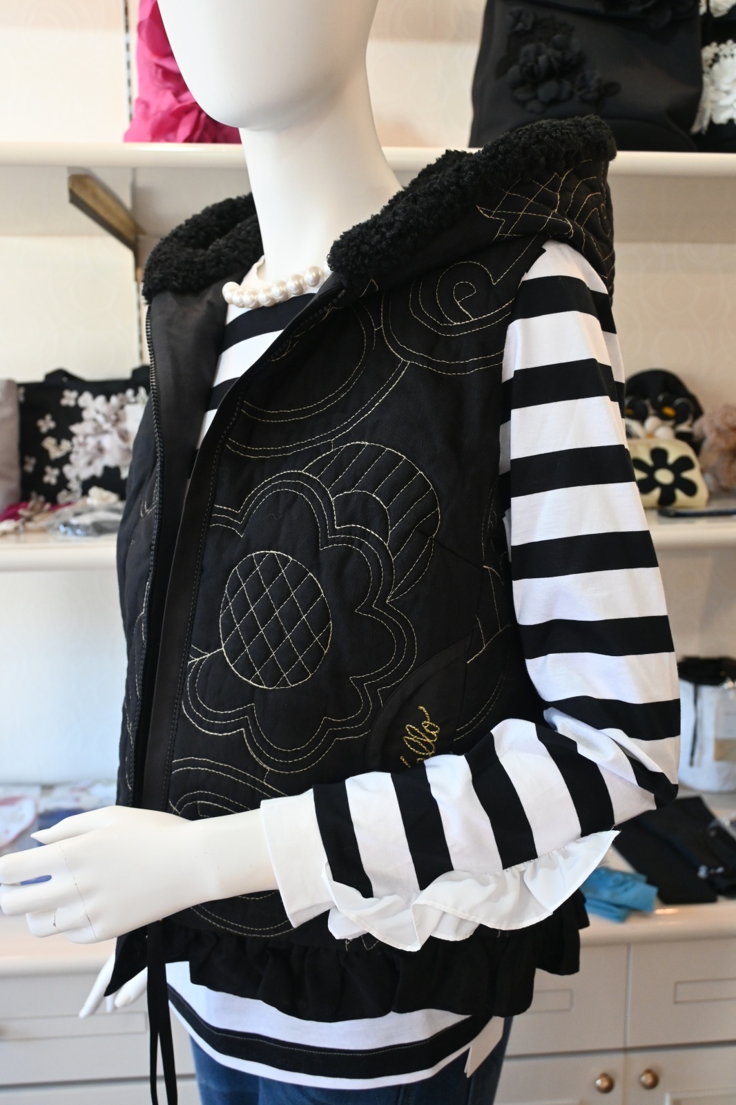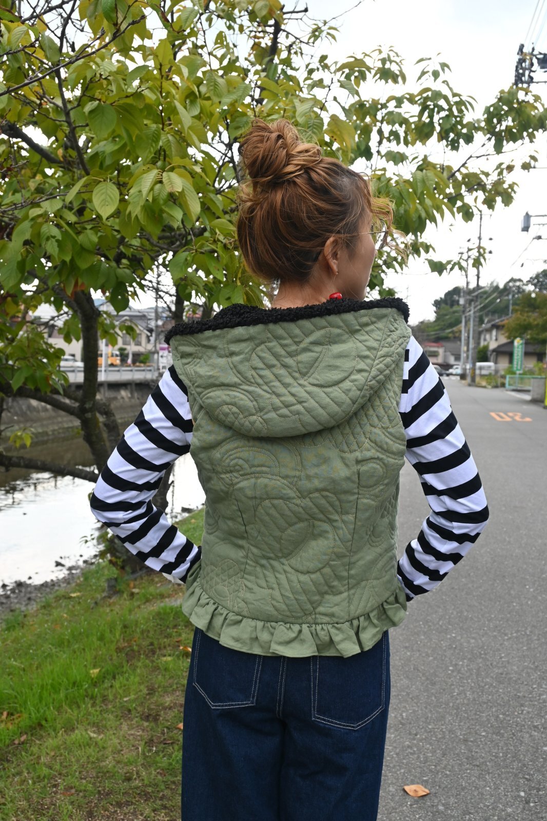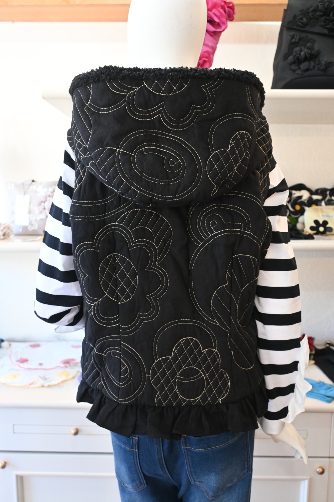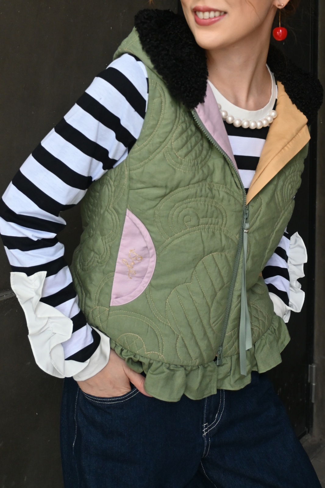 POTECHINO(ポテチーノ)オリジナルキルト生地を使ったあったかベスト。フードと背中部分をメインに内側にファーを使用。ゴールドの刺繍で遊び心を持たせました。※他のカラーや関連アイテムのある商品に関しては、ページ下段の「関連商品」でご確認いただけます。