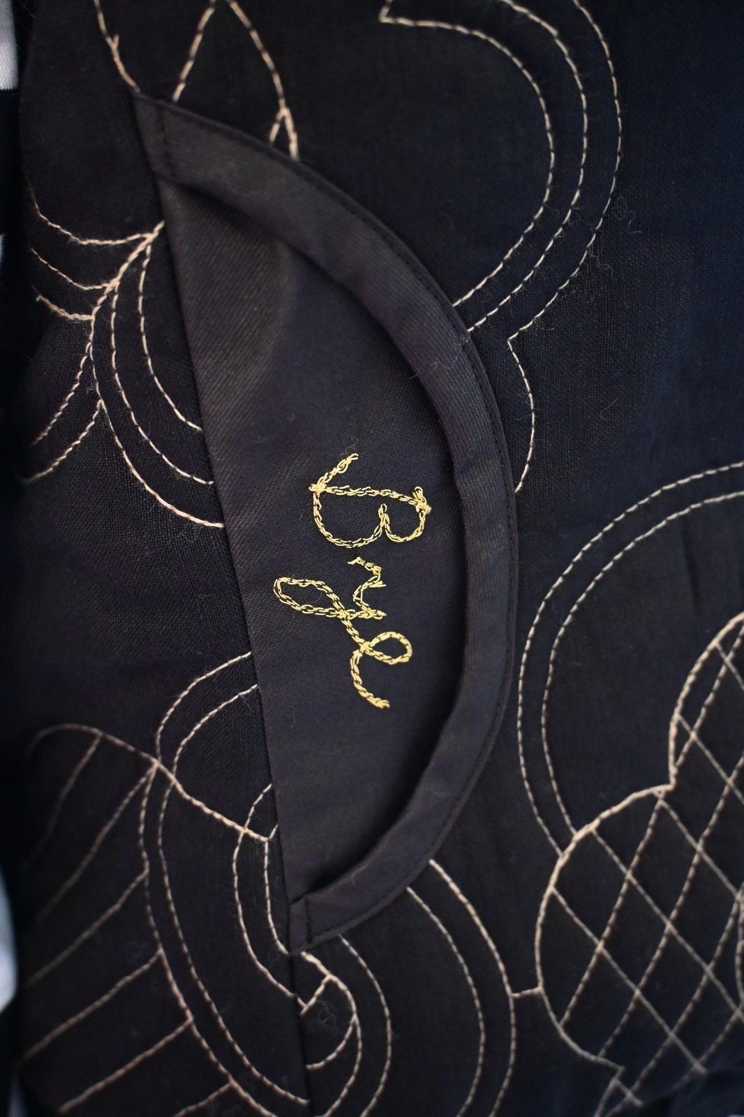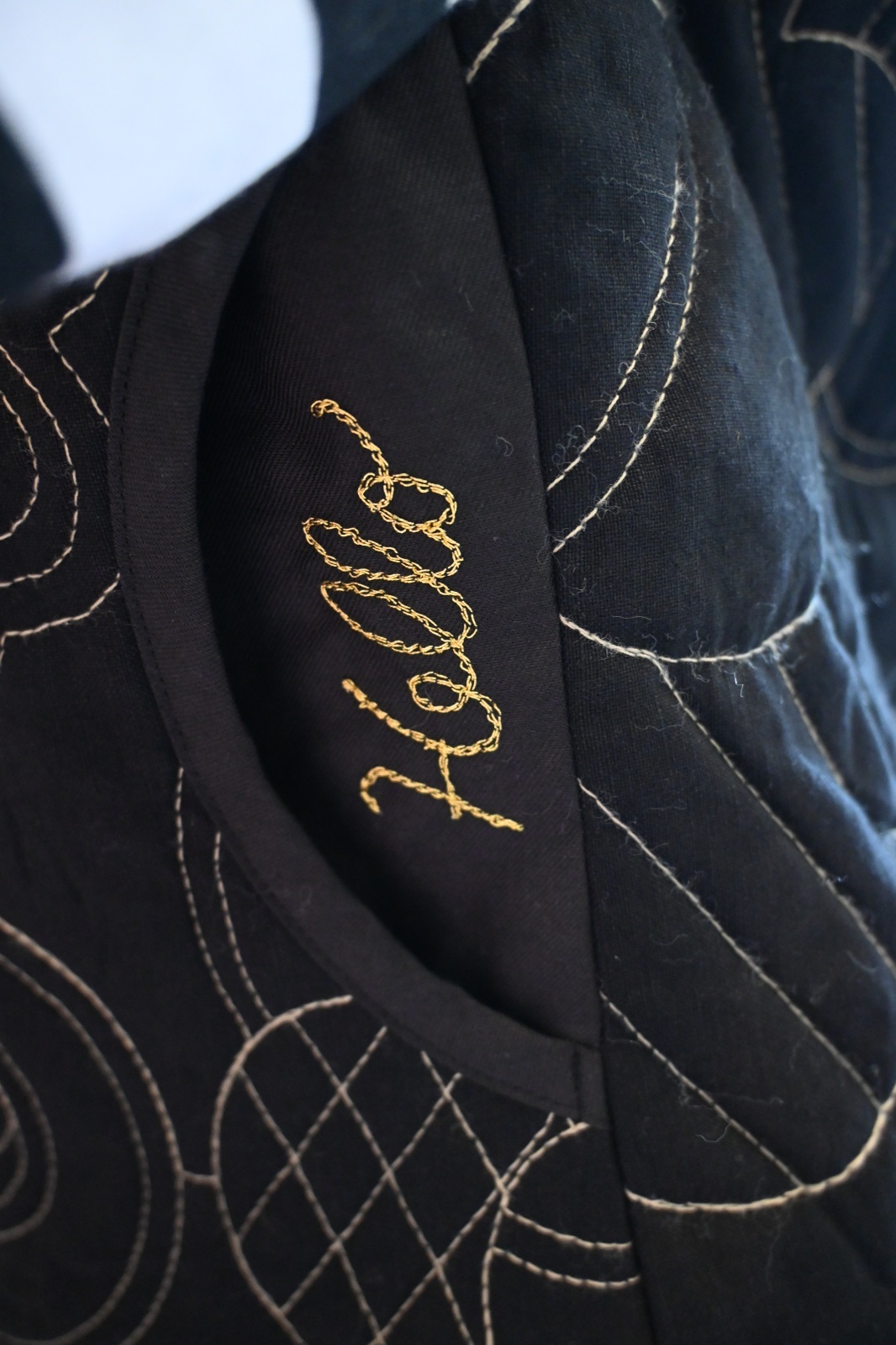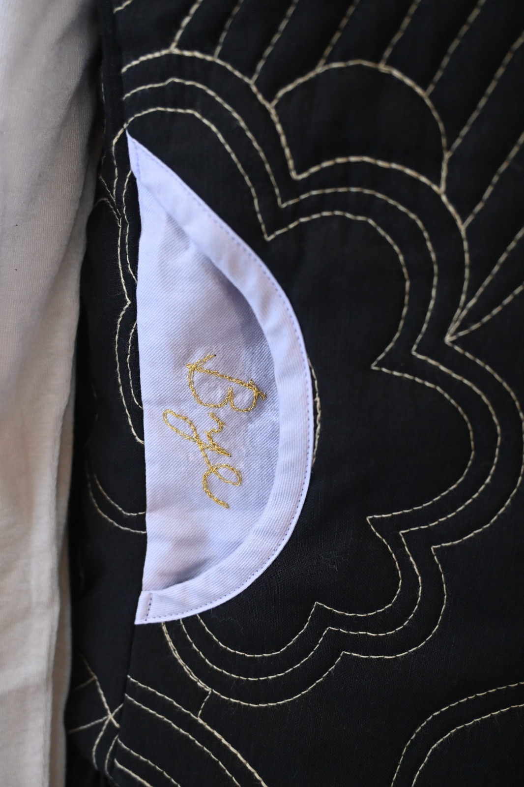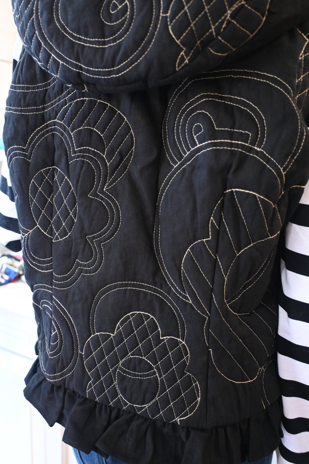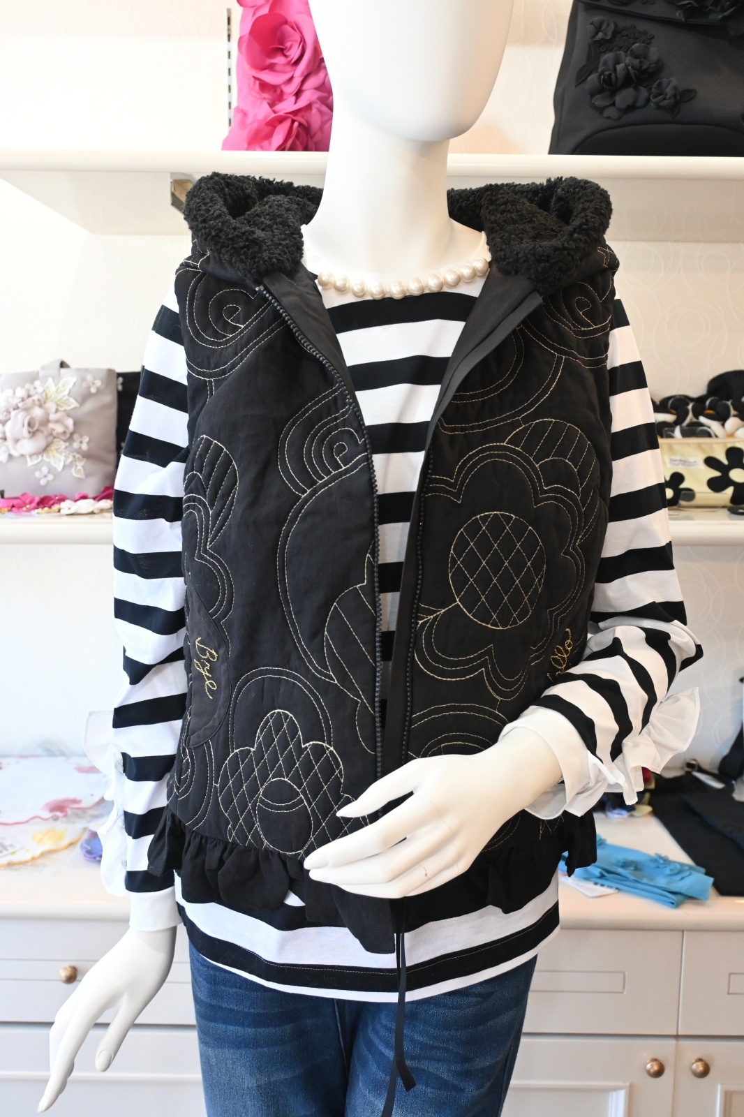 POTECHINO(ポテチーノ)オリジナルキルト生地を使ったあったかベスト。フードと背中部分をメインに内側にファーを使用。ゴールドの刺繍で遊び心を持たせました。※他のカラーや関連アイテムのある商品に関しては、ページ下段の「関連商品」でご確認いただけます。