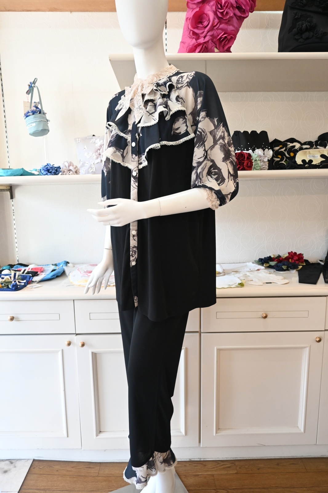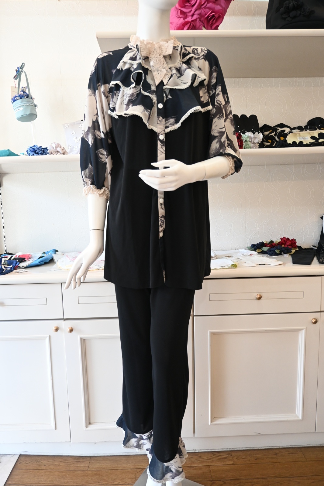 AKIAKANE(アキアカネ)シックなプリント柄のパジャマ。フレアーフリルが素敵な1枚♪シワにならない、さらさらの肌触りに伸縮性もありとても良いです♪小さくまとめられるので旅行などにもおすすめです。リラックスウエアーとしても活躍しそうです。