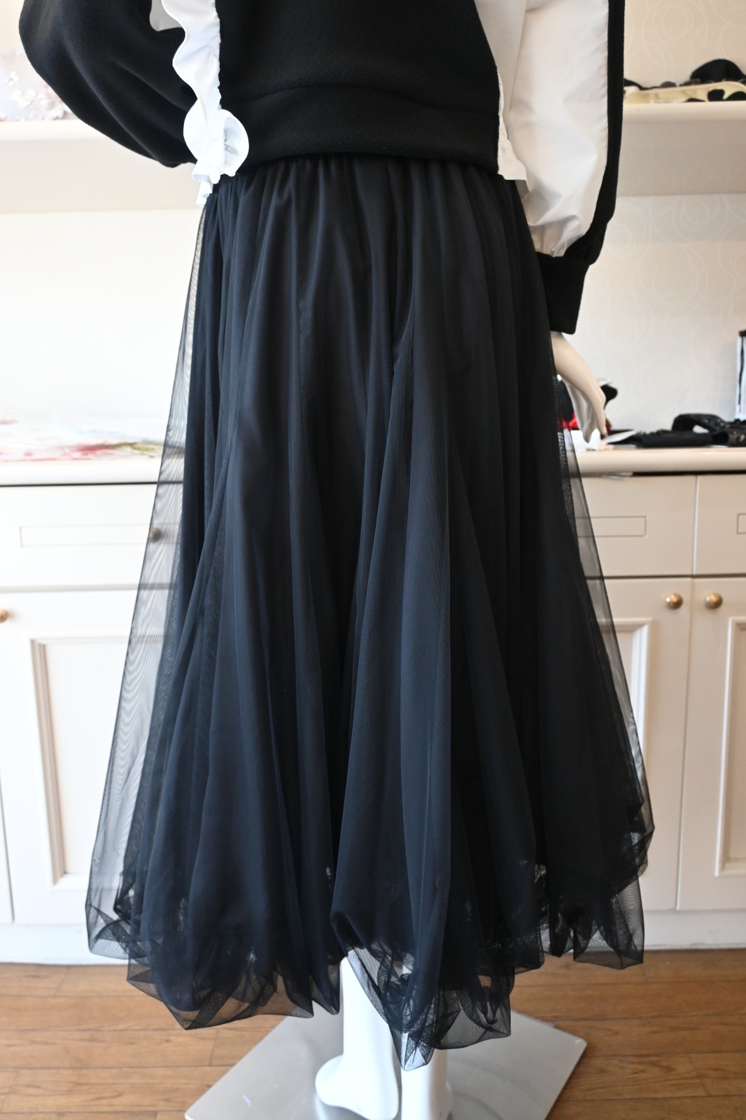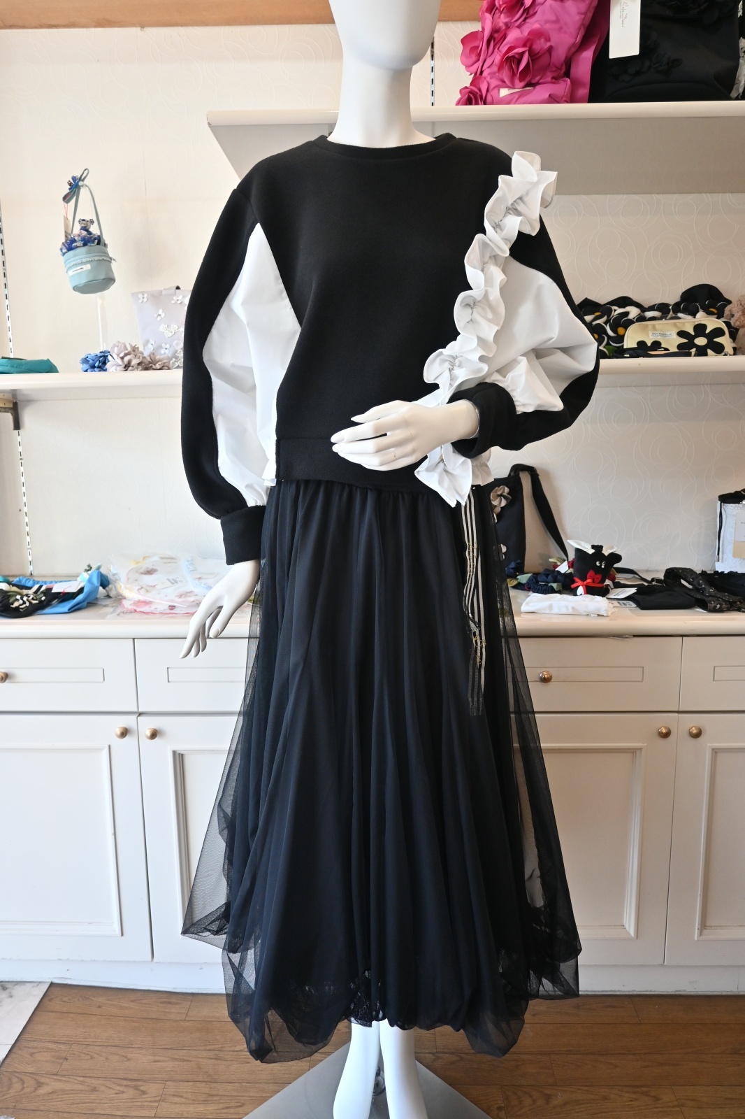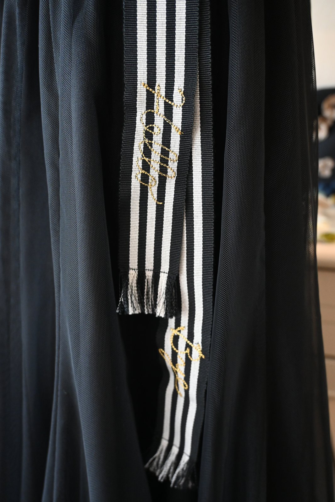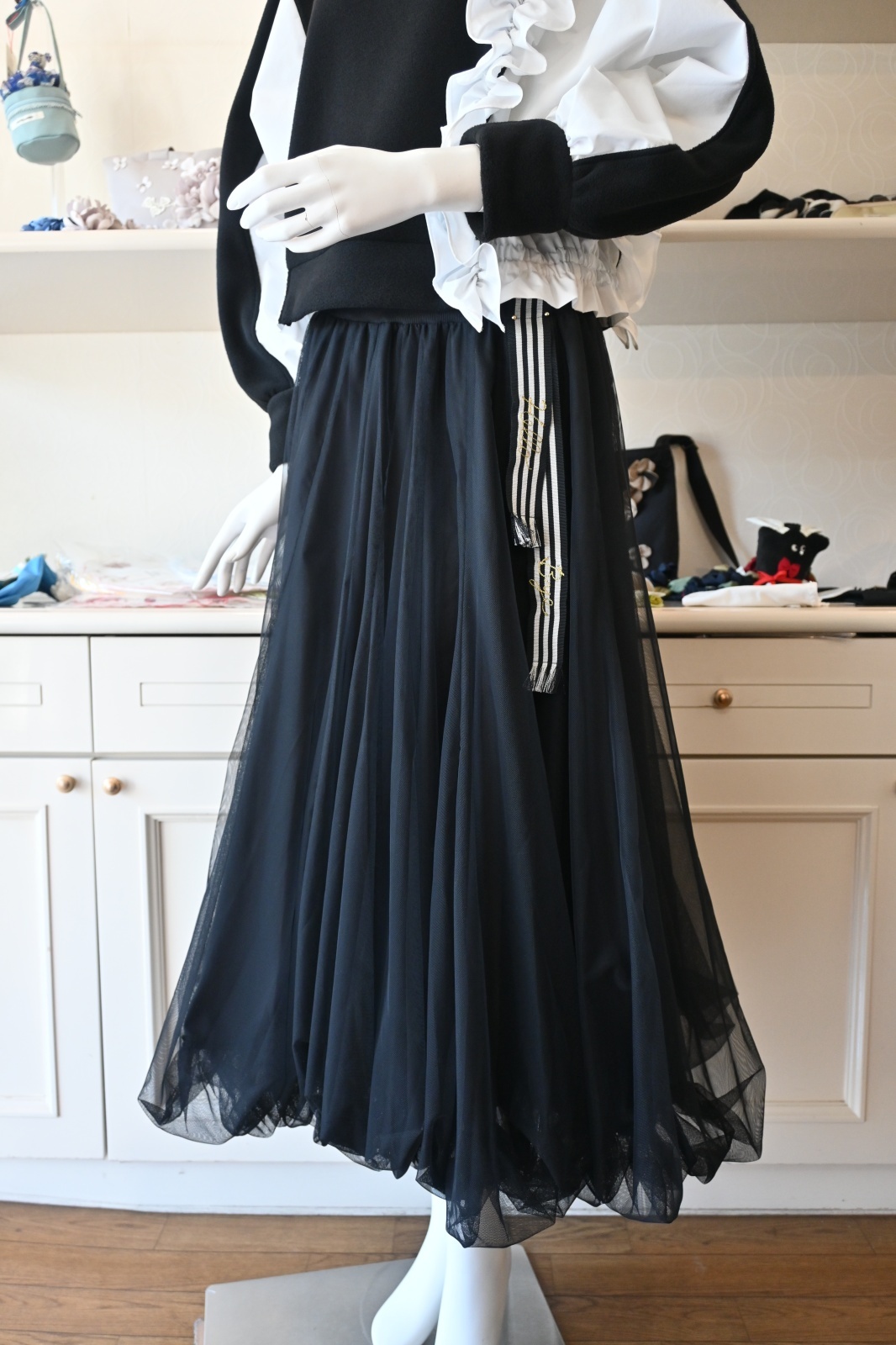 POTECHINO(ポテチーノ)24枚ハギのチュールスカート。裾をバルーン上にし以前までとは違うデザインに仕上げました。ストライプリボンに入れたゴールド刺繍のメッセージもポイントです。