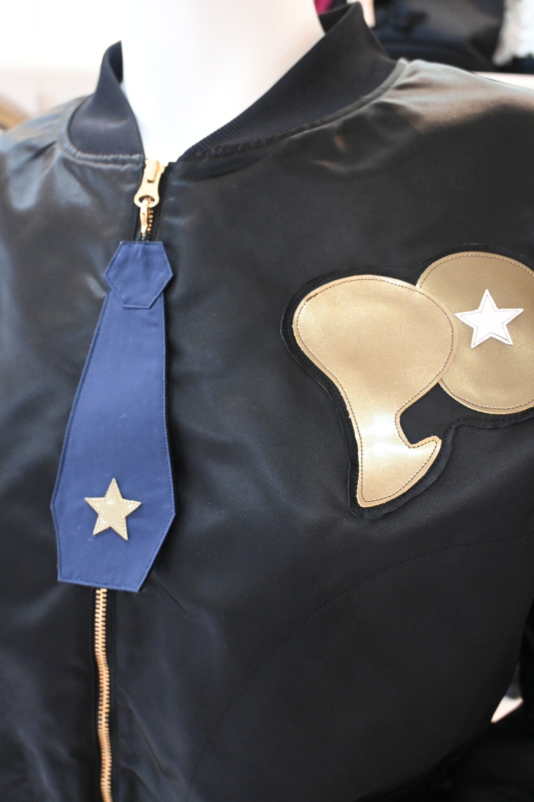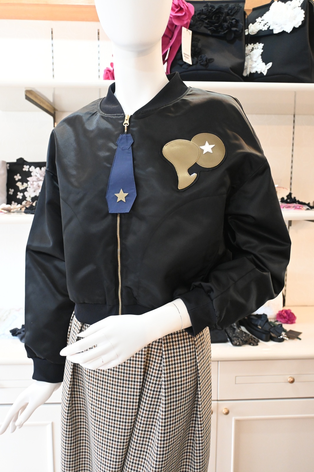 POTECHINO(ポテチーノ)MA-1にも使用される防水防シワの素材を使用したブルゾン。背中には歌舞伎のようなカブケンを大胆に配置し 楽しいながらも美光沢素材で大人向けにデザイン。ファスナー部分のネクタイは取り外し可能です。