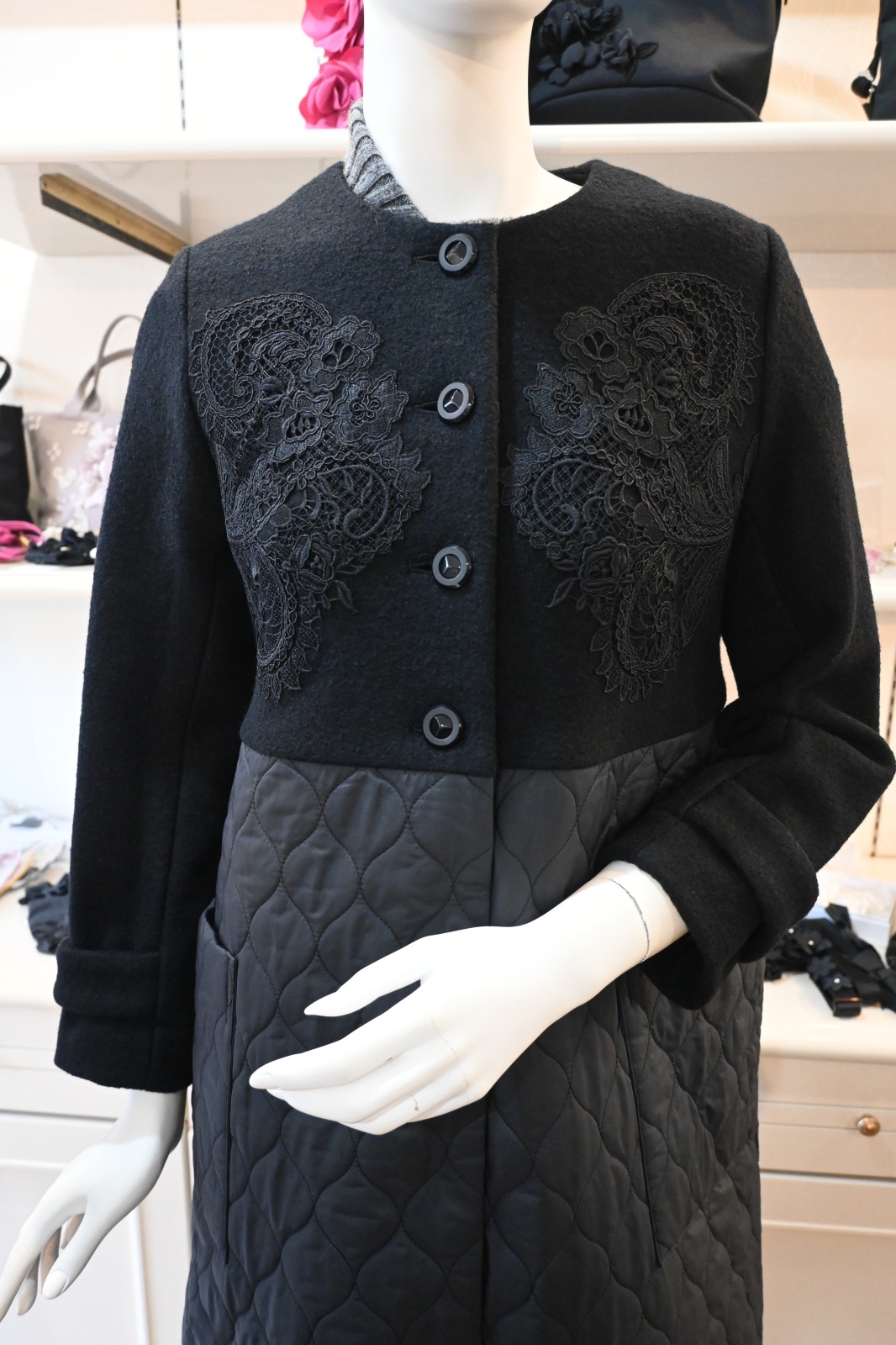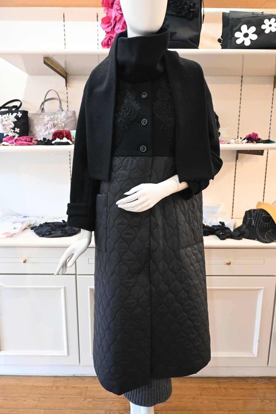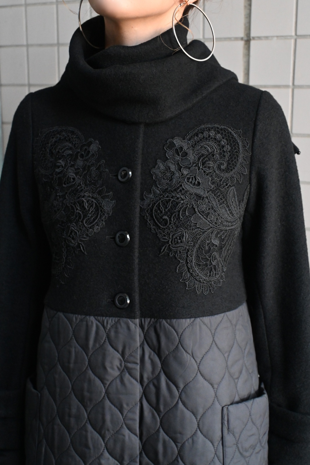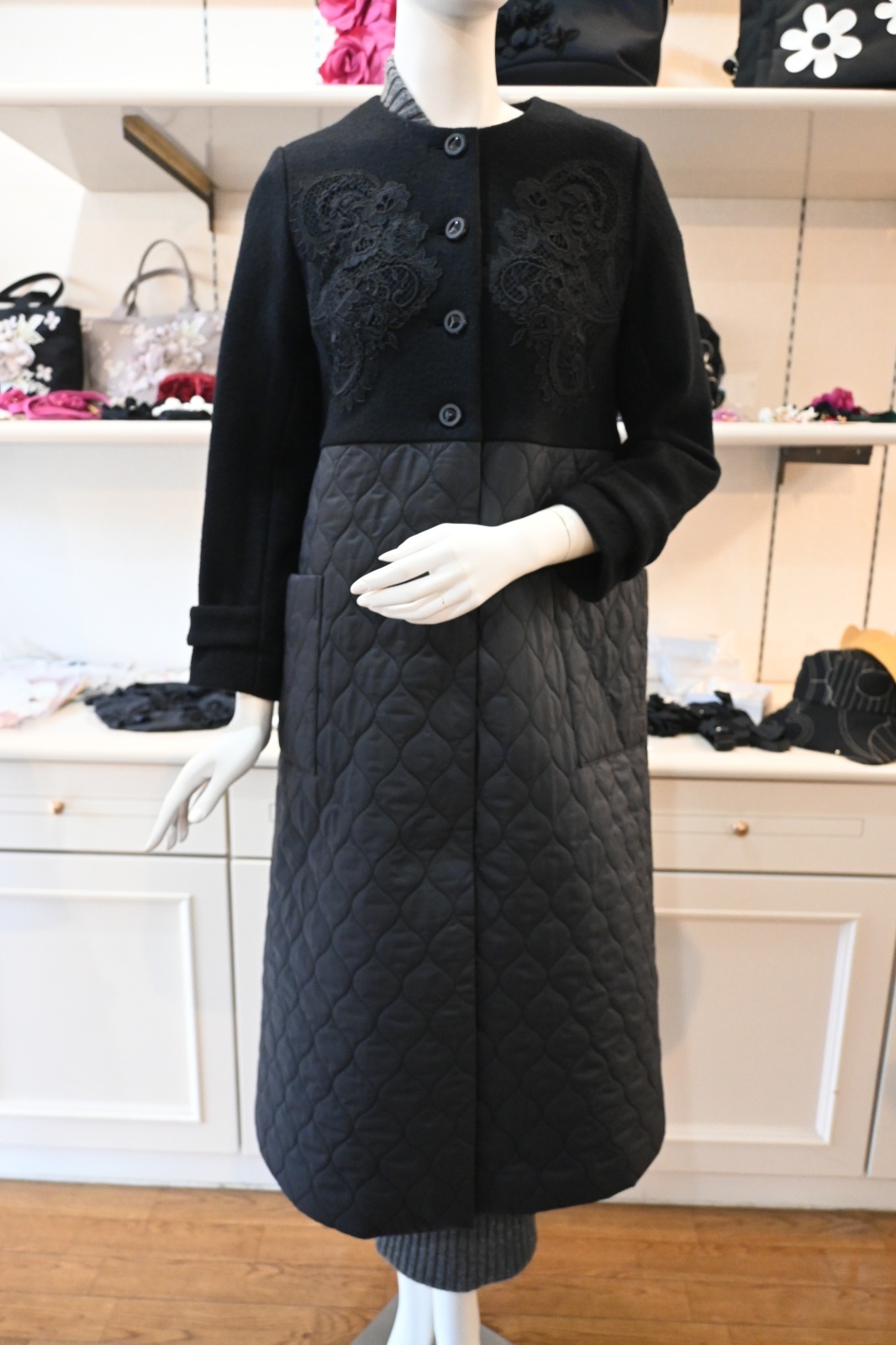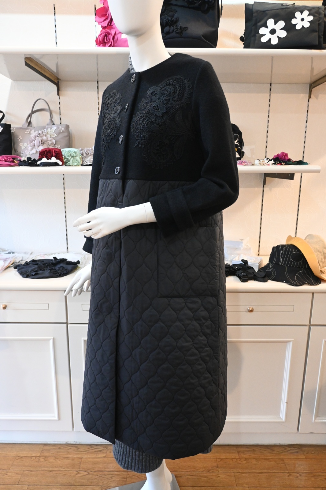 NAPATA MELLOE(ナパータメロエ)ブークレーとキルトを組み合わせたIラインのすっきりコートです。ブークレー共地マフラー付きです。胸元のレースがエレガントです。マフラーをしたりハイネックをを覗かせたりのコーディネートがお楽しみ頂けます。