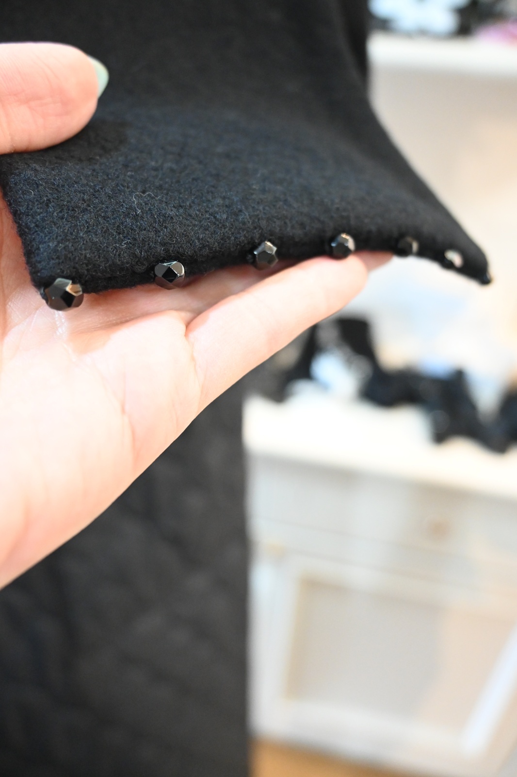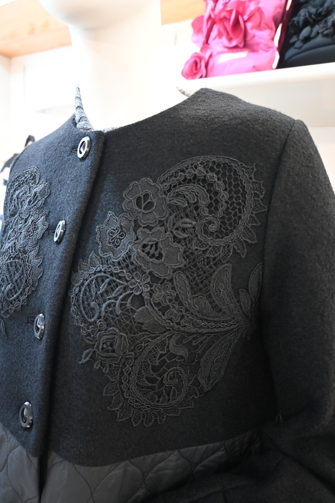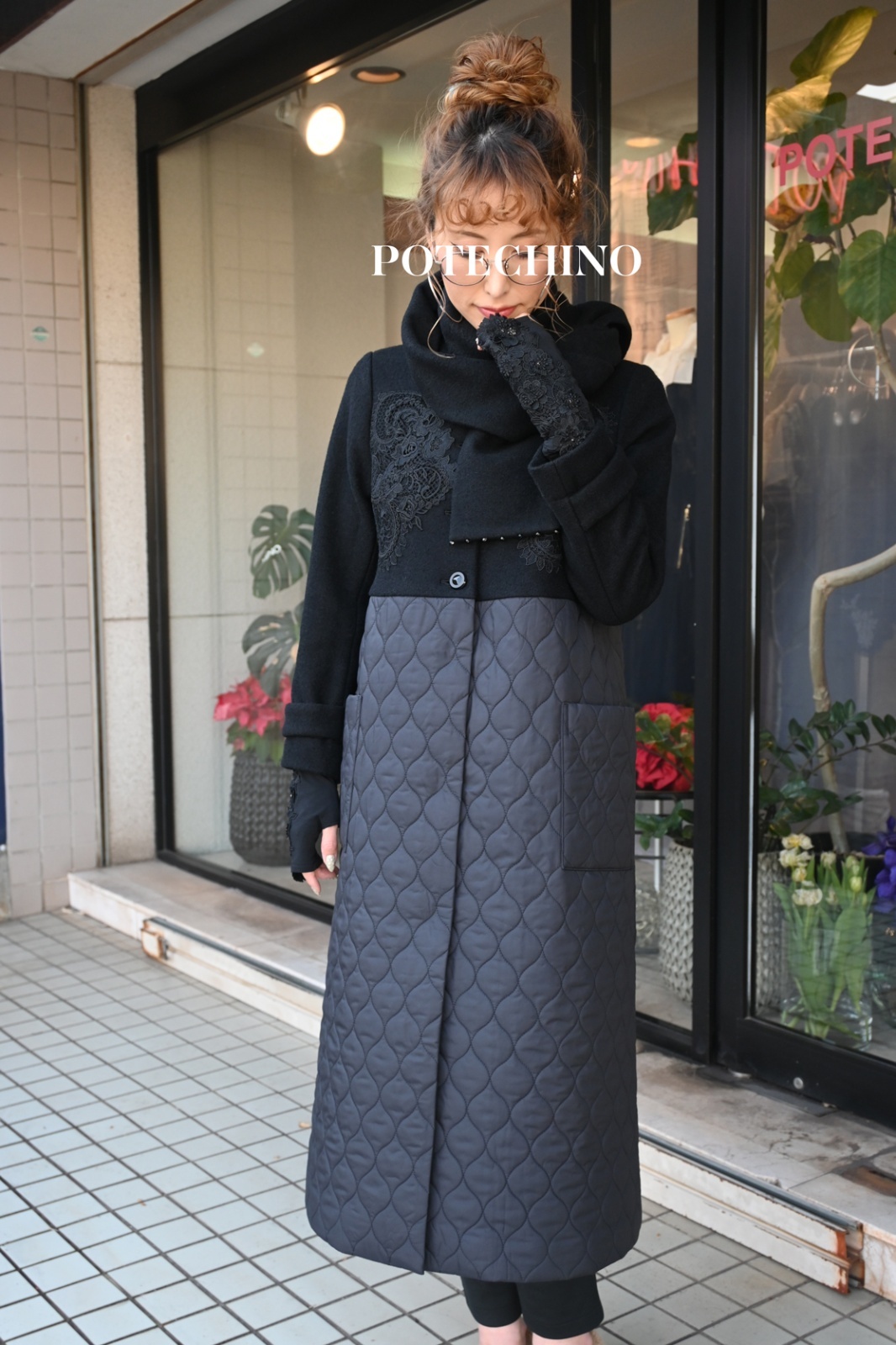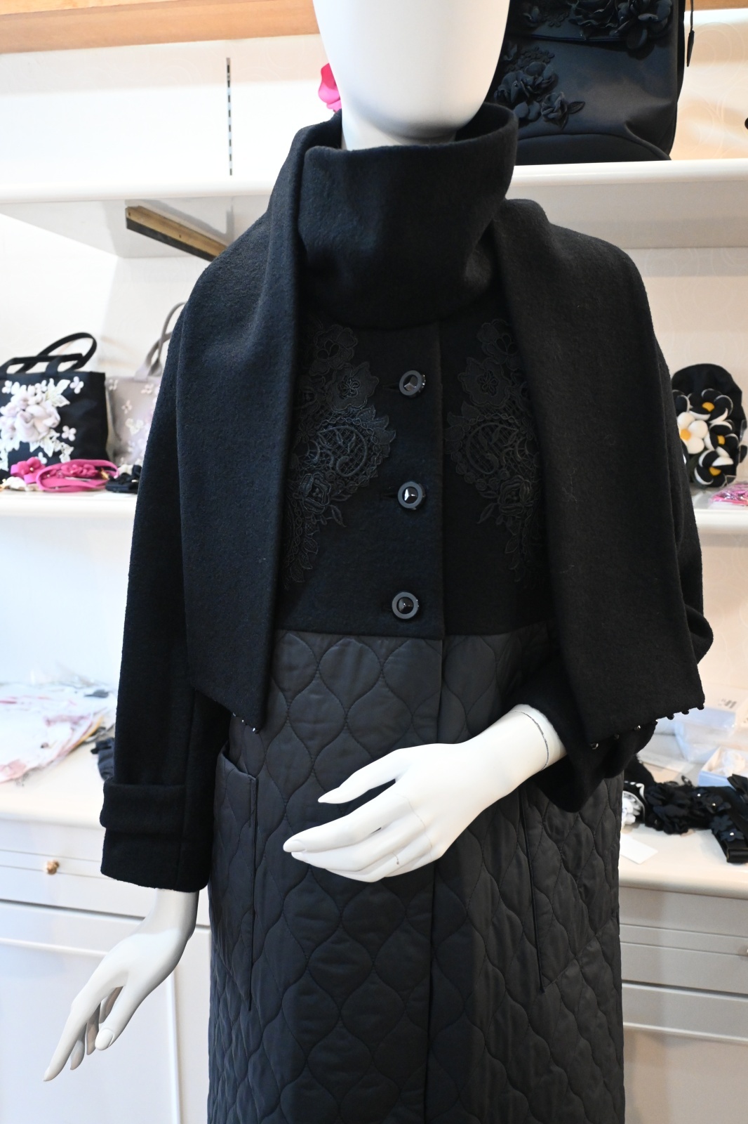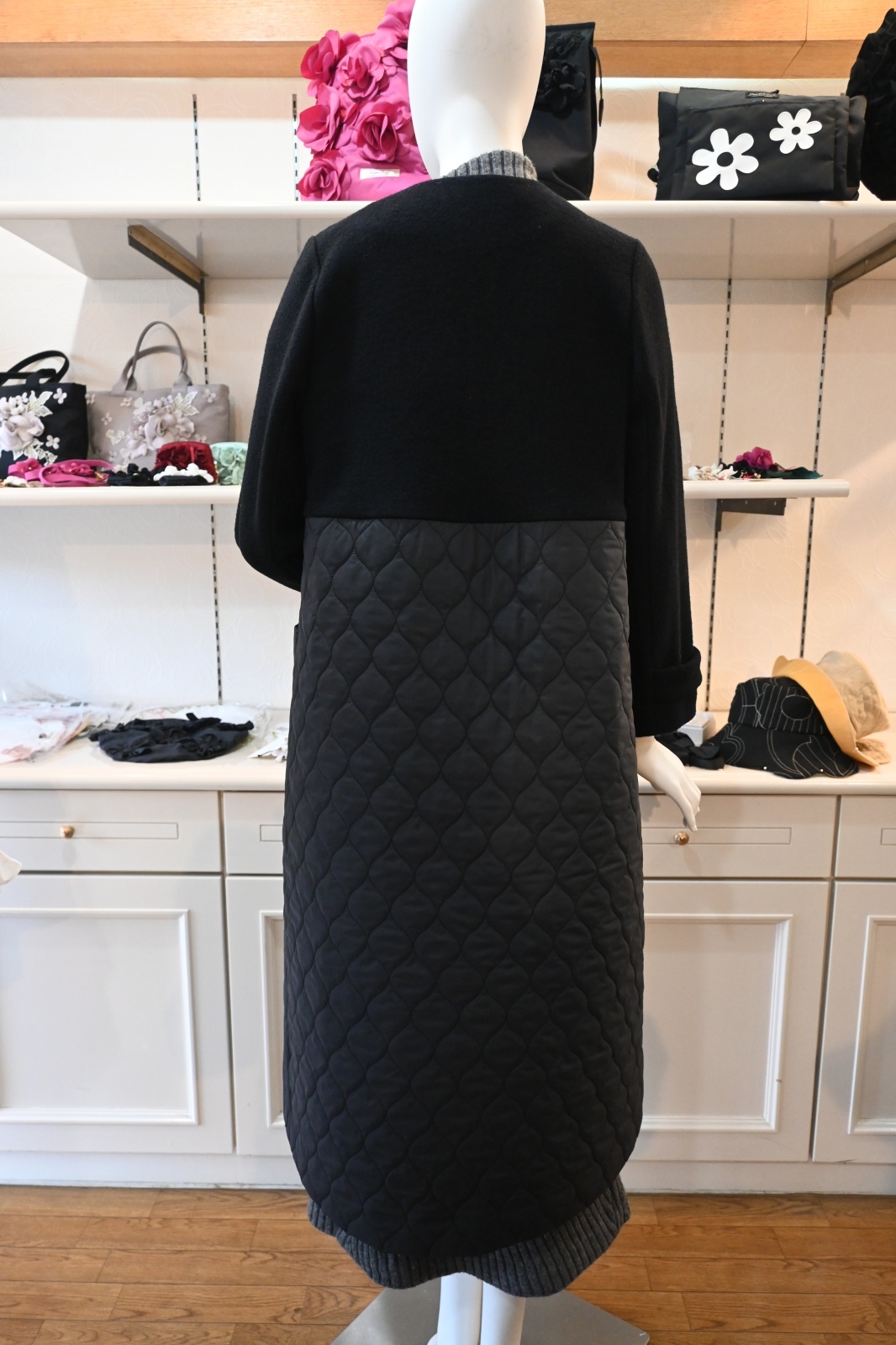 NAPATA MELLOE(ナパータメロエ)ブークレーとキルトを組み合わせたIラインのすっきりコートです。ブークレー共地マフラー付きです。胸元のレースがエレガントです。マフラーをしたりハイネックをを覗かせたりのコーディネートがお楽しみ頂けます。