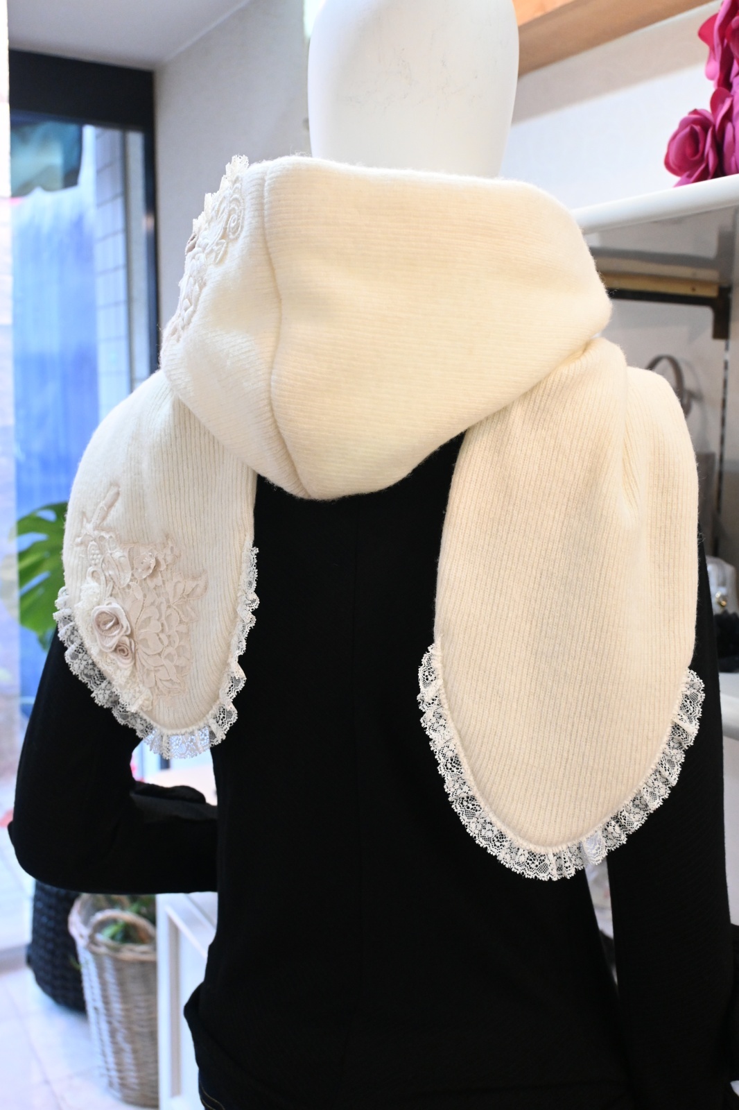 trictrac(トリックトラック)ニット地と綿の三層で仕立てております。裏地には綿100%の天竺を使用しております。耳まですっぽり優しく暖かく包み込んでくれるファッション小物です。