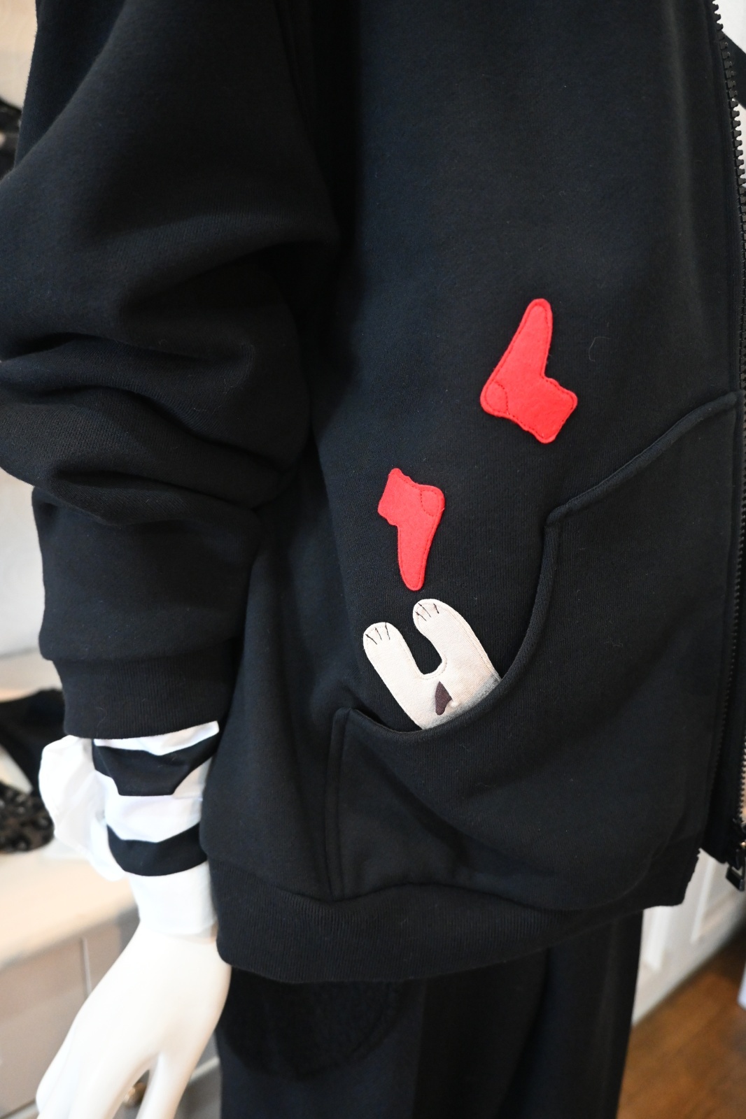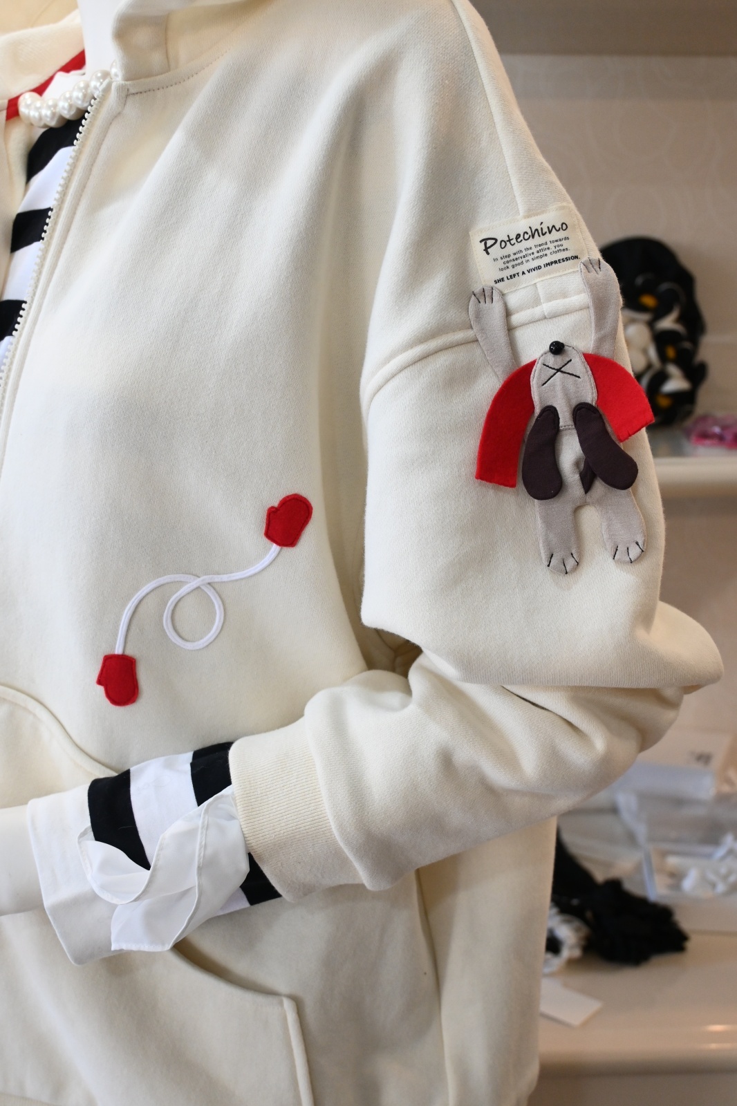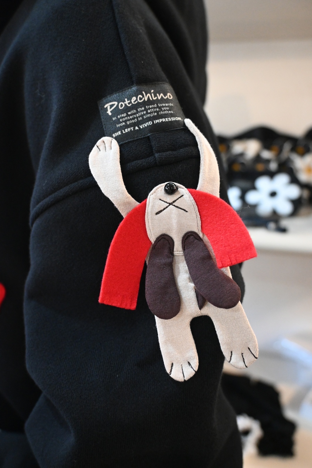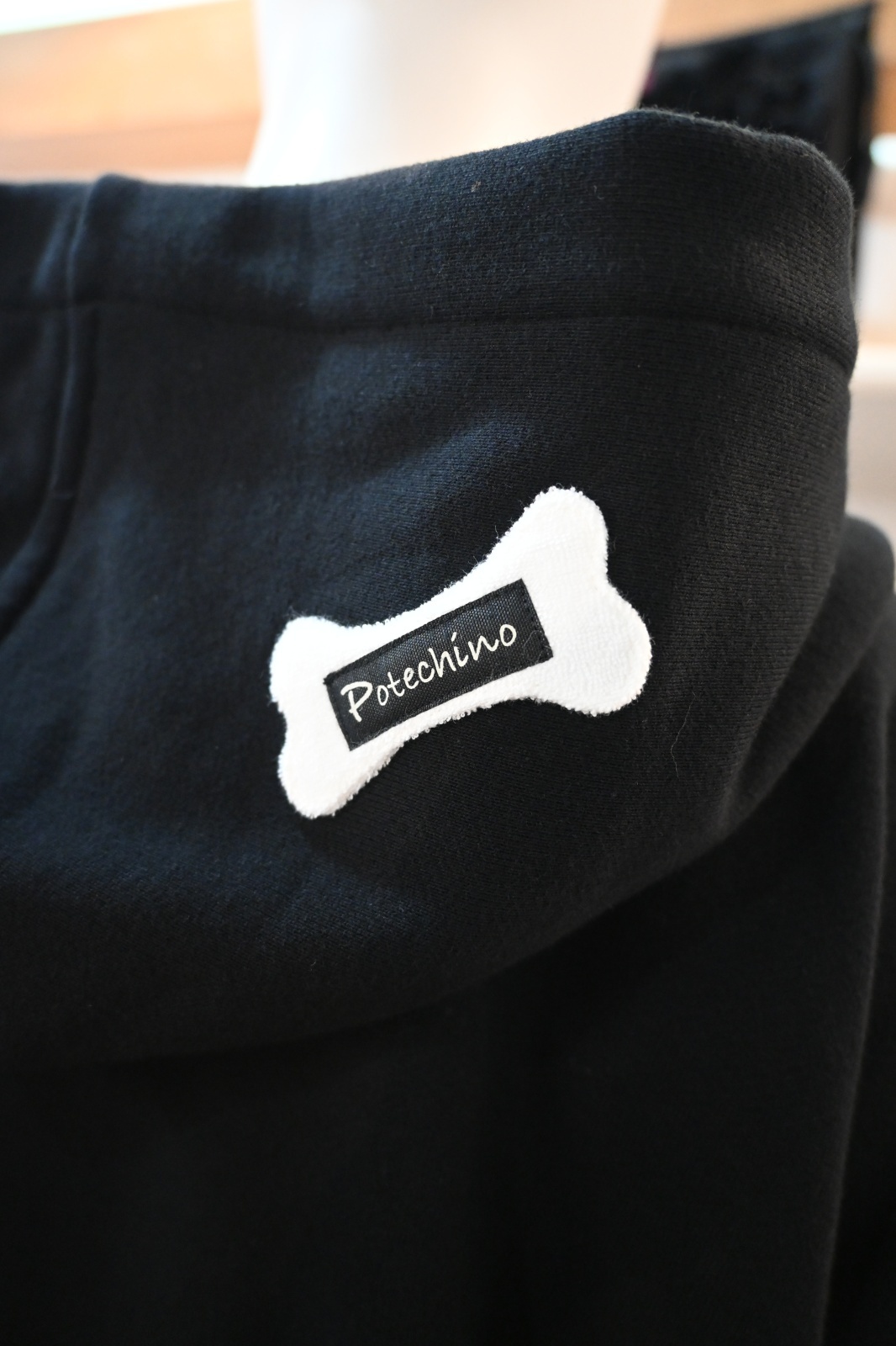 POTECHINO(ポテチーノ)新作パーカーのご紹介です。度目の詰まったクリアな表面感の素材で楽しいパーカーを作りました。風に吹雪かれてを落ちそうなフブケンモチーフを使って隅々に細かな遊びを取り入れました。