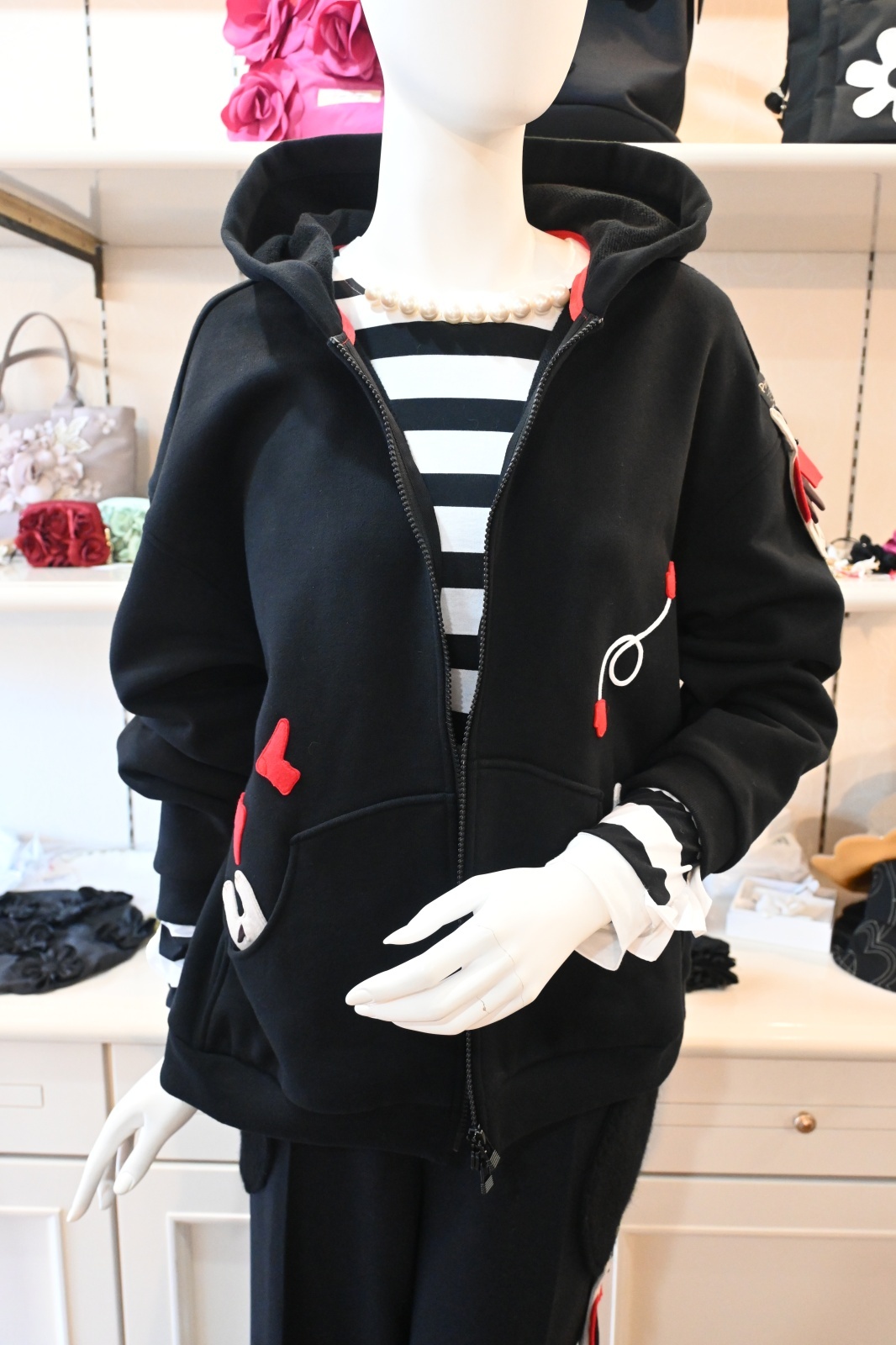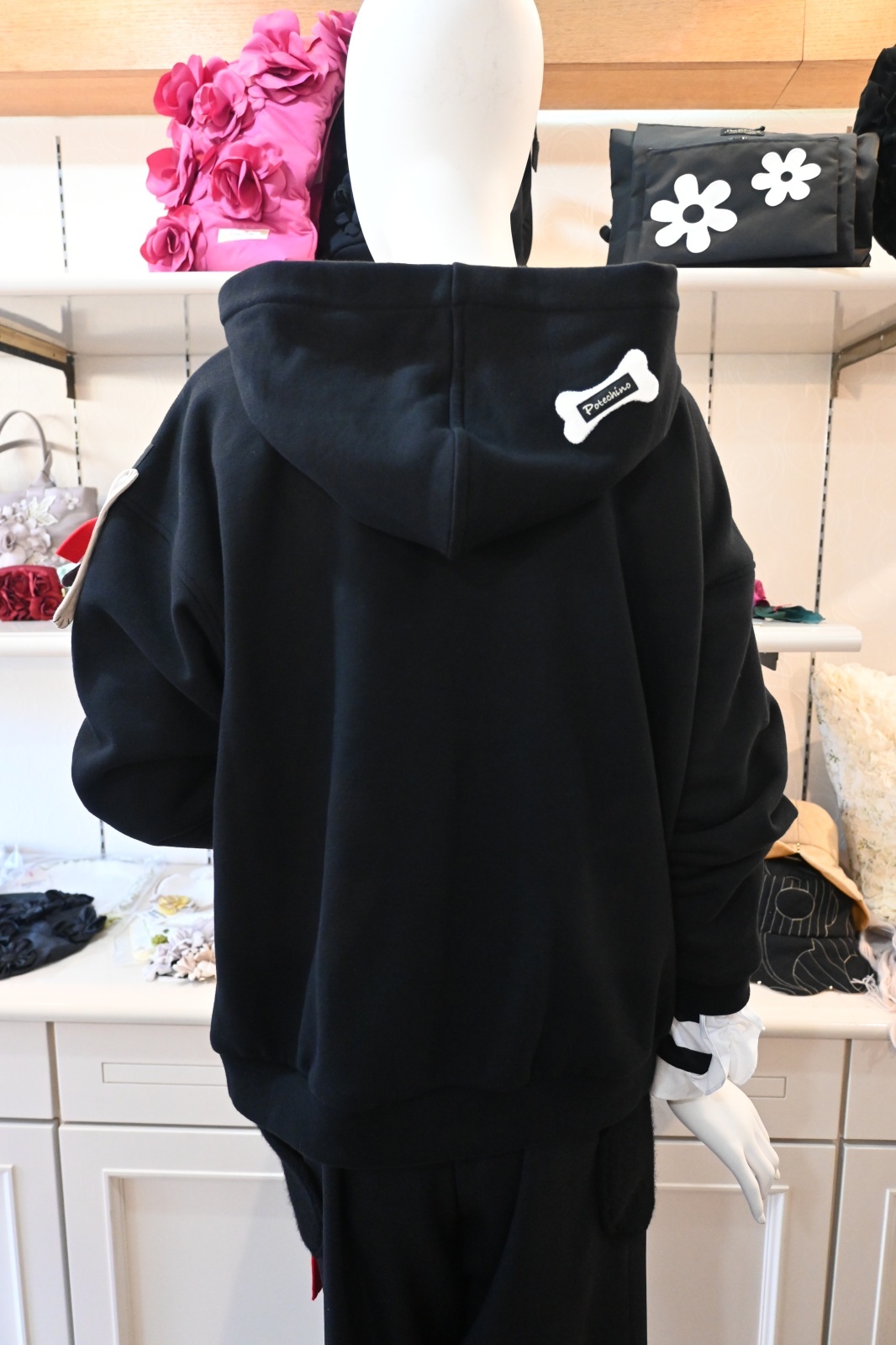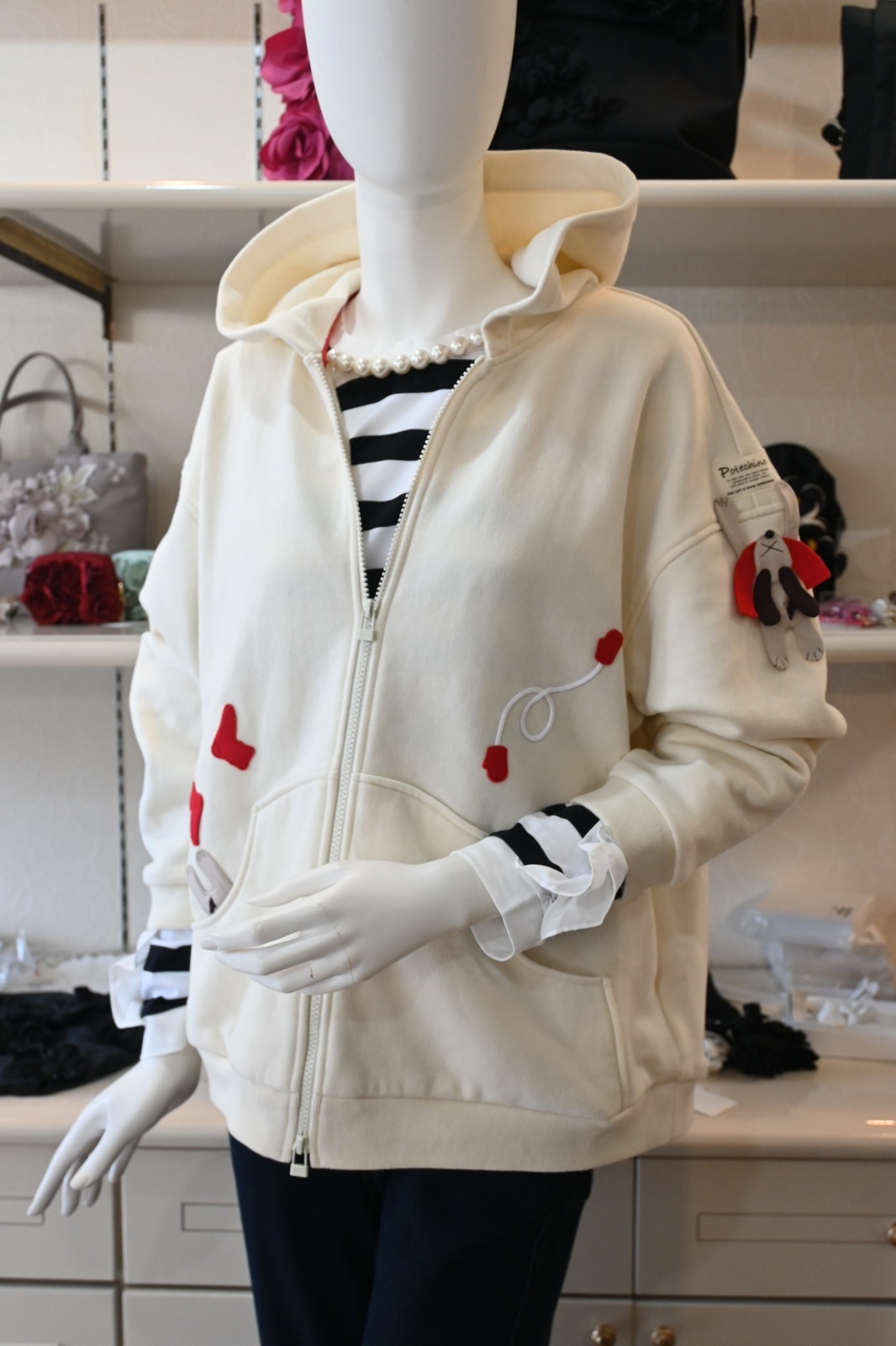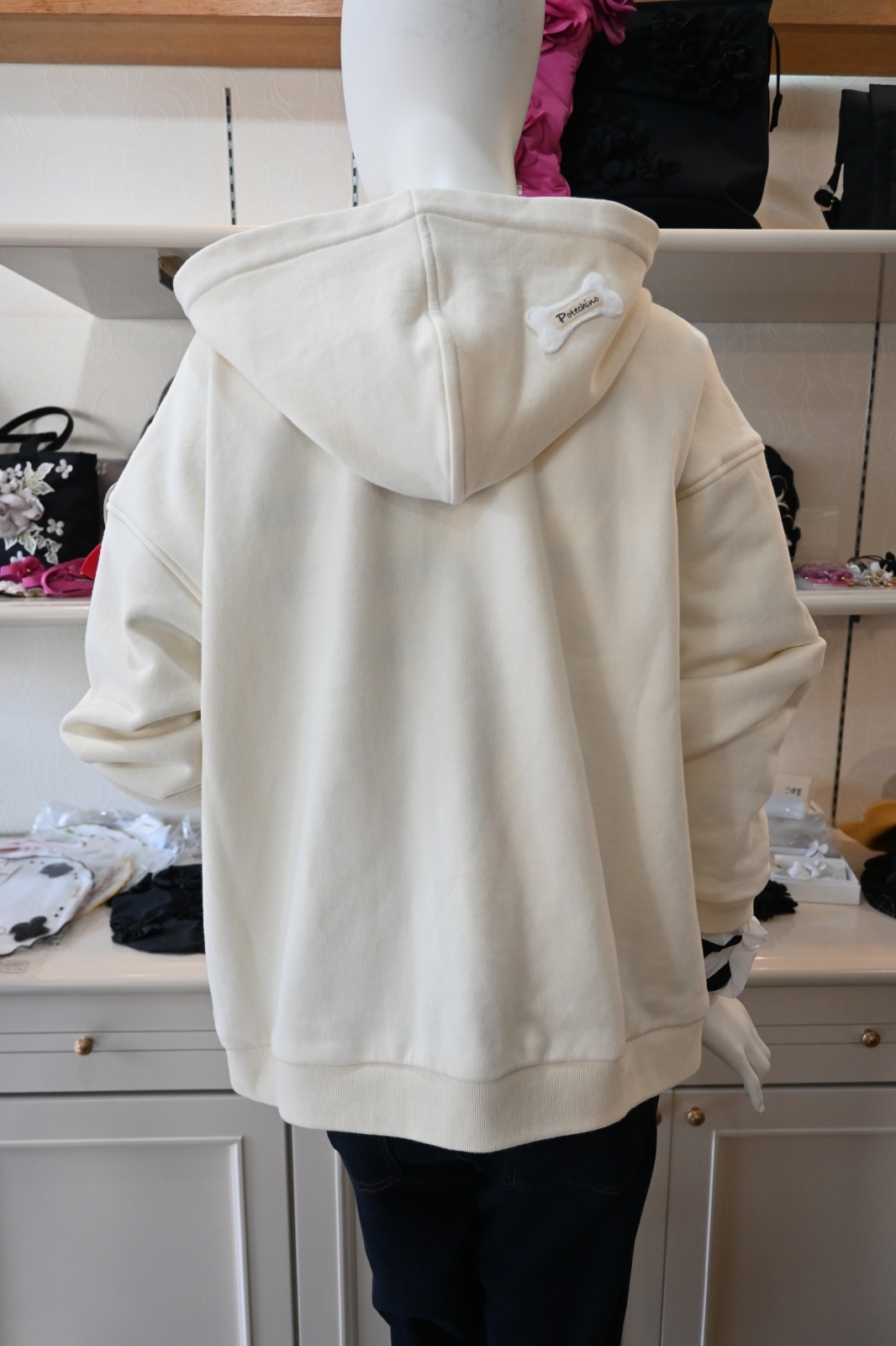 POTECHINO(ポテチーノ)新作パーカーのご紹介です。度目の詰まったクリアな表面感の素材で楽しいパーカーを作りました。風に吹雪かれてを落ちそうなフブケンモチーフを使って隅々に細かな遊びを取り入れました。