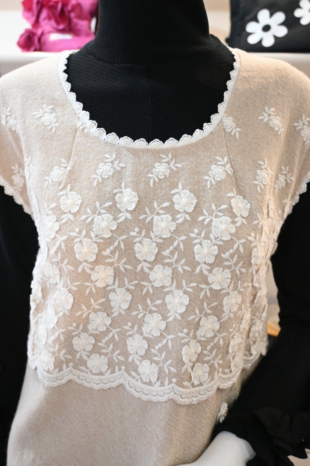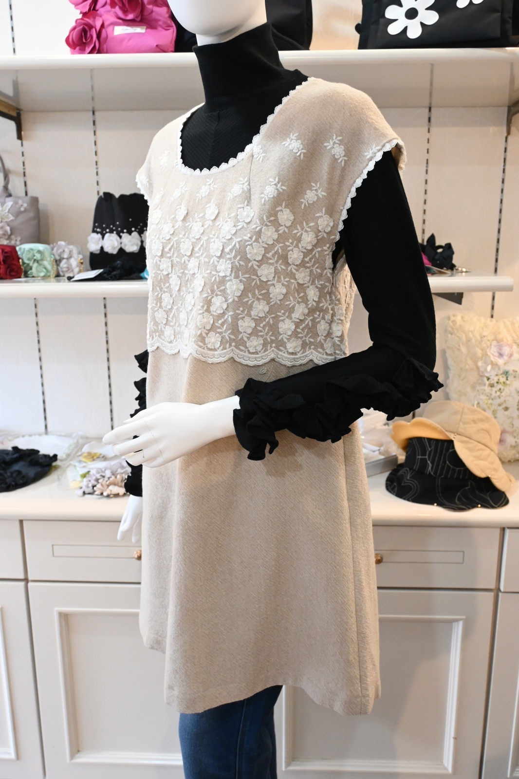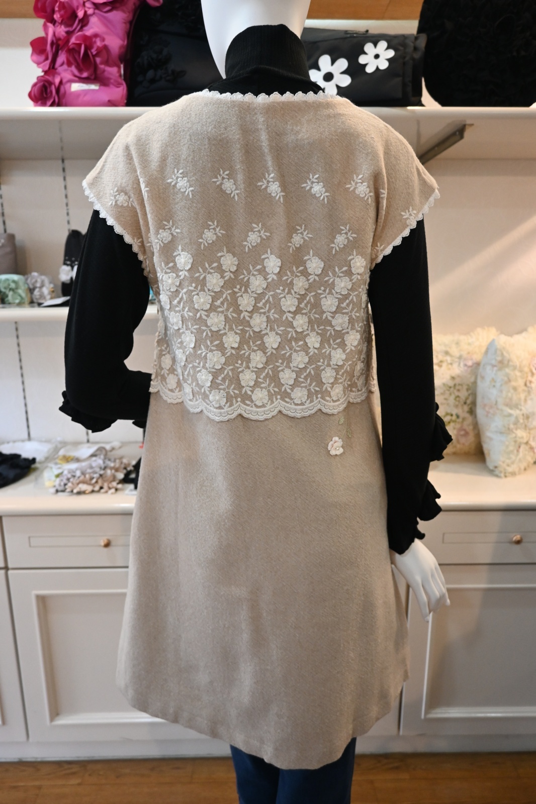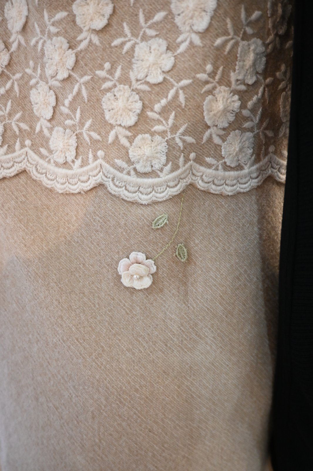 | 素材 | 基布:毛100% 刺繍:毛50% アクリル50% 裏地:ポリエステル100% レース:綿 |