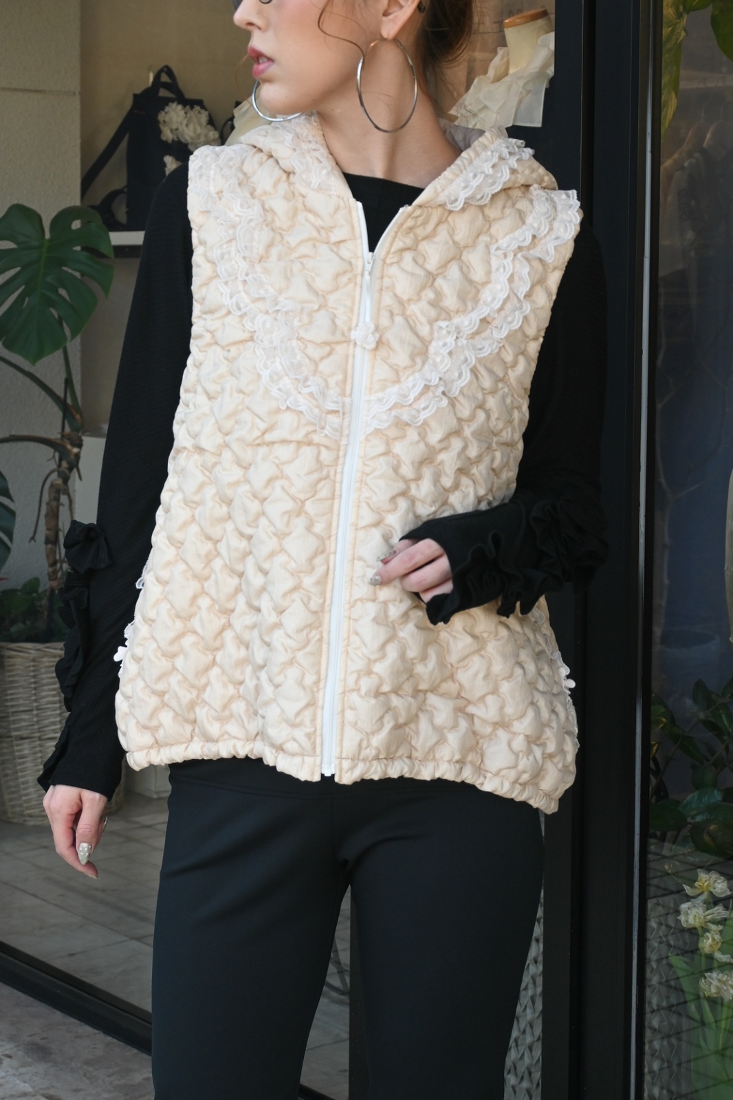 HISCHRONE(ヒスクローネ)裾周りをストレッチコードで調節できる仕様のベストです。適度なゆとり感で、ブラウスともコーディネートして頂けます。ファスナー横の見返しはコットンのエンプロイダリーレースを使って、開いたときにもレースが華やかです。