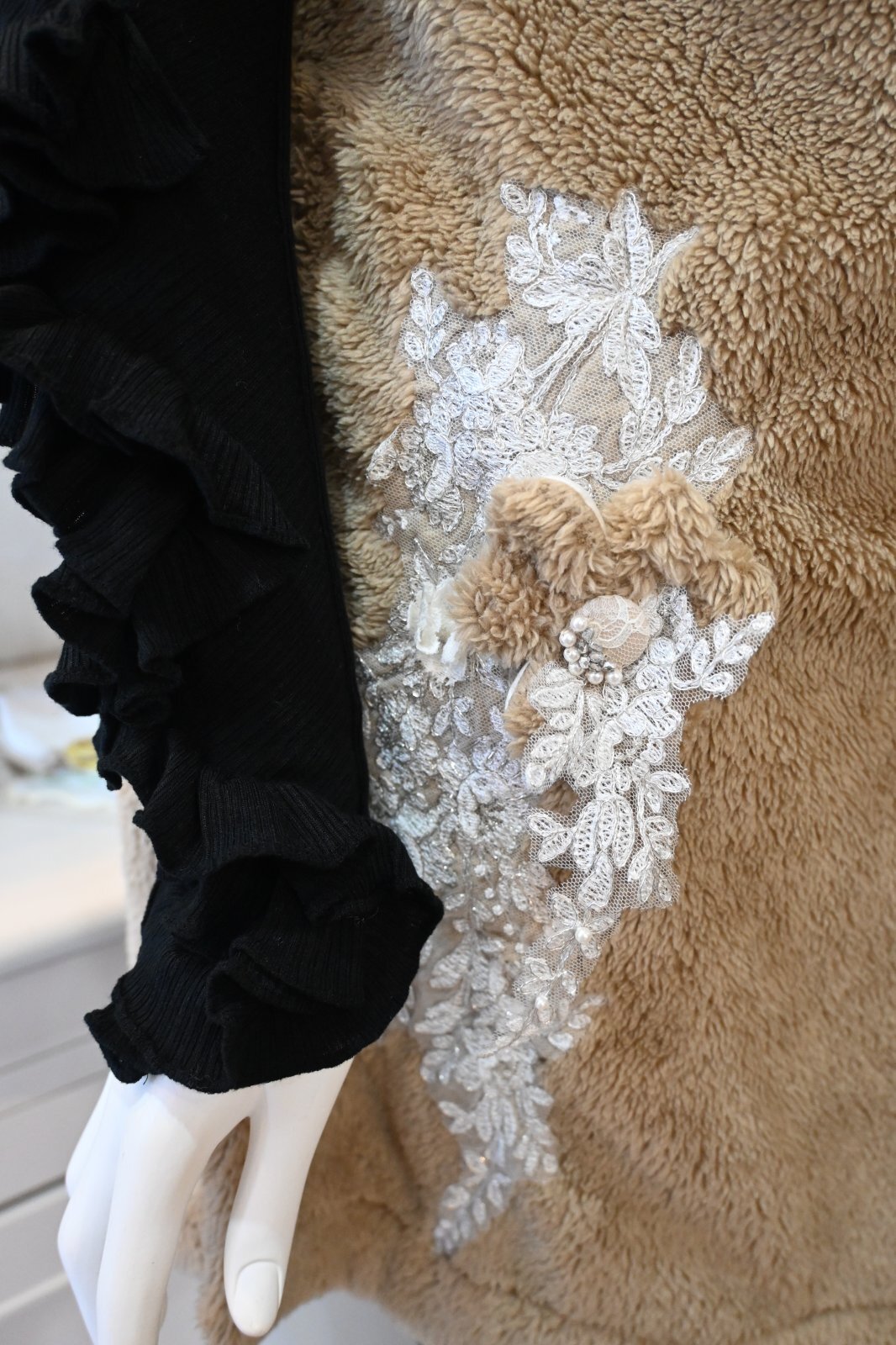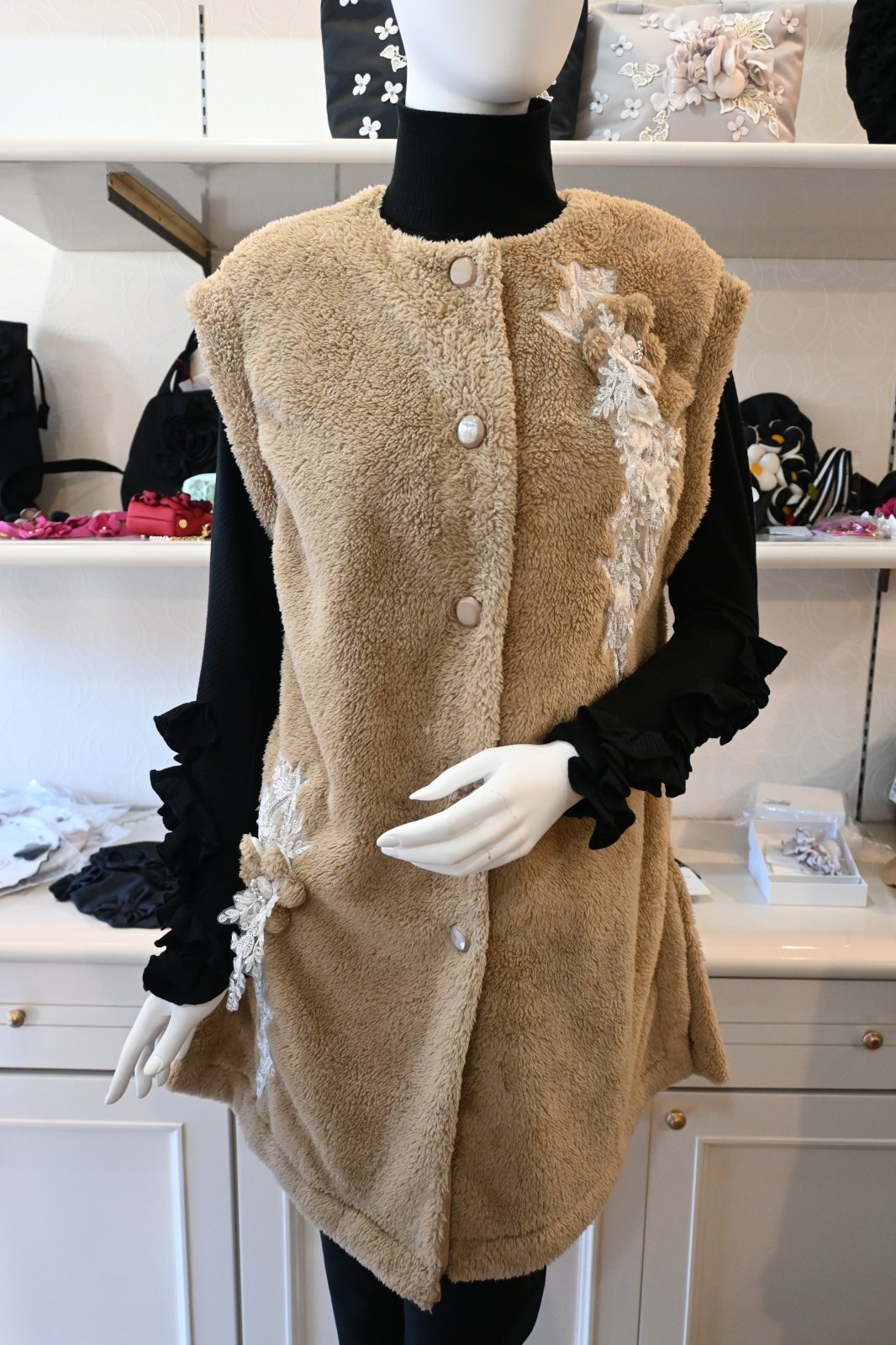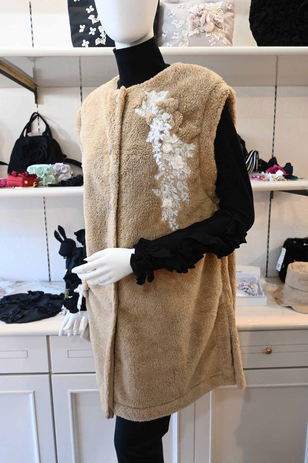 HISCHRONE(ヒスクローネ)暖かみのあるモコモコフリースのベストです♪軽くて暖かいおすすめの1枚です。立体のお花モチーフから溢れ落ちるシャイニーなレースがポイントです。