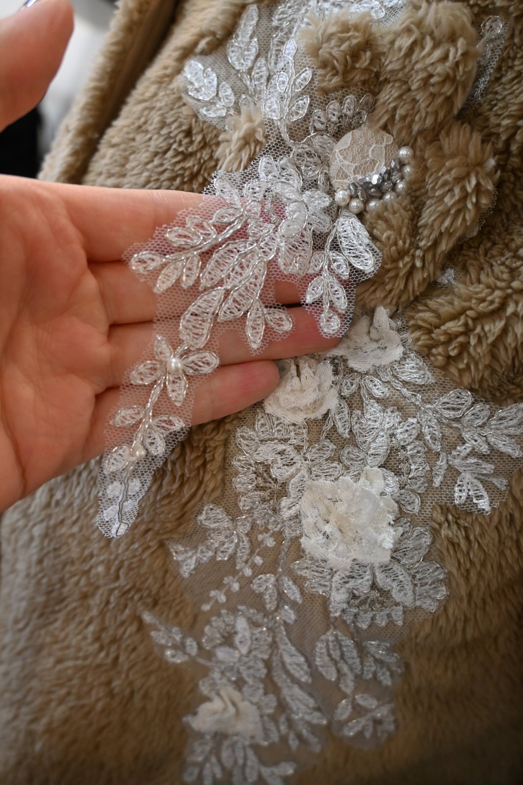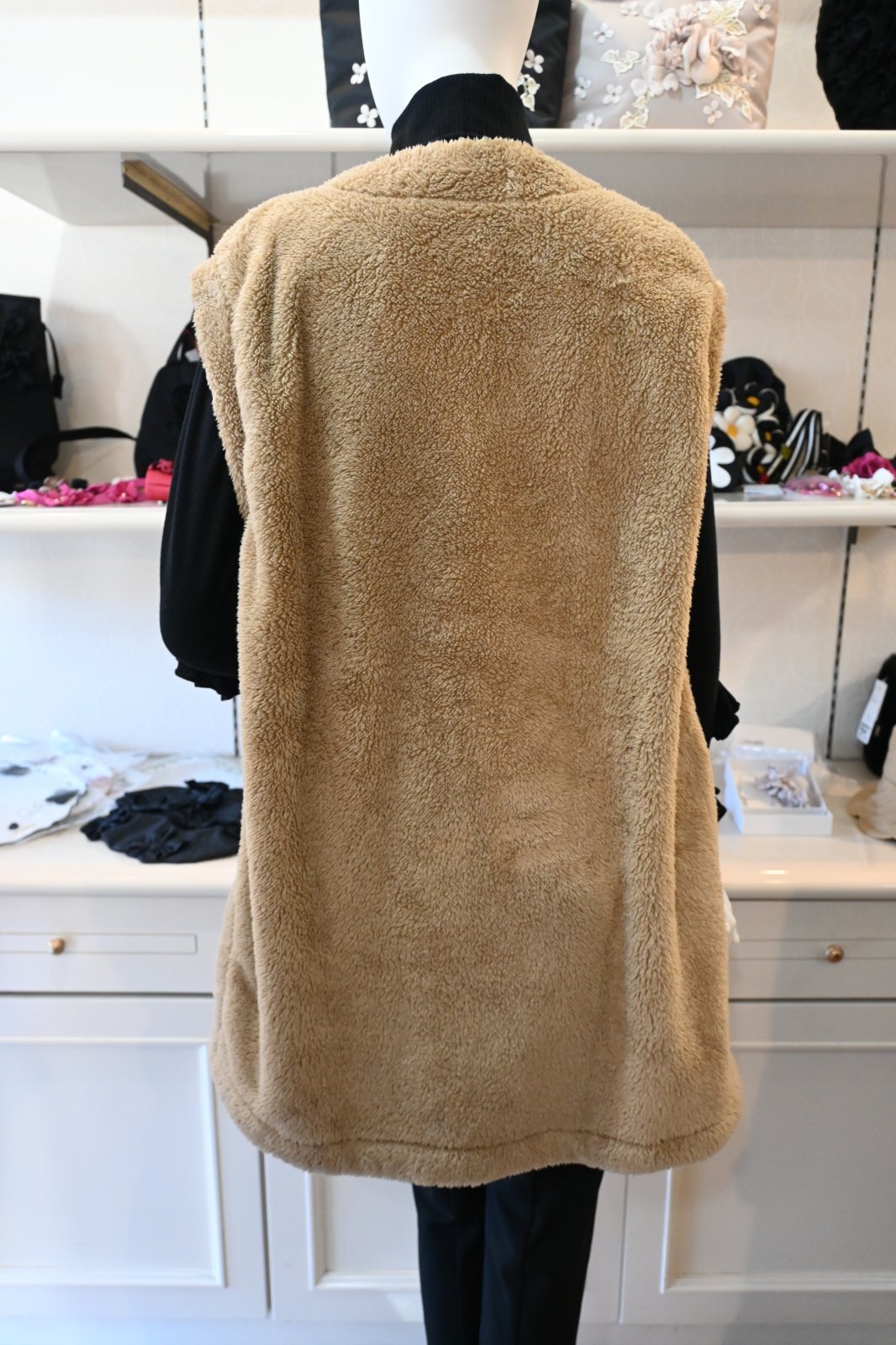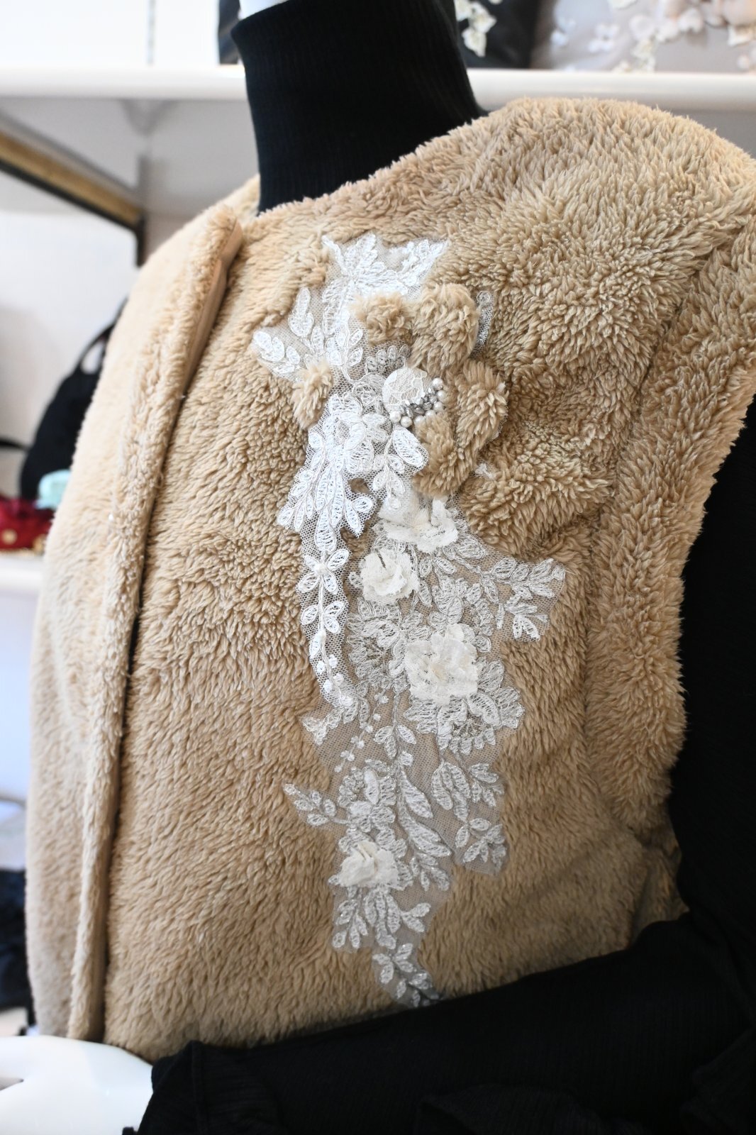 HISCHRONE(ヒスクローネ)暖かみのあるモコモコフリースのベストです♪軽くて暖かいおすすめの1枚です。立体のお花モチーフから溢れ落ちるシャイニーなレースがポイントです。