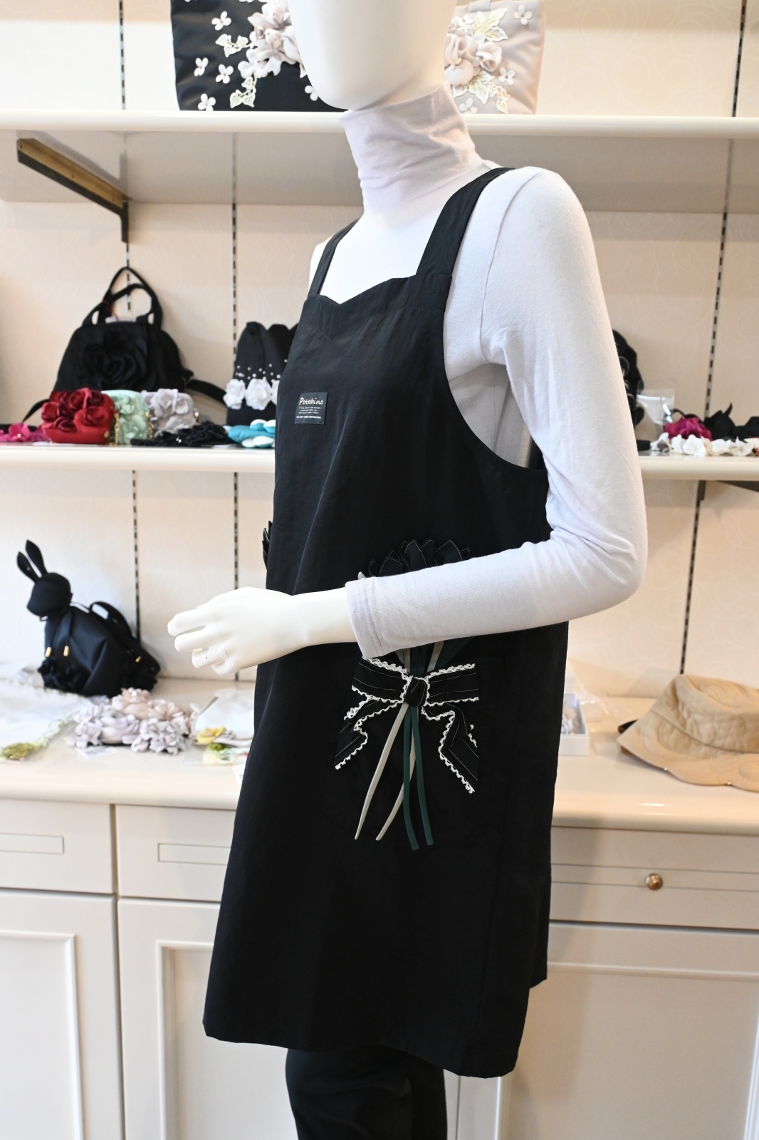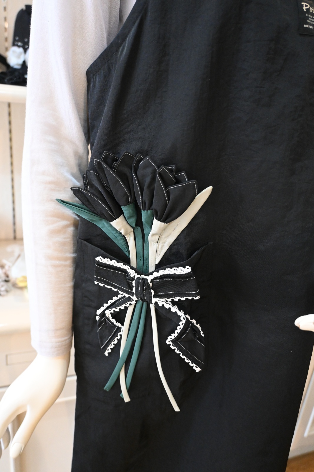 POTECHINO(ポテチーノ)ポケットにチューリップの花束、後ろのリボンがとてもかわいい、大人気の定番エプロンです。スッキリ見えるラインもうれしいですね!
