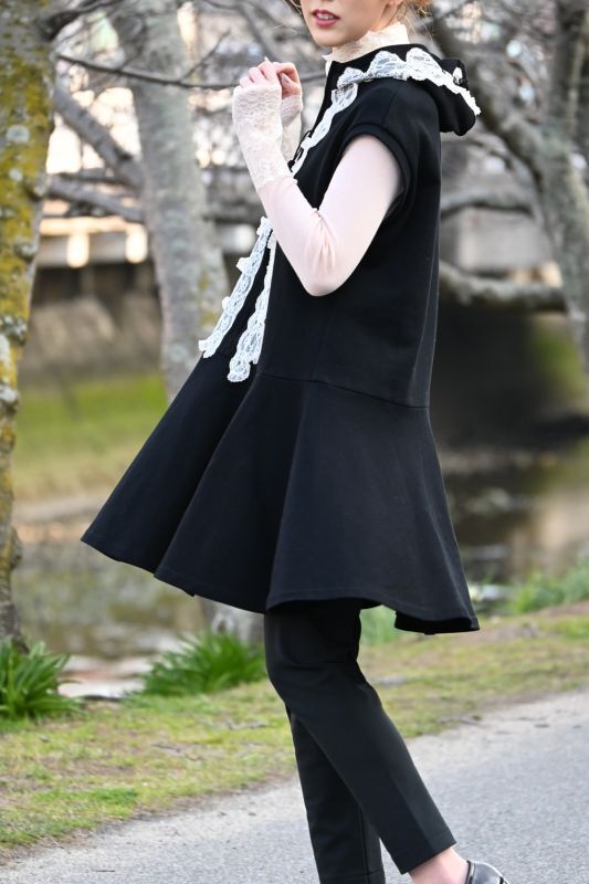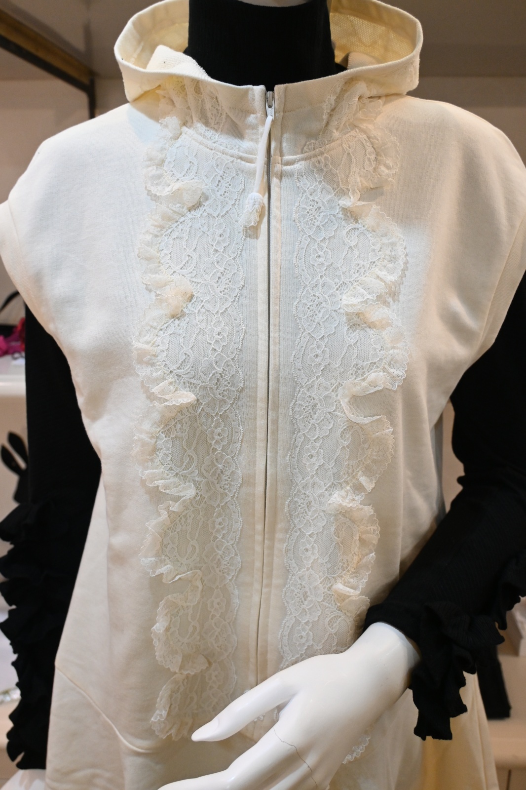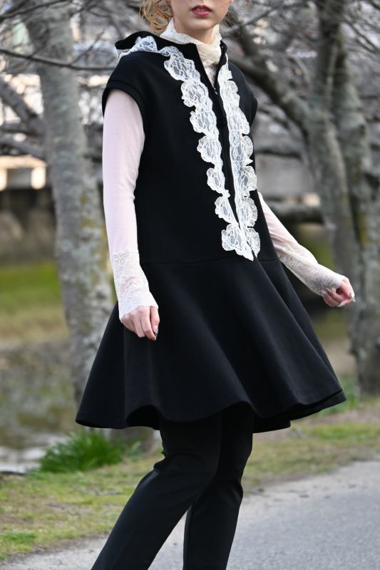 HISCHRONE(ヒスクローネ)ロマンテックなリバーレースとリボン刺繍がポイントのチュニック丈のベストです。軽やかなフレアフリルで着になるヒップ回りを隠してくれます。