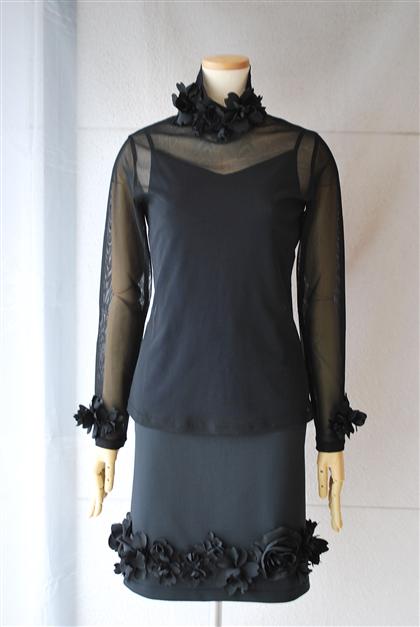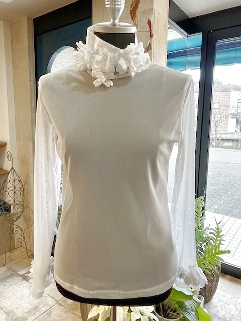 RainDance(レインダンス)レインダンスのチュールカットソーをご紹介。衿元 袖口に施されたフラワーモチーフは人気のモチーフ使いです。