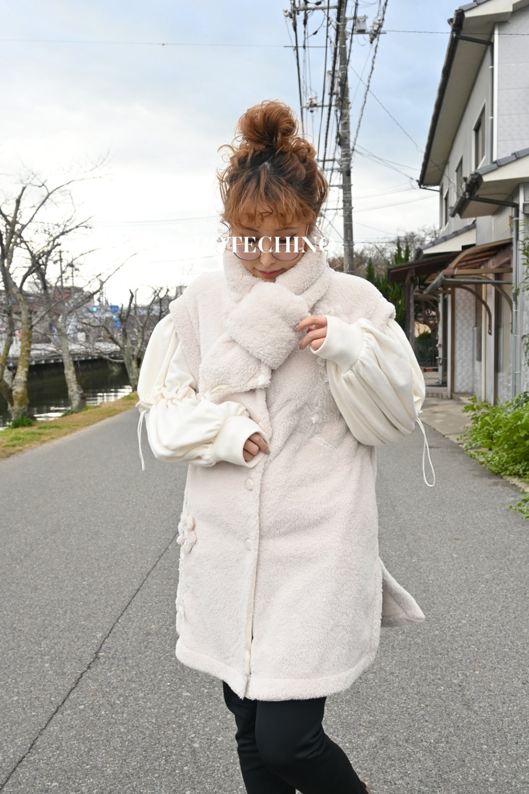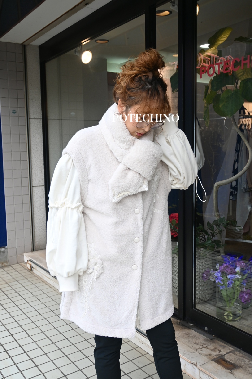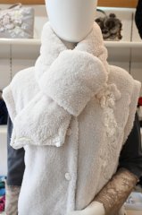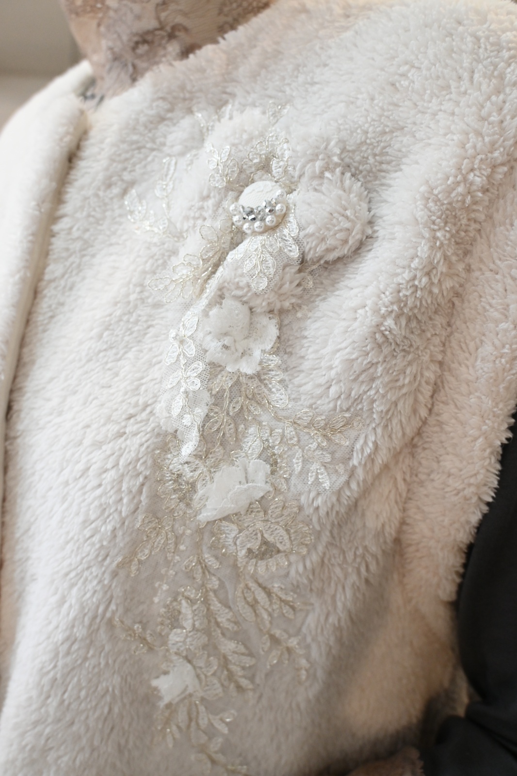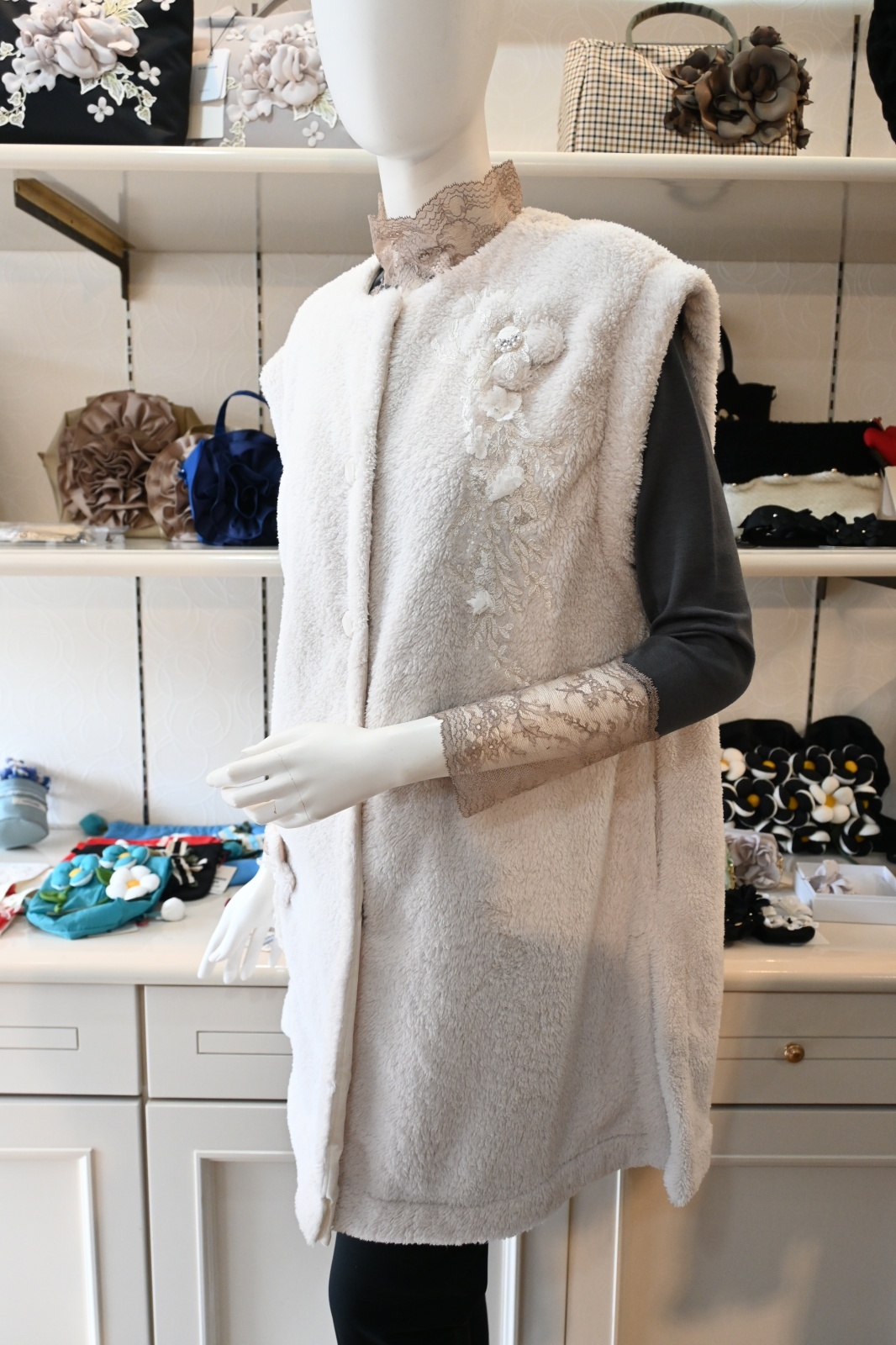 HISCHRONE(ヒスクローネ)暖かみのあるモコモコフリースのベストです♪軽くて暖かいおすすめの1枚です。立体のお花モチーフから溢れ落ちるシャイニーなレースがポイントです。