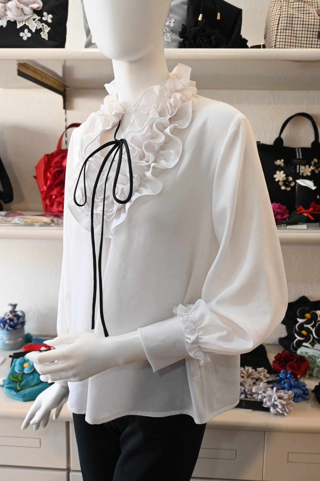 NAPATA MELLOE(ナパータメロエ)襟と胸元にフリルをあしらった華やかなブラウス。ストレッチジョーゼットのため着やすくジャンパースカートやパンツとコーディネートできます。