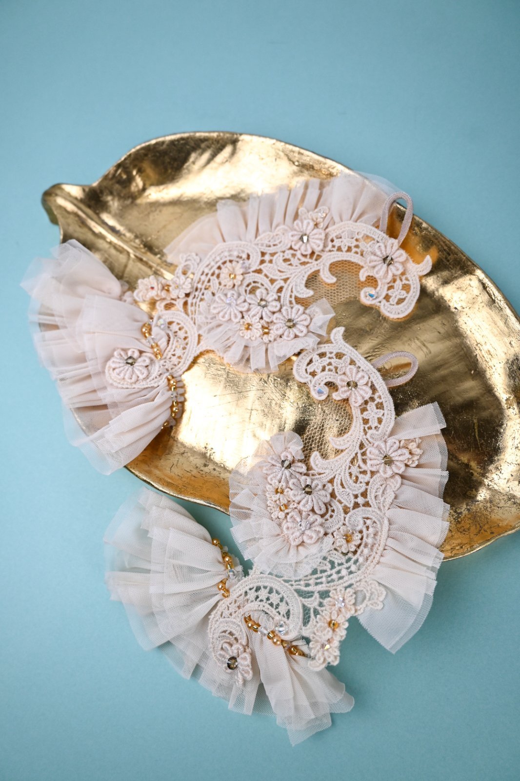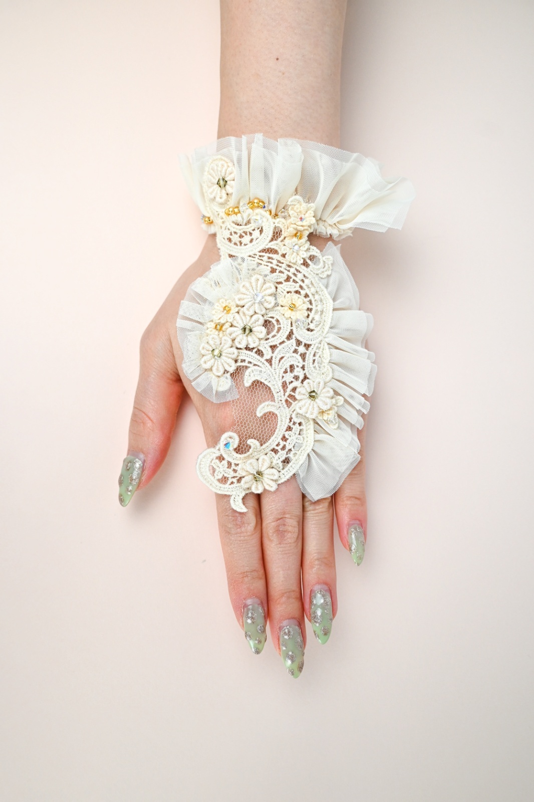 HISCHRONE(ヒスクローネ)エレガントなレースに小花モチーフを重ねてスワロフスキービーズを一粒づつのせ輝きを増しました!!ポイントになるアクセサリーです