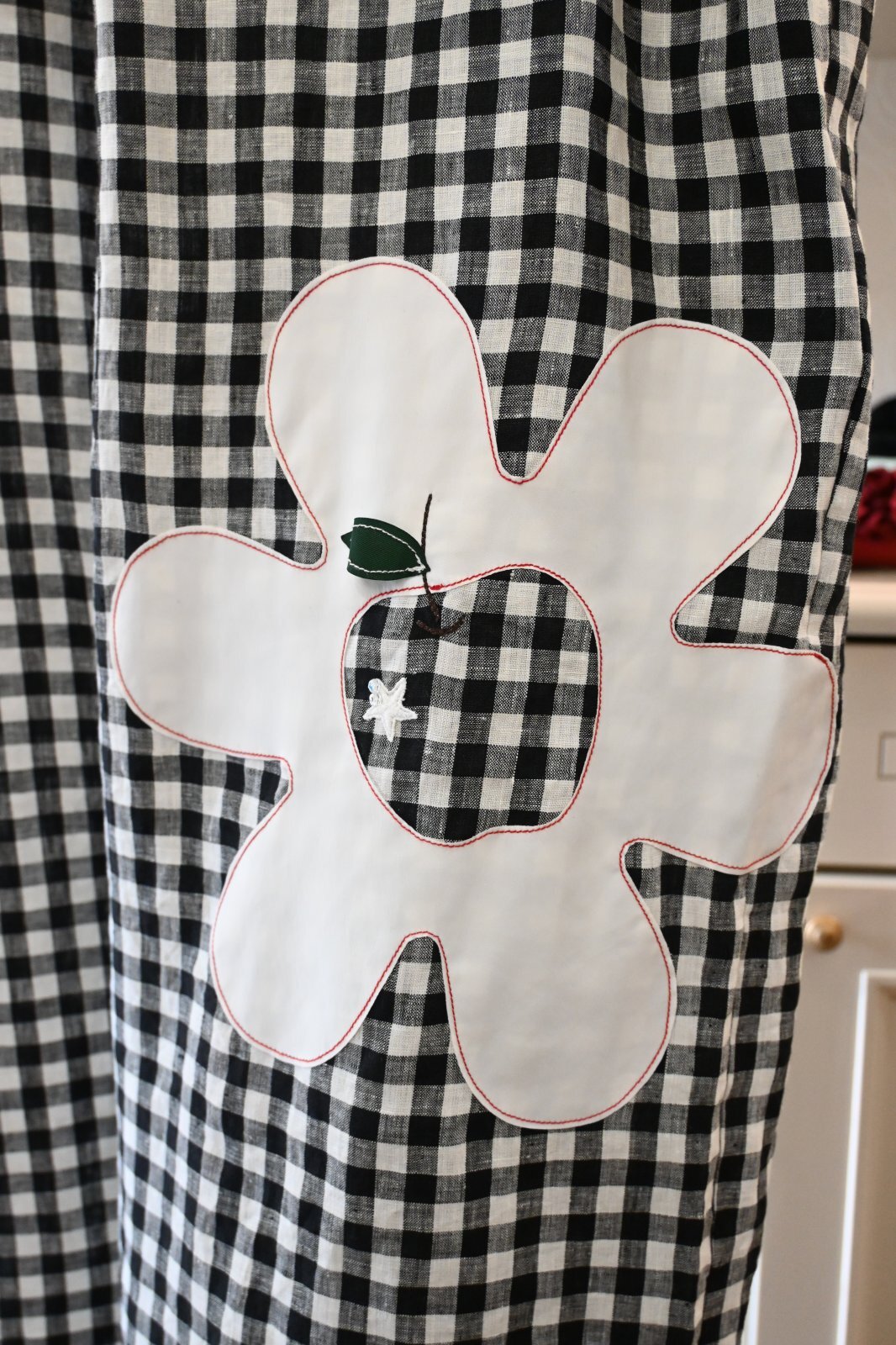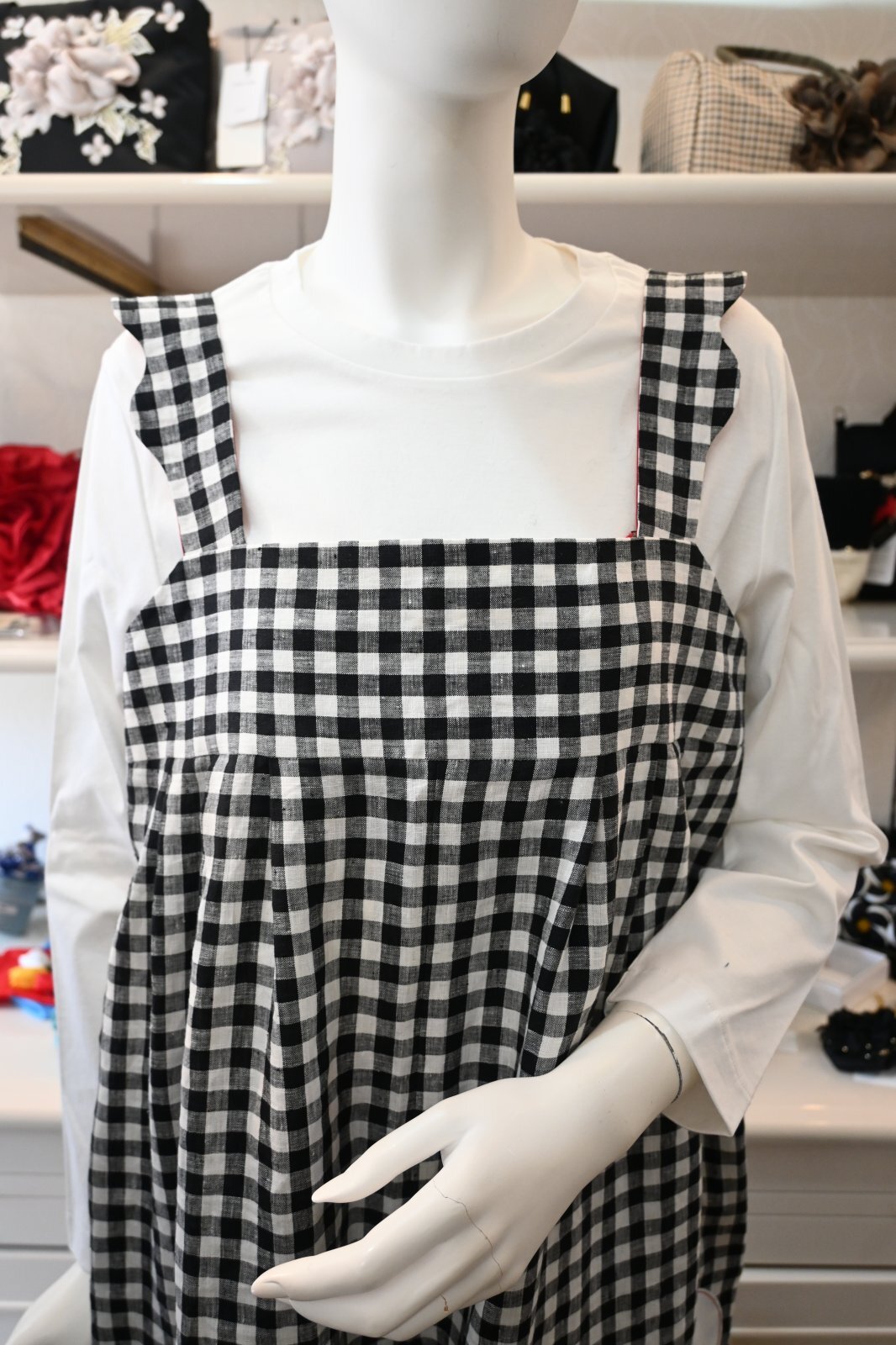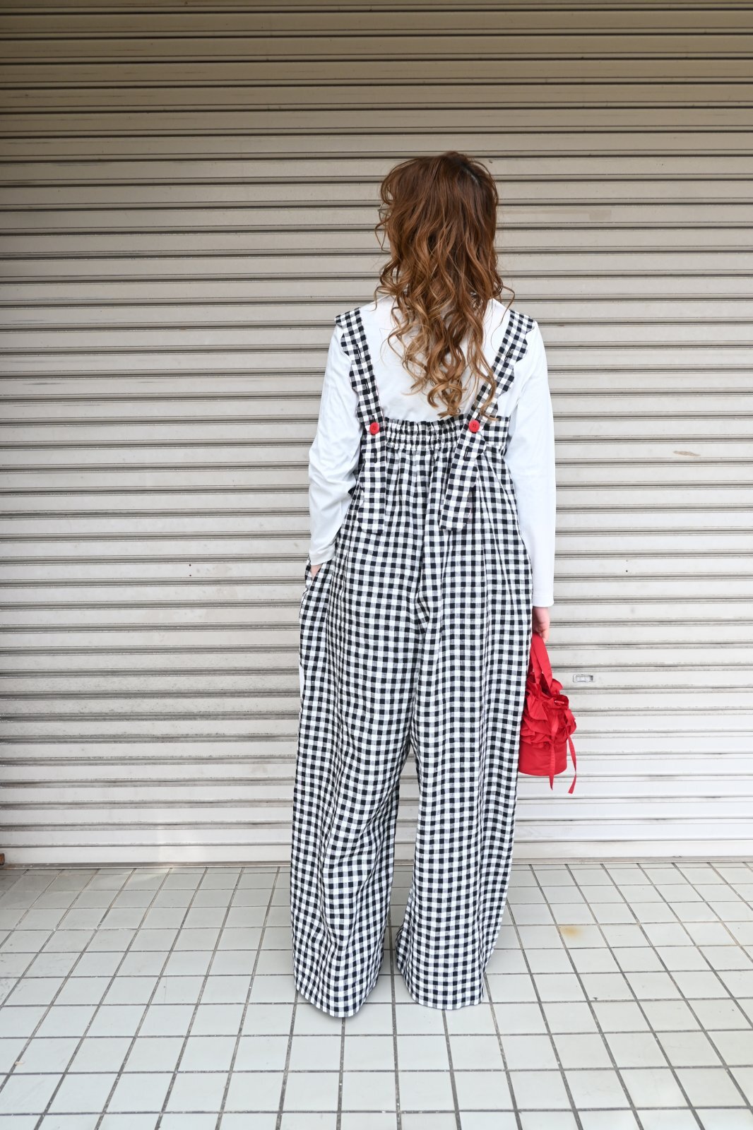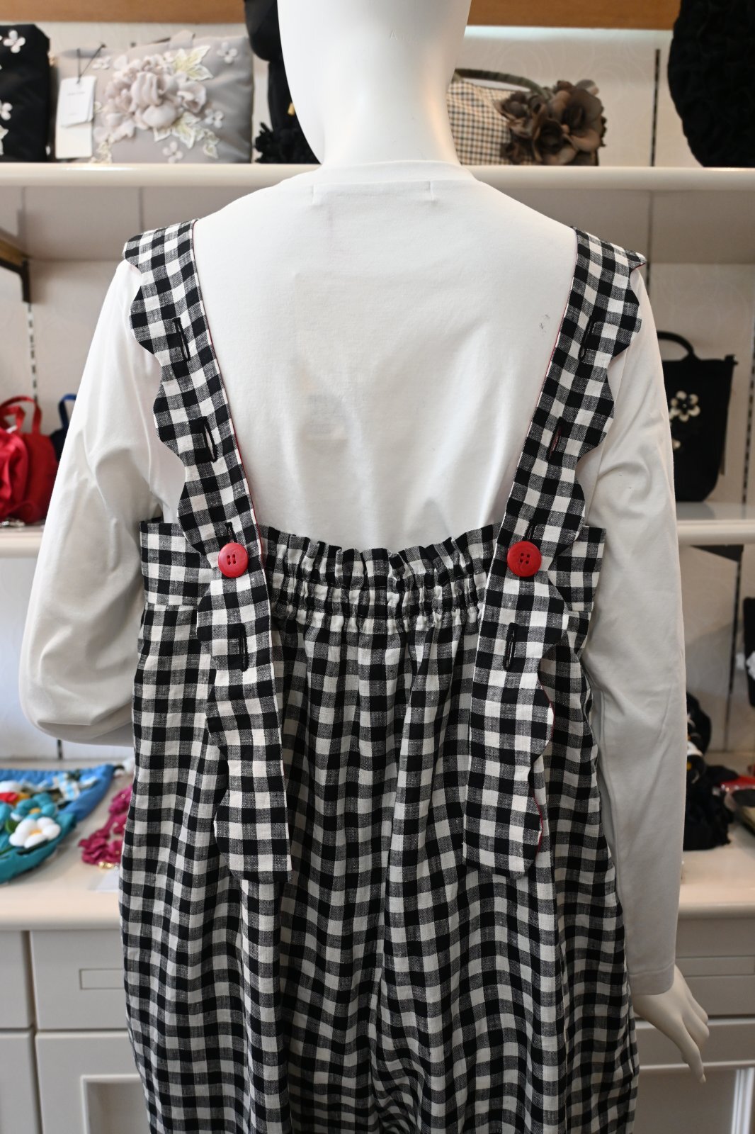 POTECHINO(ポテチーノ)リネン素材の通気性の良いサロペット。肩紐の長さは後ろのボタンで調節出来ます。スカラデザインの裏側のカラーをアクセントに!