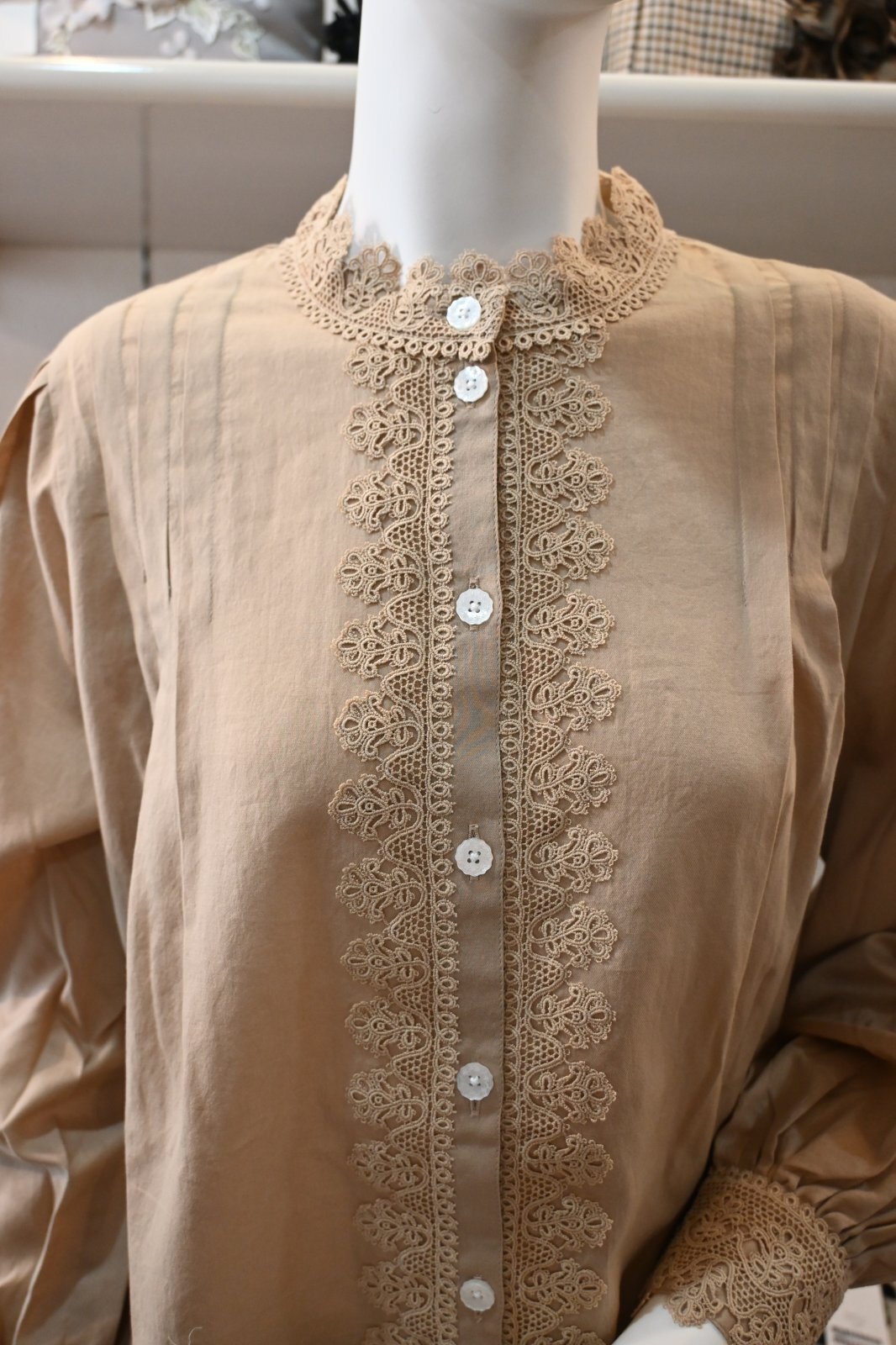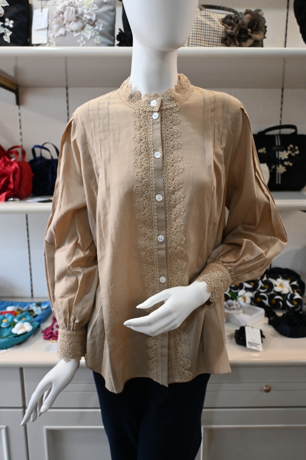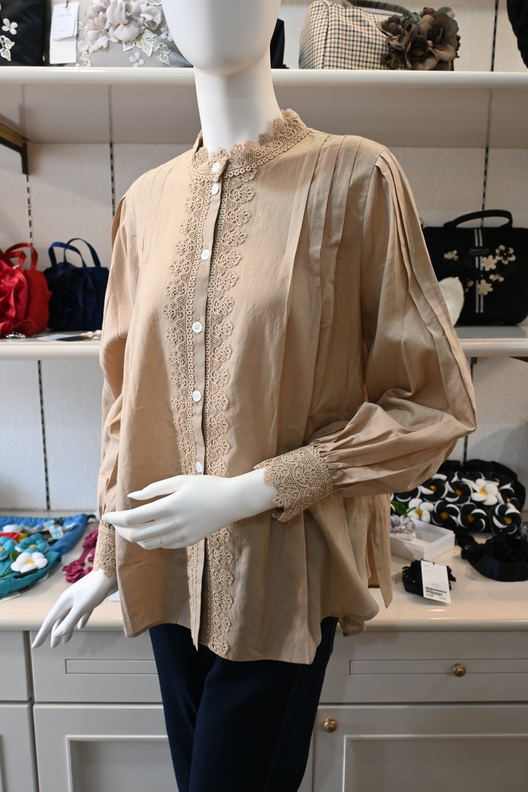 ANLICO(アンリコ)綿のブラウスをご紹介です。クラシックなレース使いが素敵な1枚です。