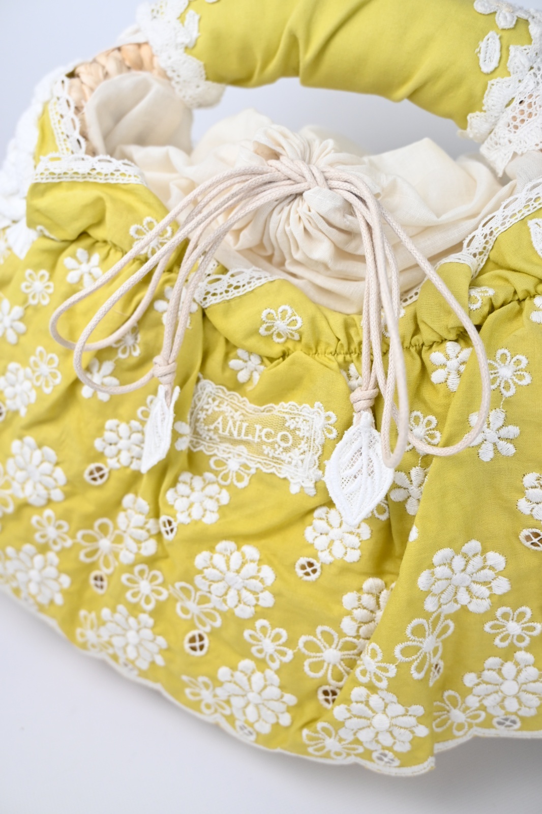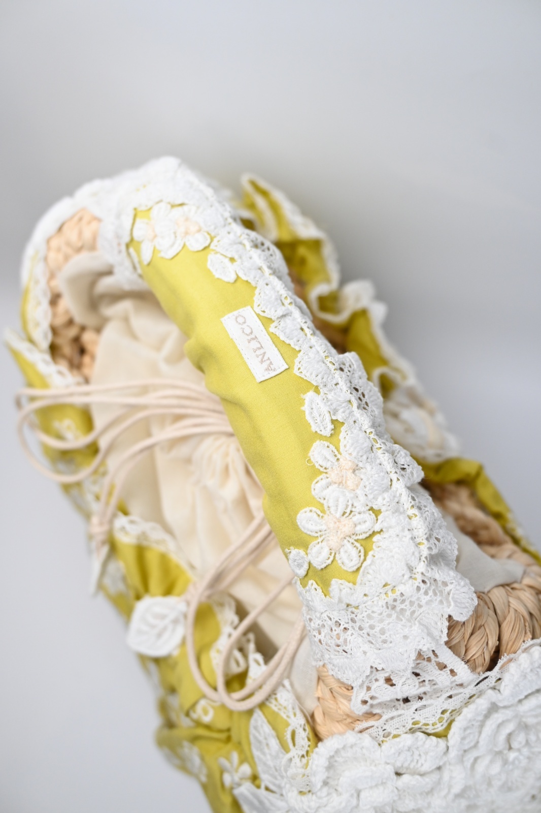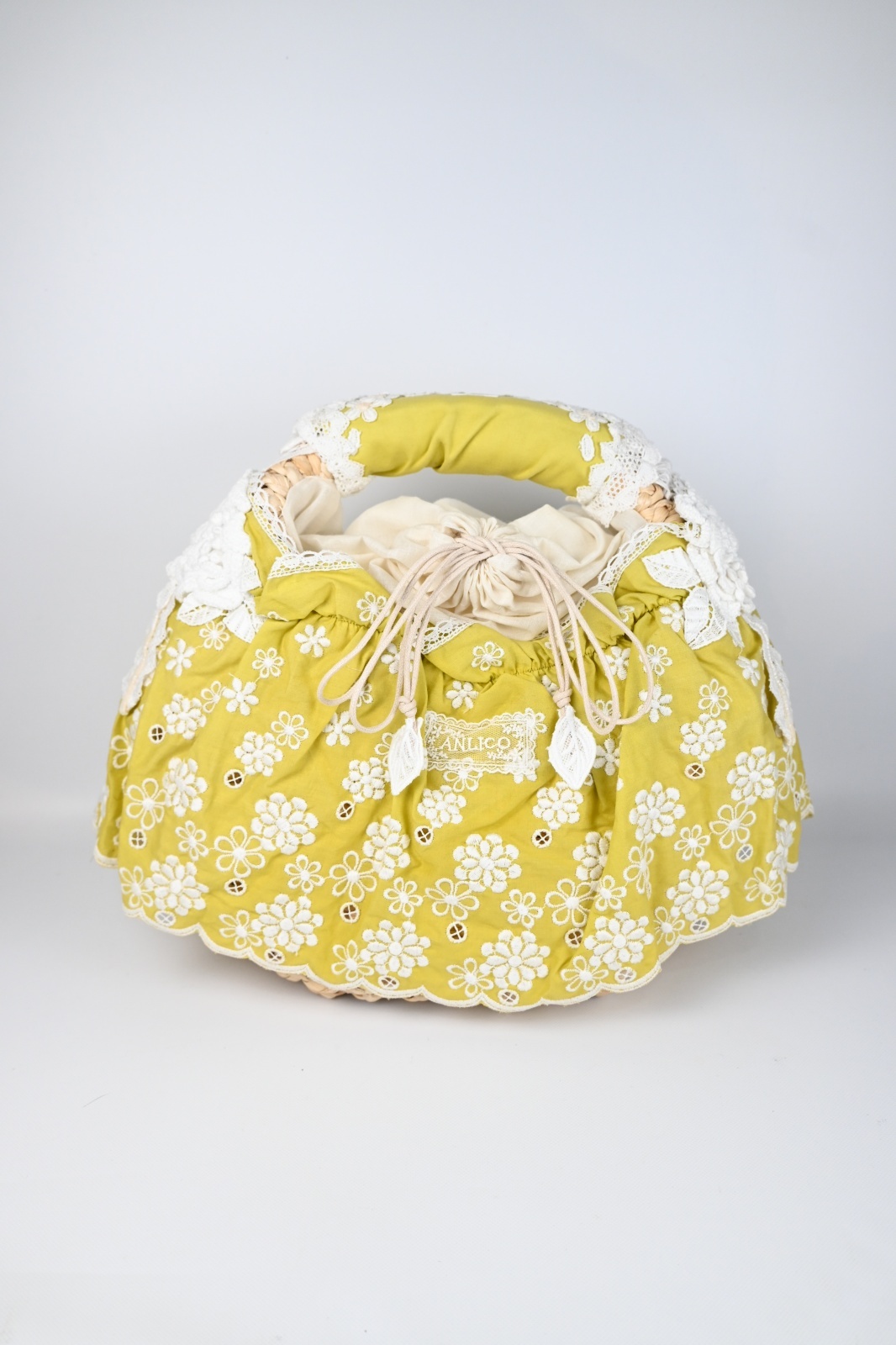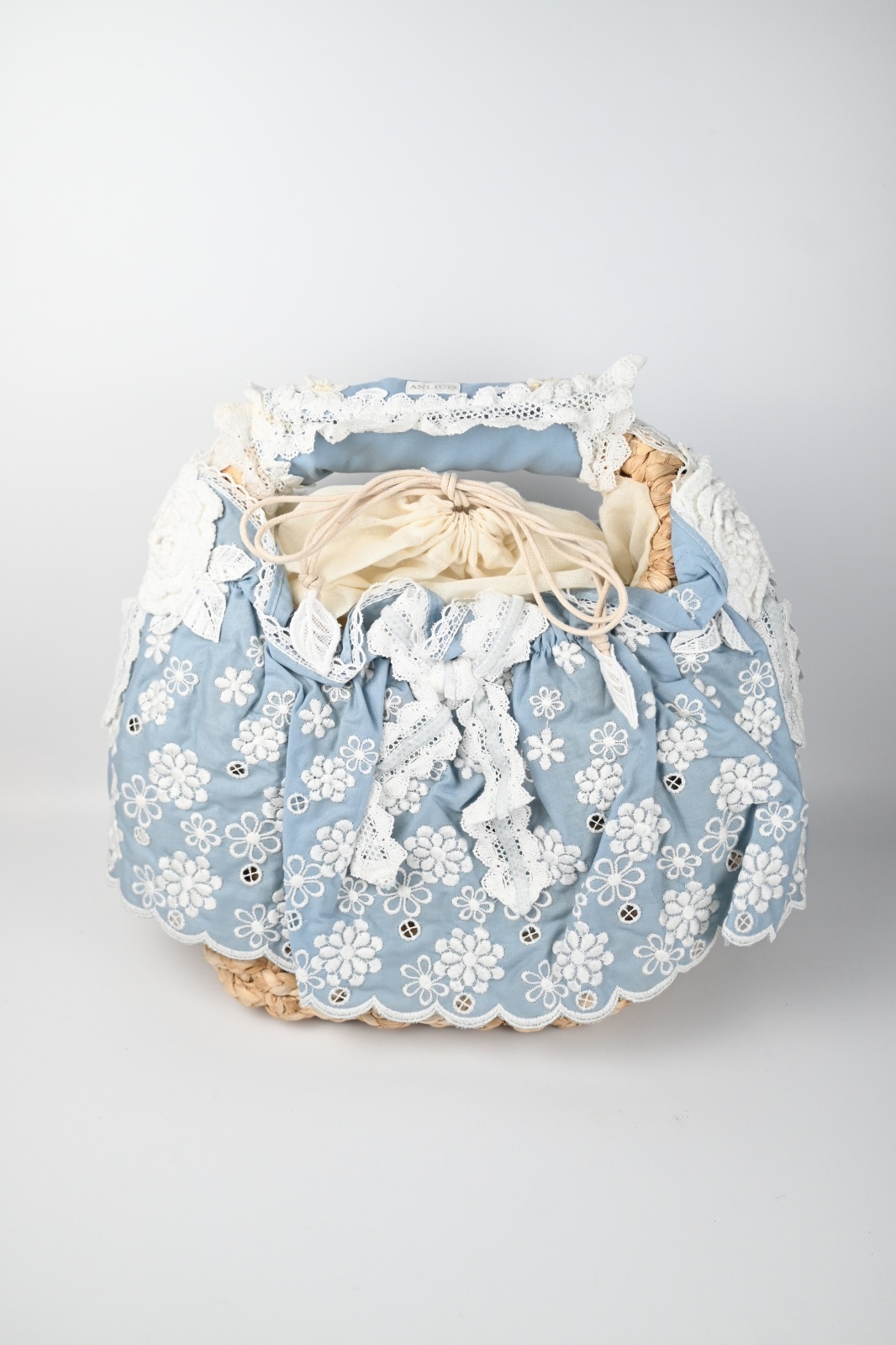 ANLICO(アンリコ)カゴバッグのご紹介です。フリルに覆われたコロンとしたカゴバッグ。小花レースがさりげなくモチーフされた可愛いカゴバッグです。/p>