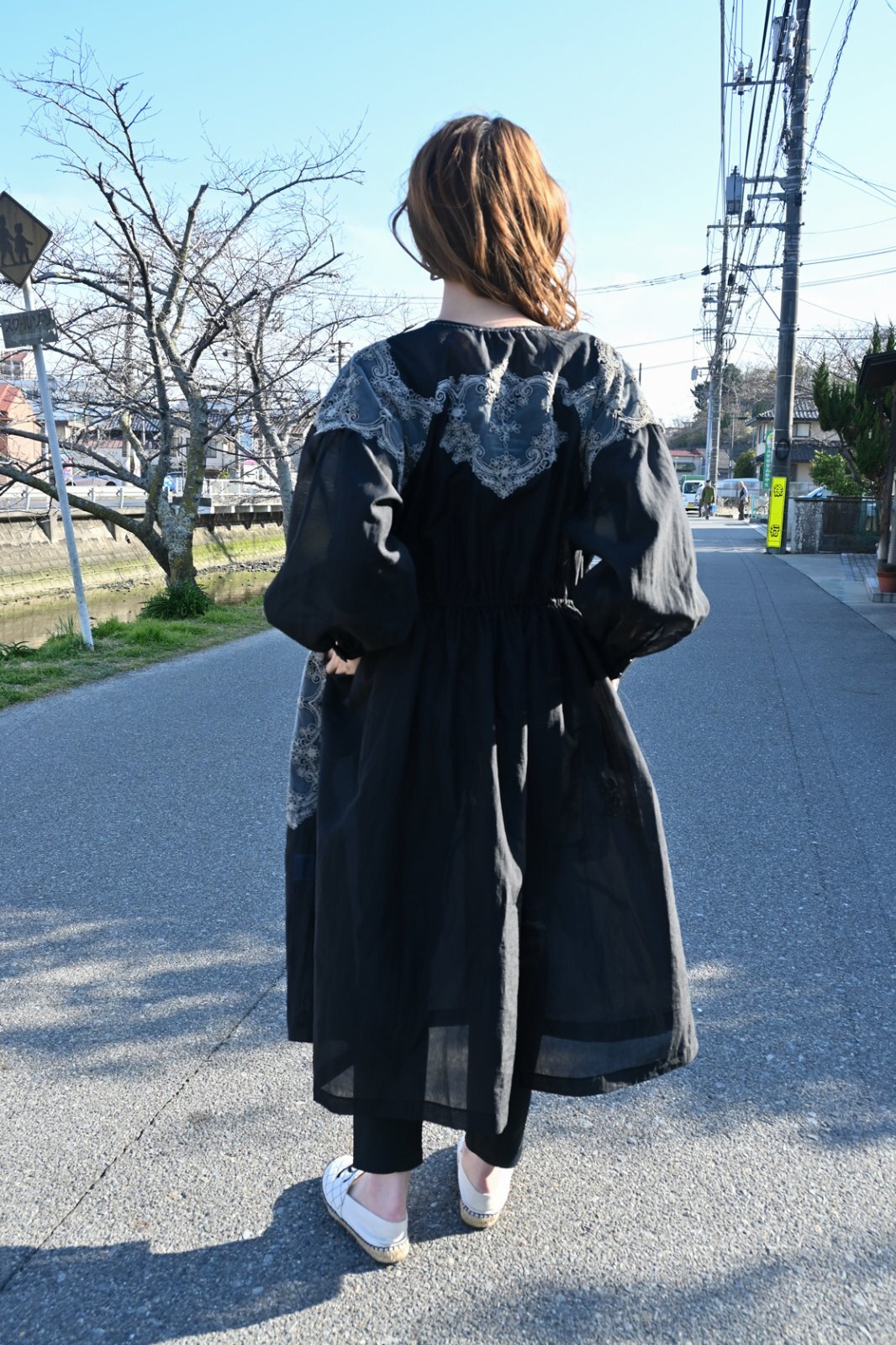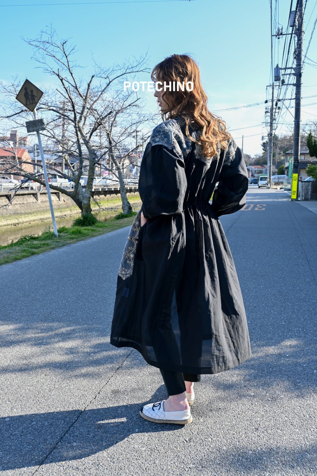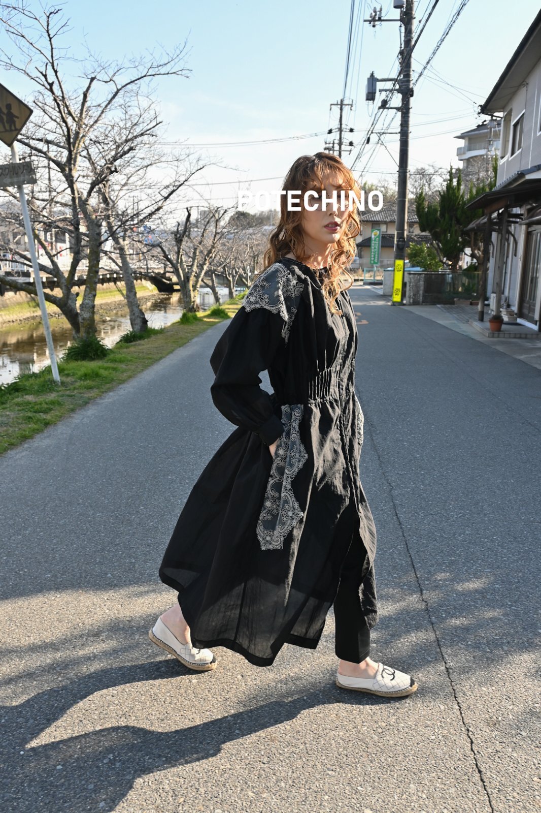 HISCHRONE(ヒスクローネ)半透明の撥水素材を使用して香水瓶のガラスのような透け感を表現しています。ポイントにコードチュールレースをあしらい繊細で華やかな印象に仕上げています。レディライクなワンピースのシルエットですが、袖をロールアップしてはおりとして日常のおしゃれに着ていただきたいです。