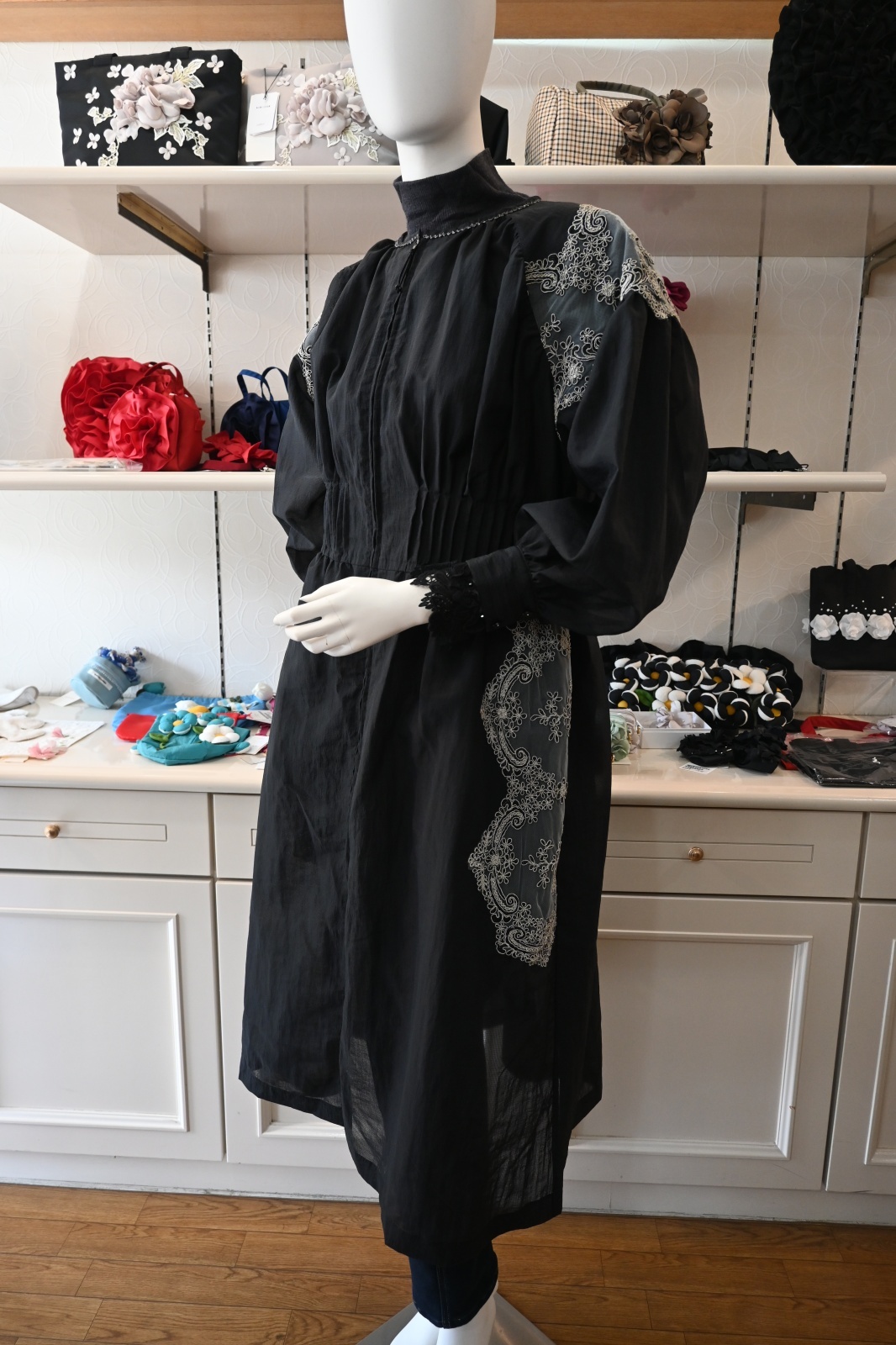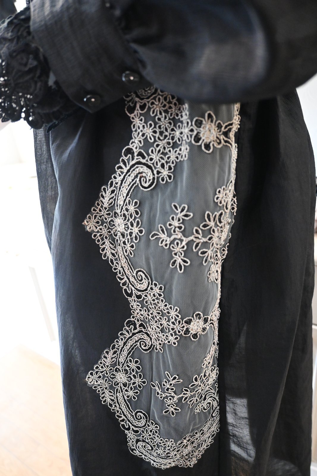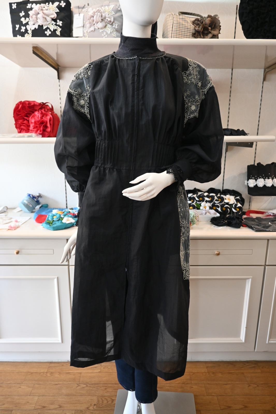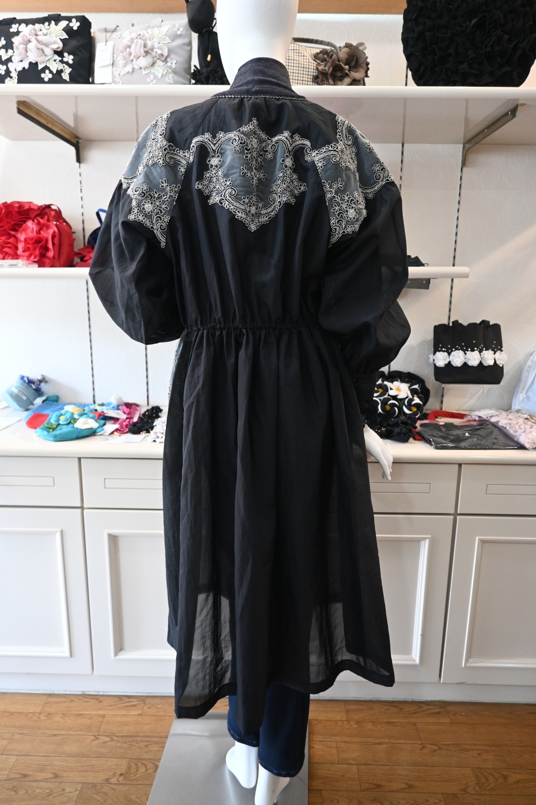 HISCHRONE(ヒスクローネ)半透明の撥水素材を使用して香水瓶のガラスのような透け感を表現しています。ポイントにコードチュールレースをあしらい繊細で華やかな印象に仕上げています。レディライクなワンピースのシルエットですが、袖をロールアップしてはおりとして日常のおしゃれに着ていただきたいです。