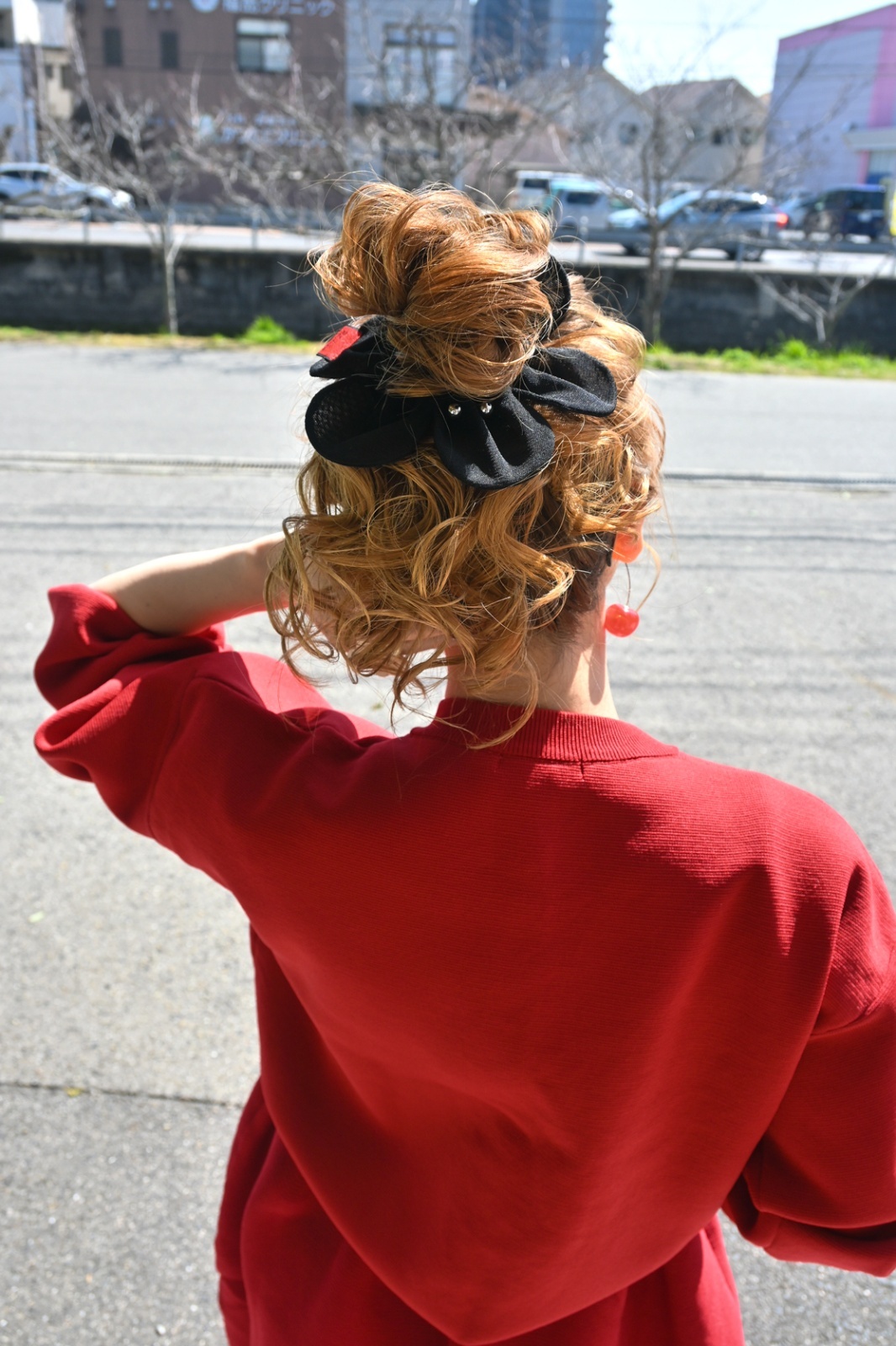 POTECHINO(ポテチーノ)キュートなSINGモチーフのシュシュ。髪を結んだ後に被せるように使うタイプです。Mはポニーテール、Lはお団子ヘアーに。バッグの持ち手や手首など色々な使い方で楽しんでください。