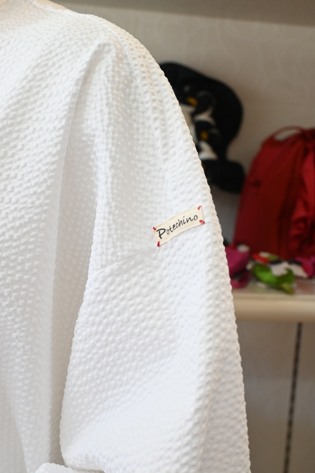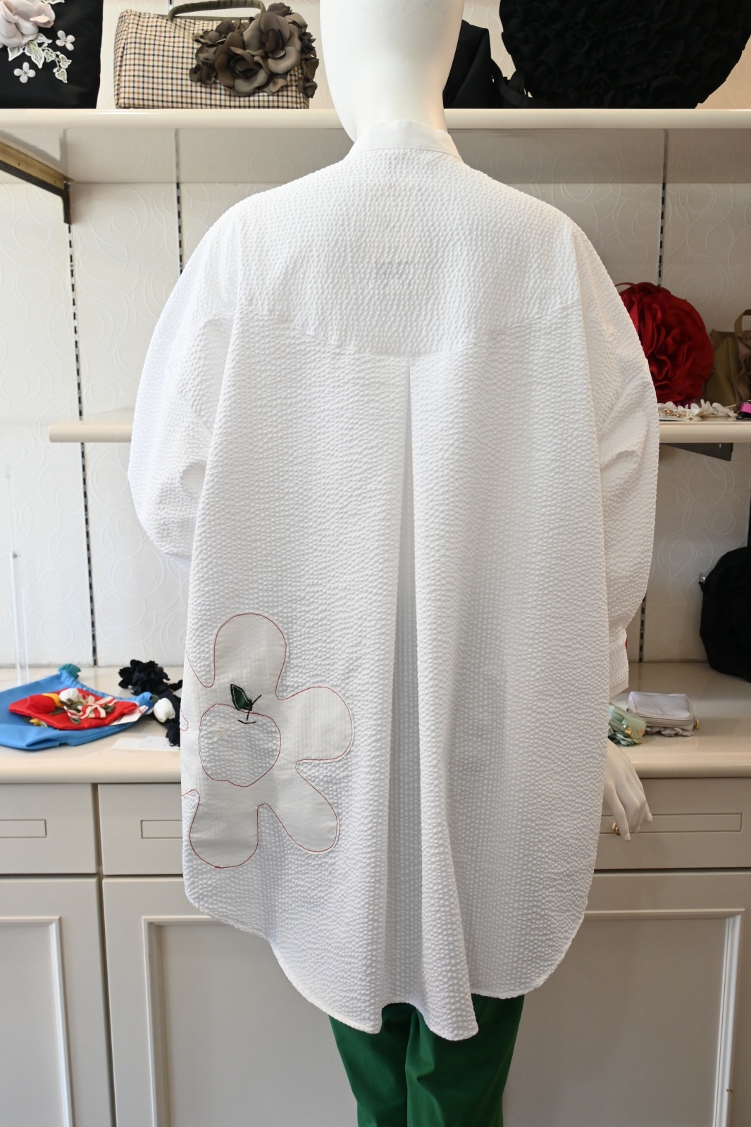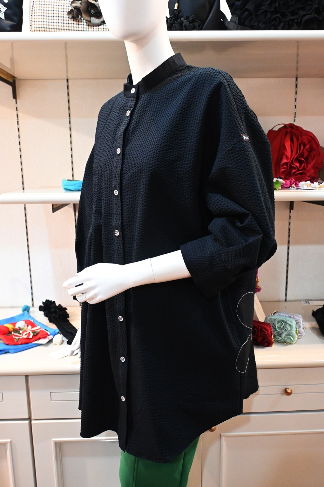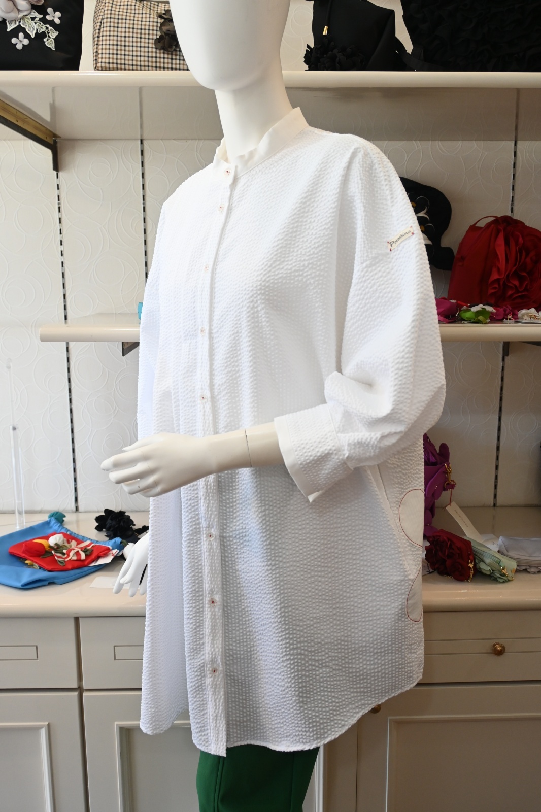 POTECHINO(ポテチーノ)羽織としても着用して頂けるワンサイズシャツ。袖口のパターンに変化を付け体系を選ばないサイズ感で作りました。右身頃にタックを付けておりデザインが出るようにしているのもポイントです。