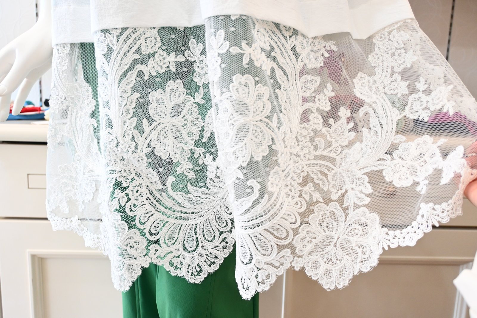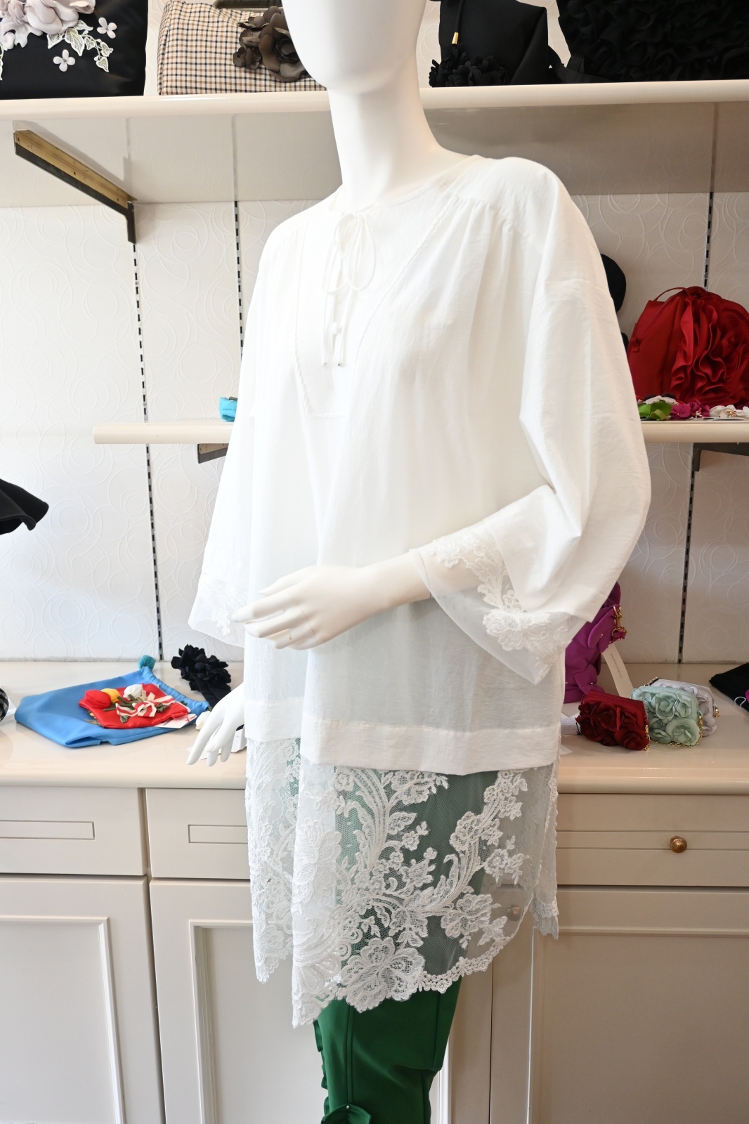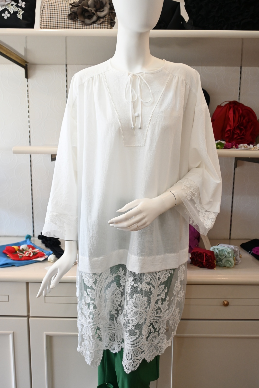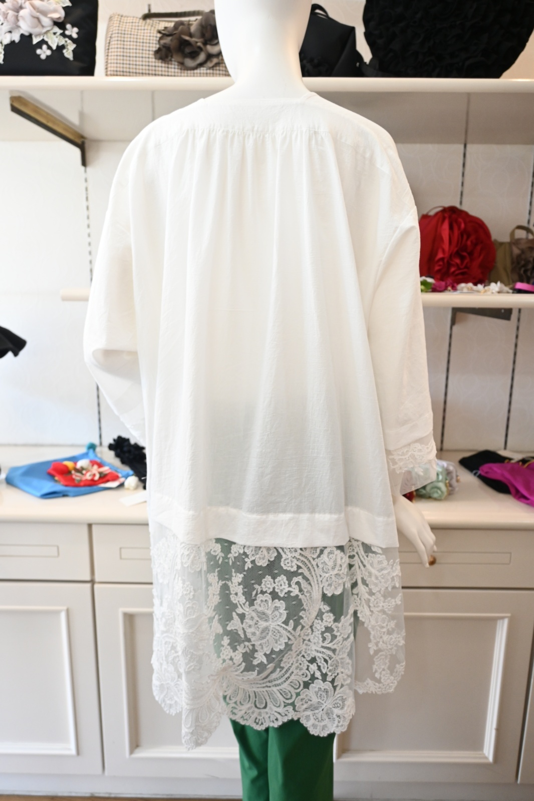HISCHRONE(ヒスクローネ)教会で祝祭のひと時を思わせるチャーチブラウスです。袖口や裾の透かしはステンドグラスの光のように清らかで華やかな雰囲気です。y