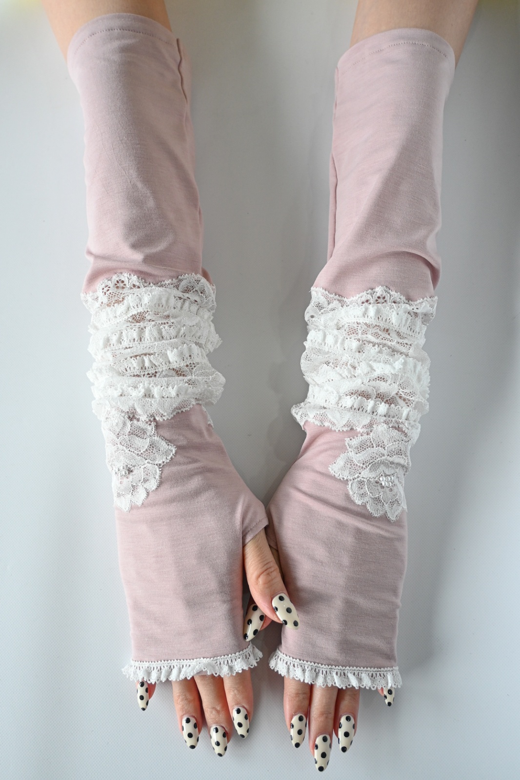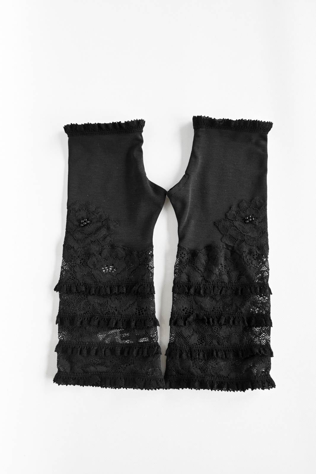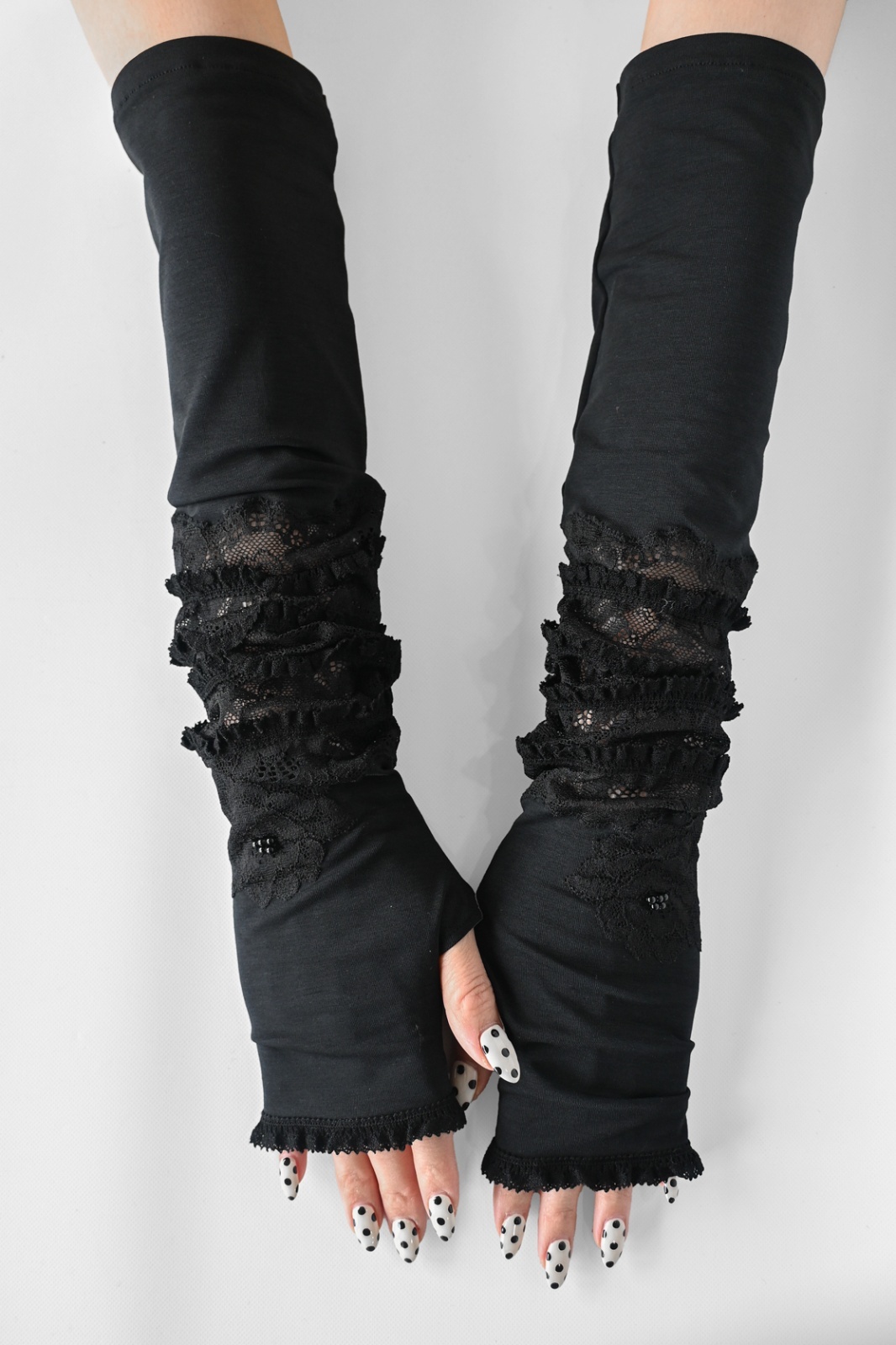 NAPATA MELLOE(ナパータメロエ)レースにフリルをあしらった日よけ用の手袋です。接触冷感 UV加工を施した生地を使用しております。夏の日差し対策に心強いアイテムです。