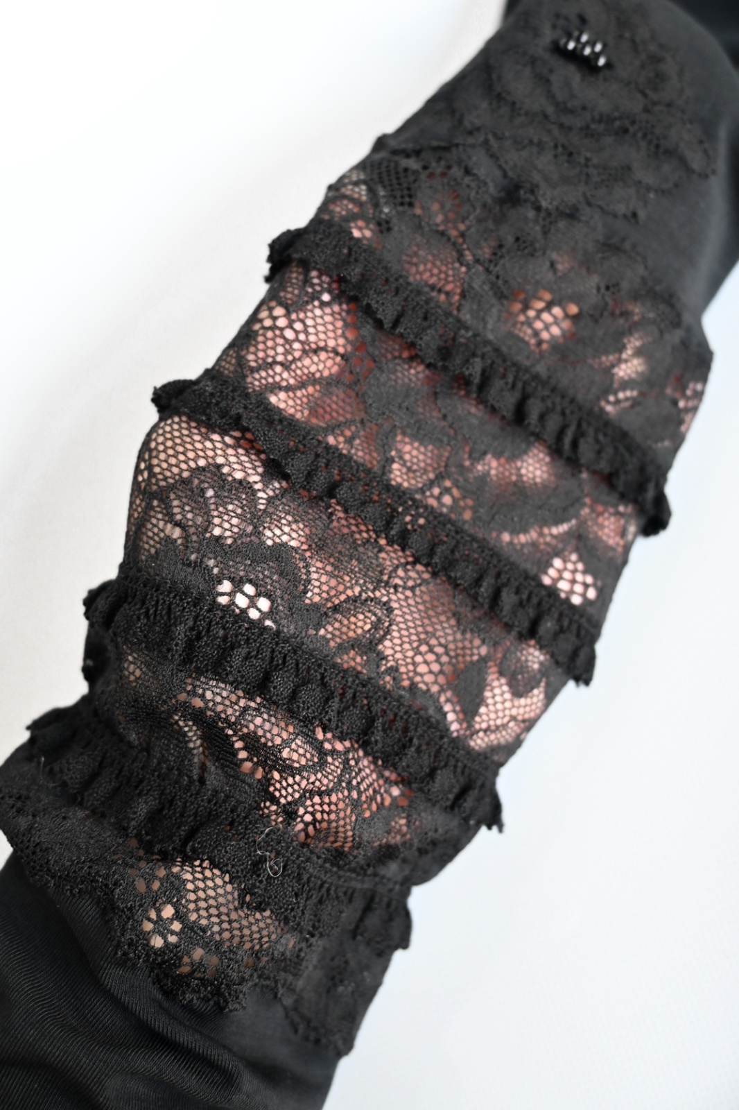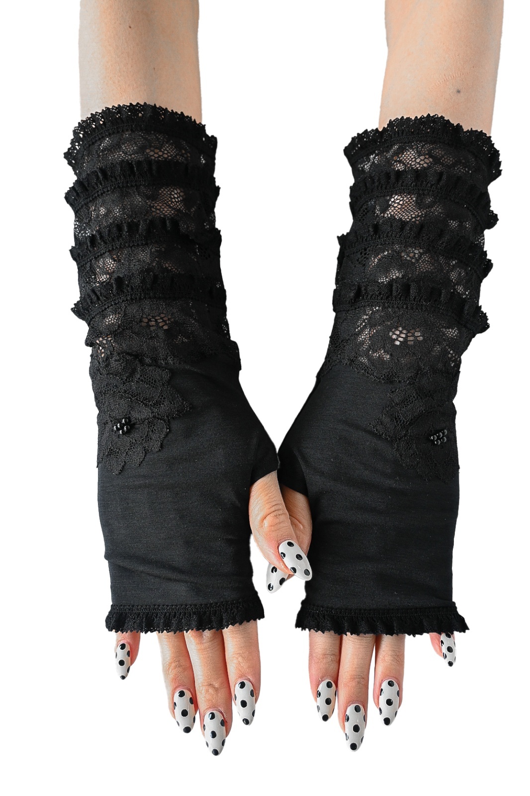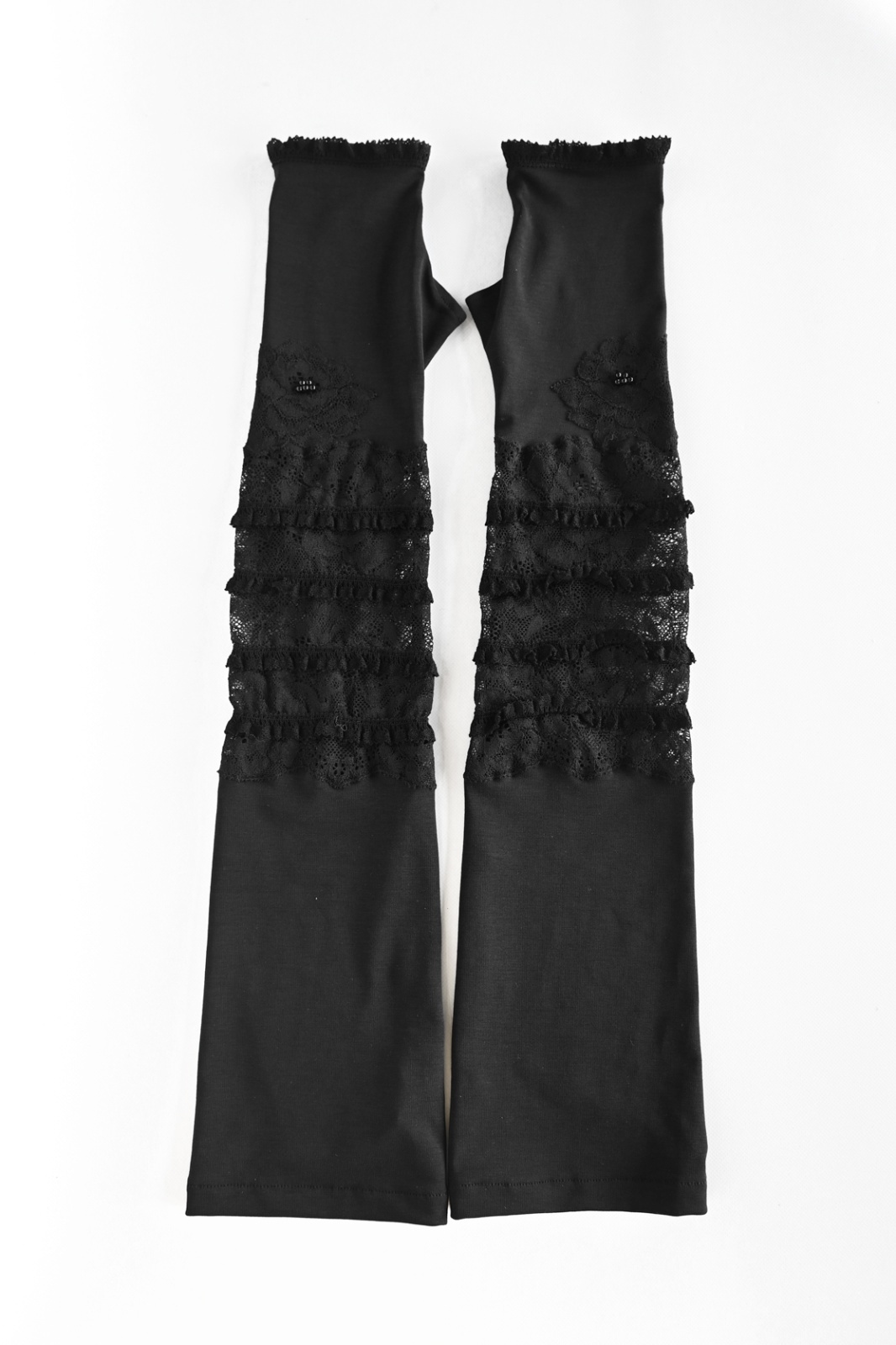 NAPATA MELLOE(ナパータメロエ)レースにフリルをあしらった日よけ用の手袋です。接触冷感 UV加工を施した生地を使用しております。夏の日差し対策に心強いアイテムです。