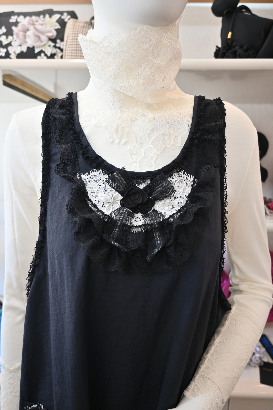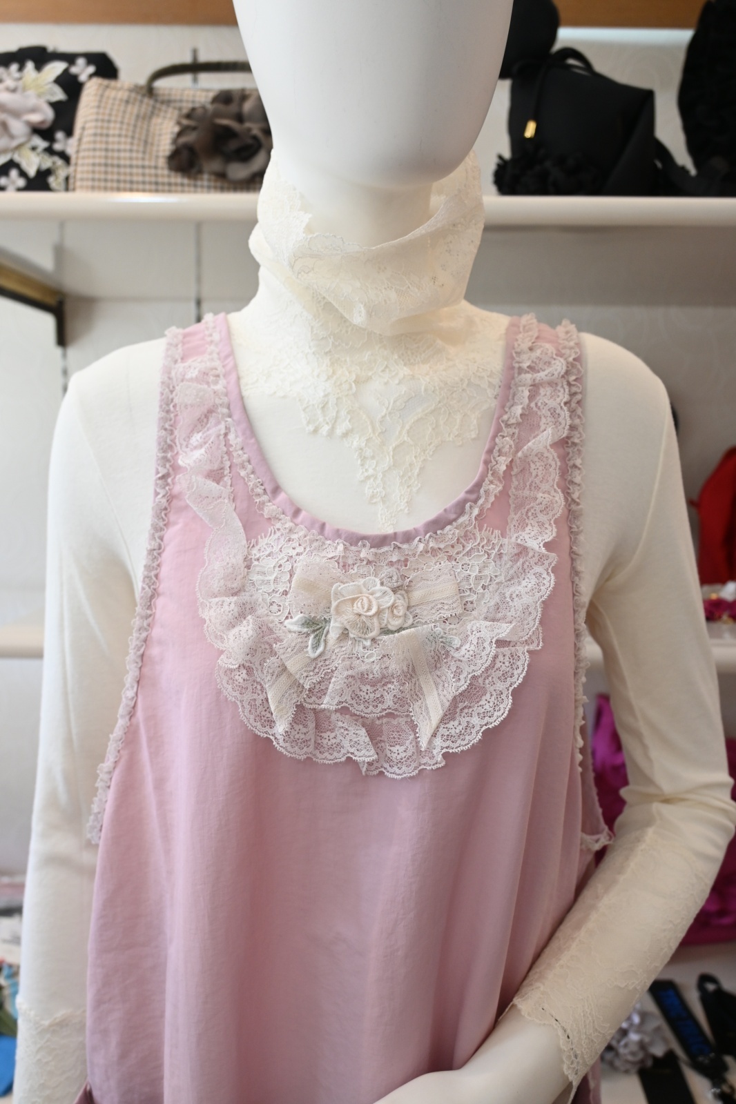 HISCHRONE(ヒスクローネ)レースとマキバラが柔らかく華やぐ後ろドットボタン付きの実用的ナイロンエプロンです。