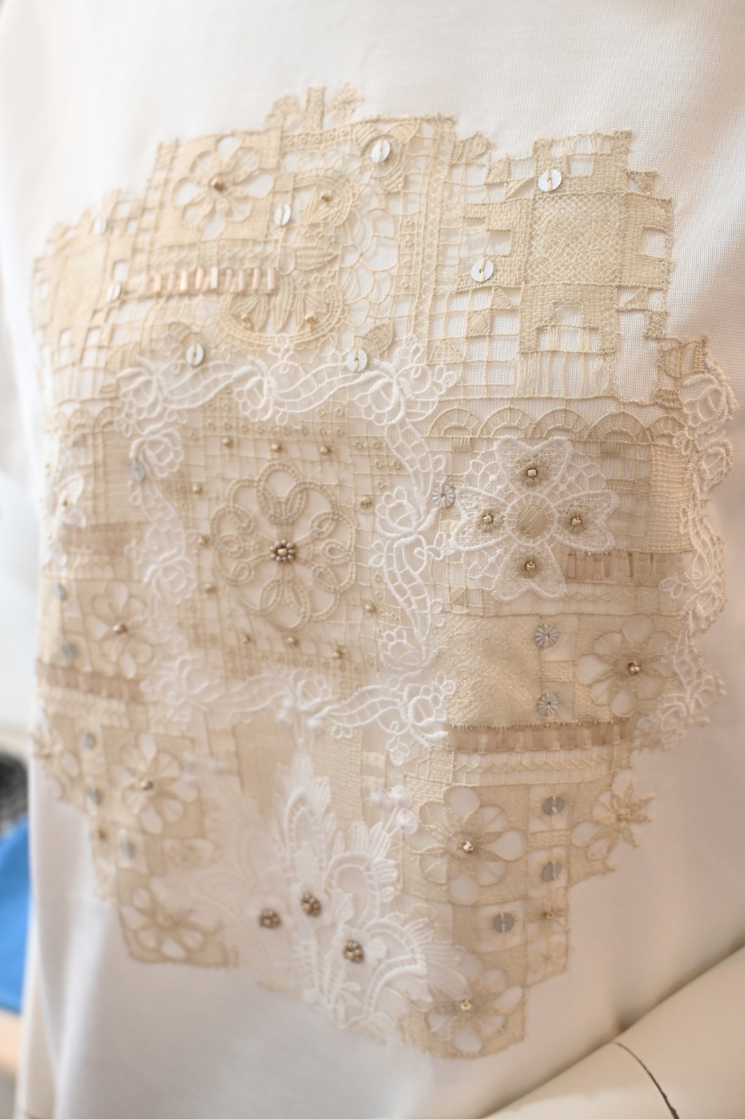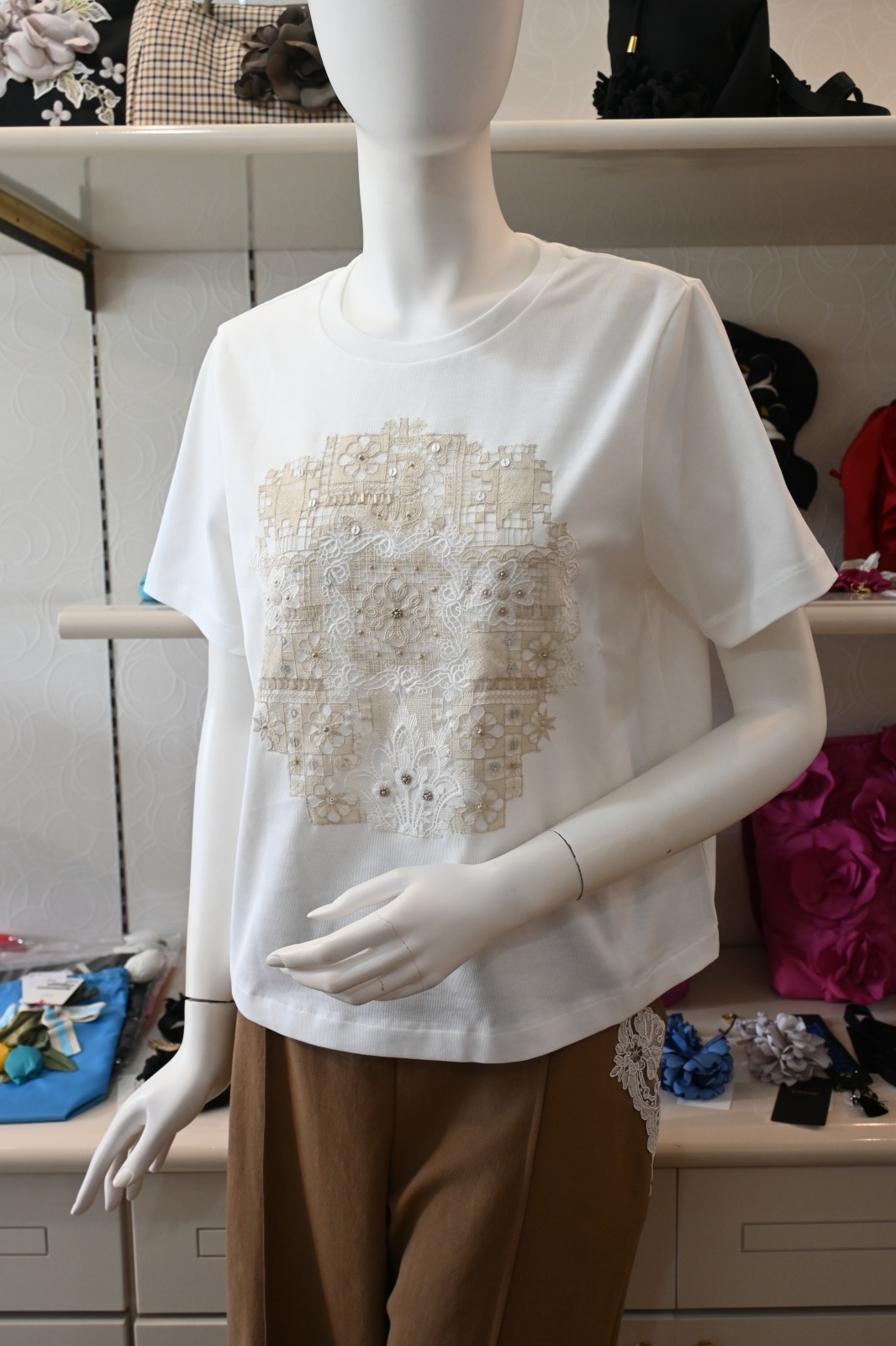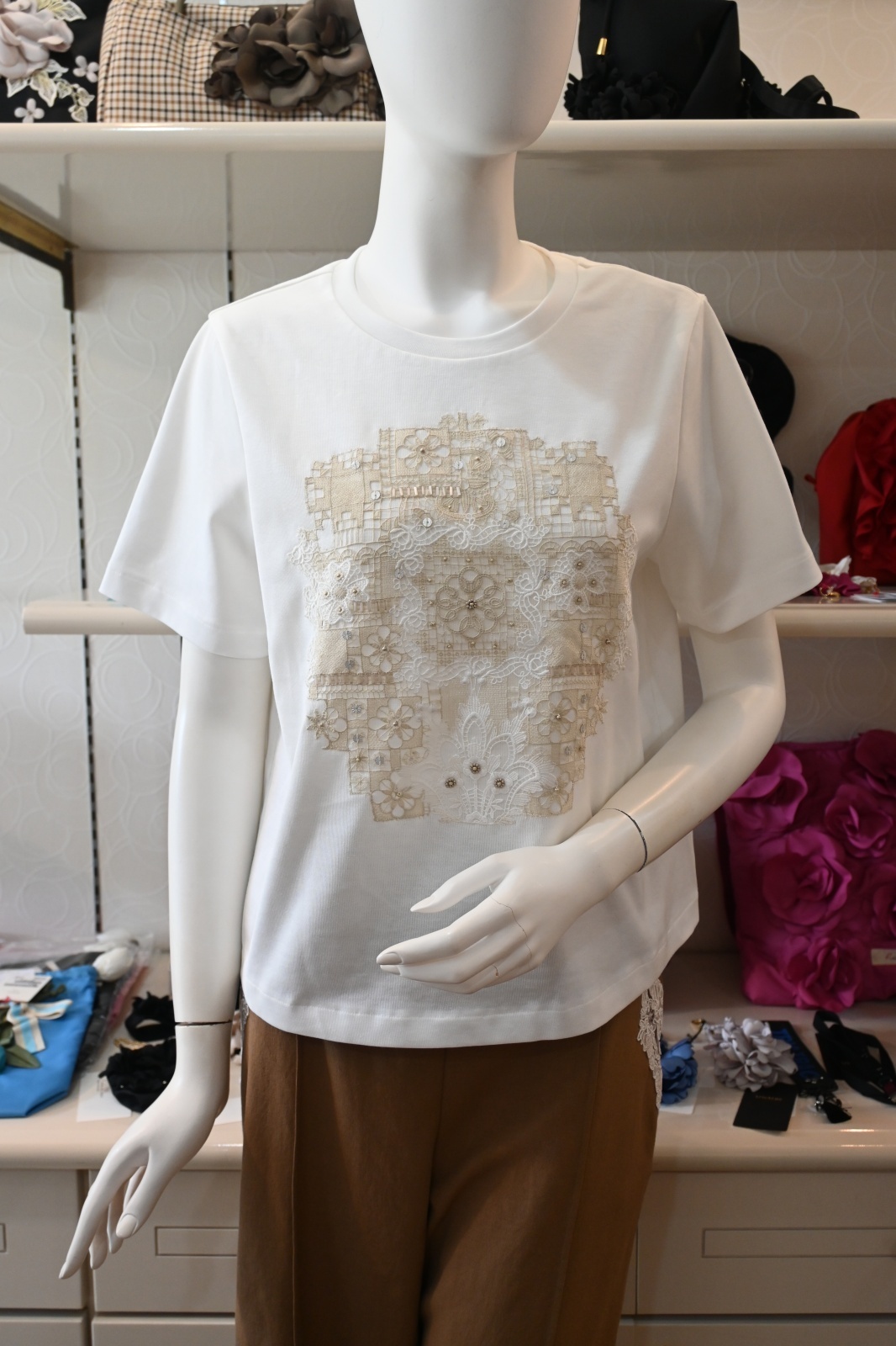 CAETLA(さえら)サンホーキン綿のフライス生地、半袖Tシャツになります。中央にカットワークレースをあしらいコンパクトなシルエットと短め丈で軽やかなバランスに仕上げています。レースの柄に数種類のビーズをあしらって落ち着いた光沢をプラスしています。